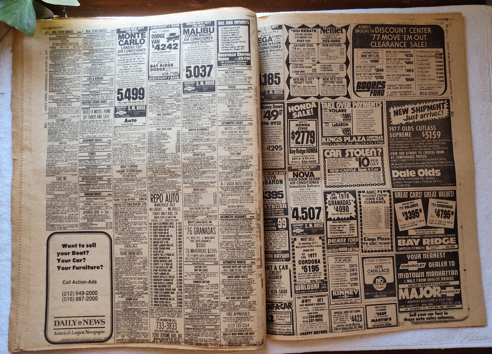 - A classified ad for car rentals for $10 per day – ‘Car Stolen?’