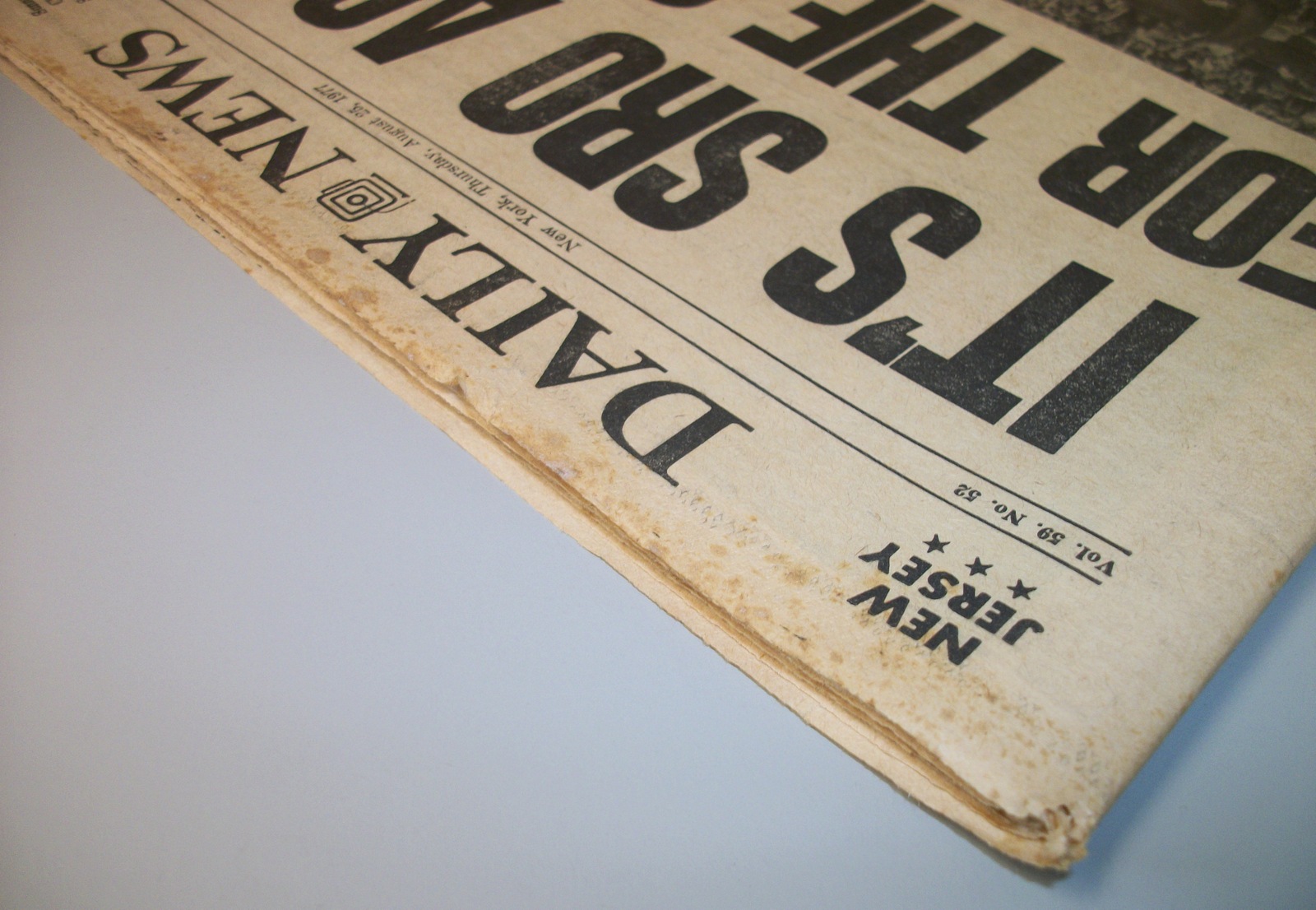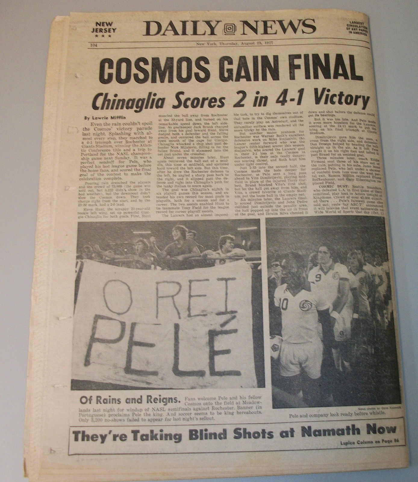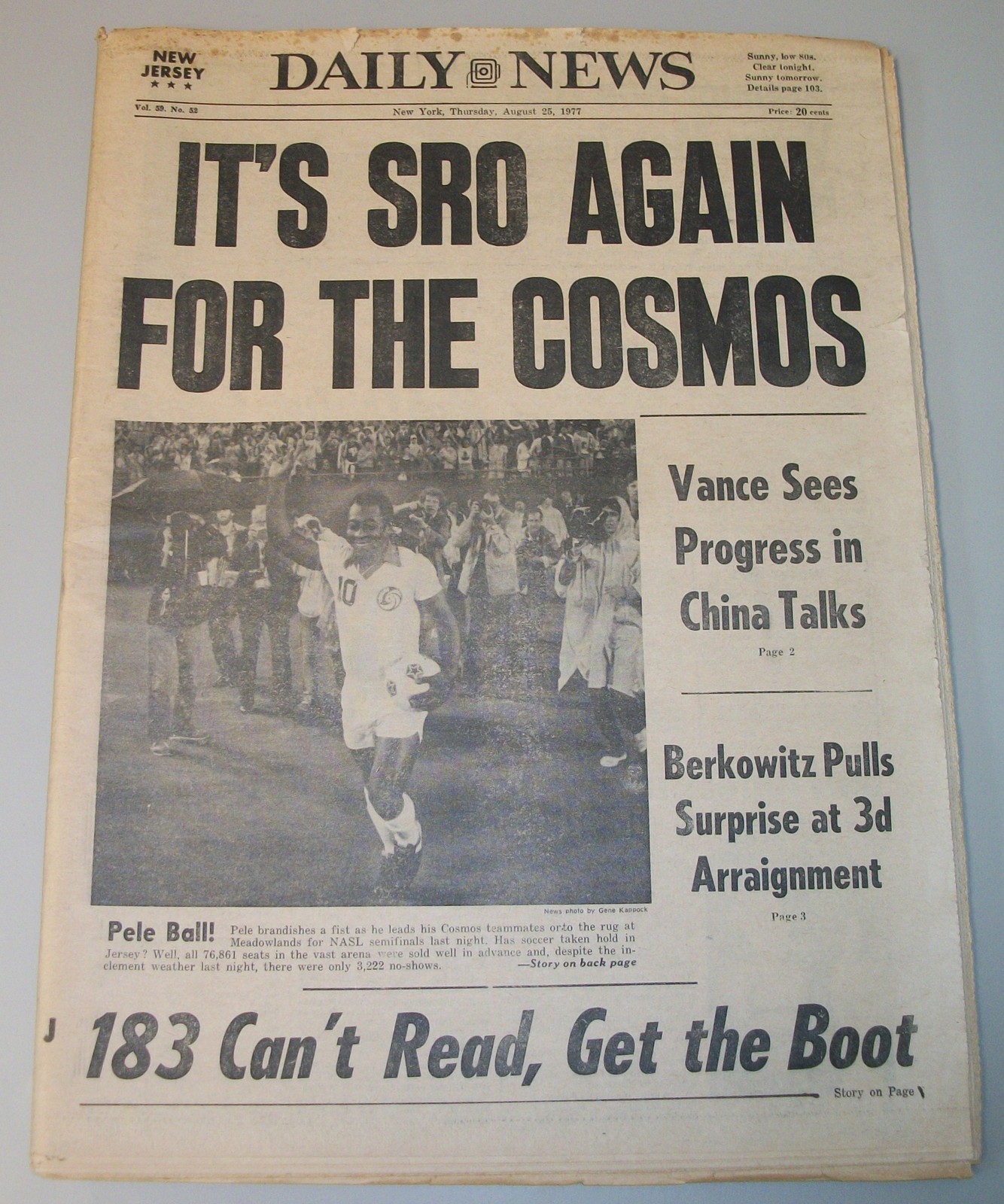 New York Daily News – Thursday, August 25, 1977. This old newspaper features on the front page a picture of soccer star Pele coverage of Son of Sam Killer David Berkowitz: ‘Berkowitz Pulls Surprise at 3d Arraingment. What you see in the pictures is what you get.
