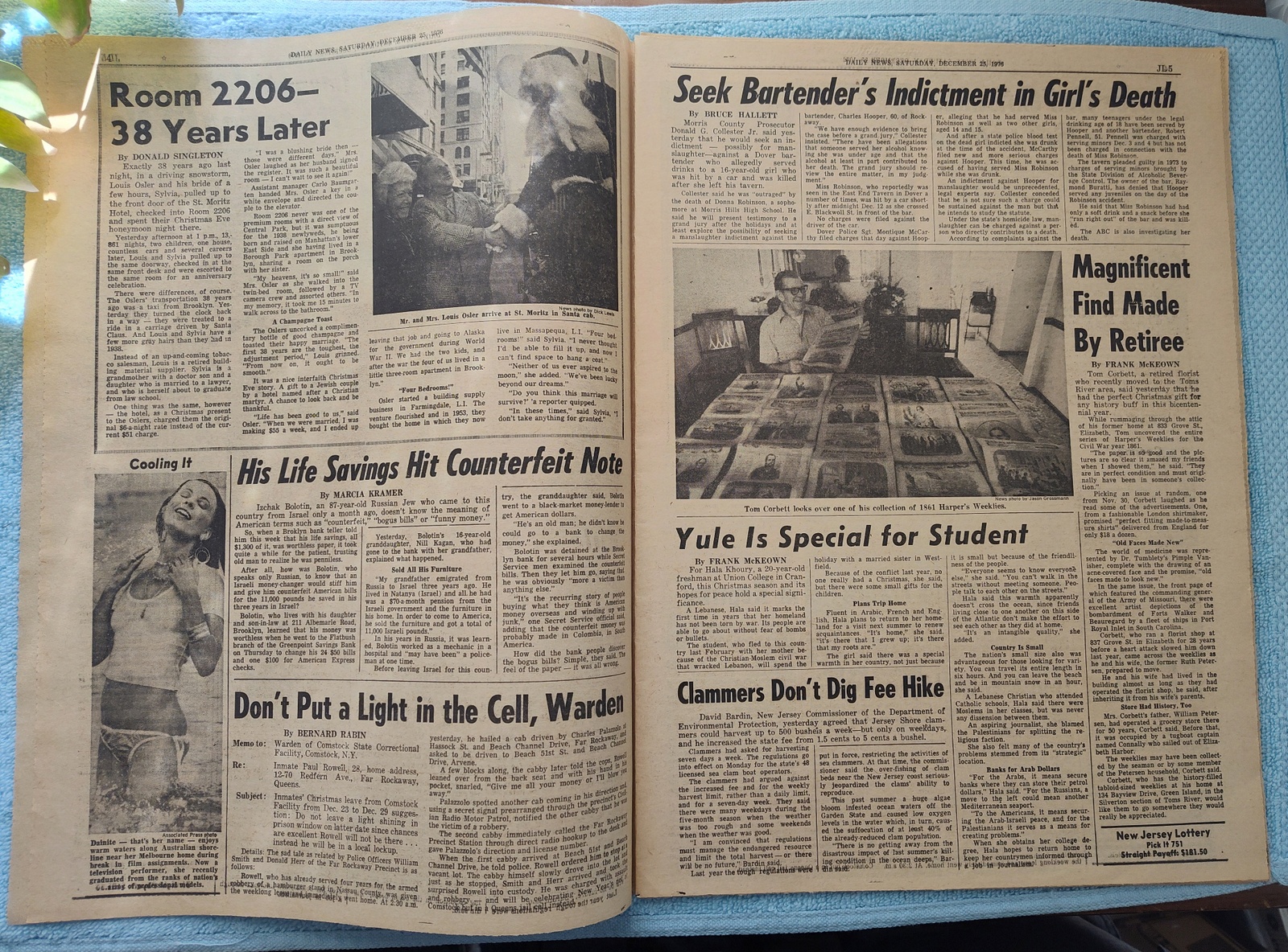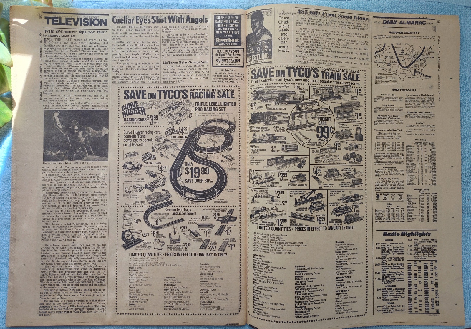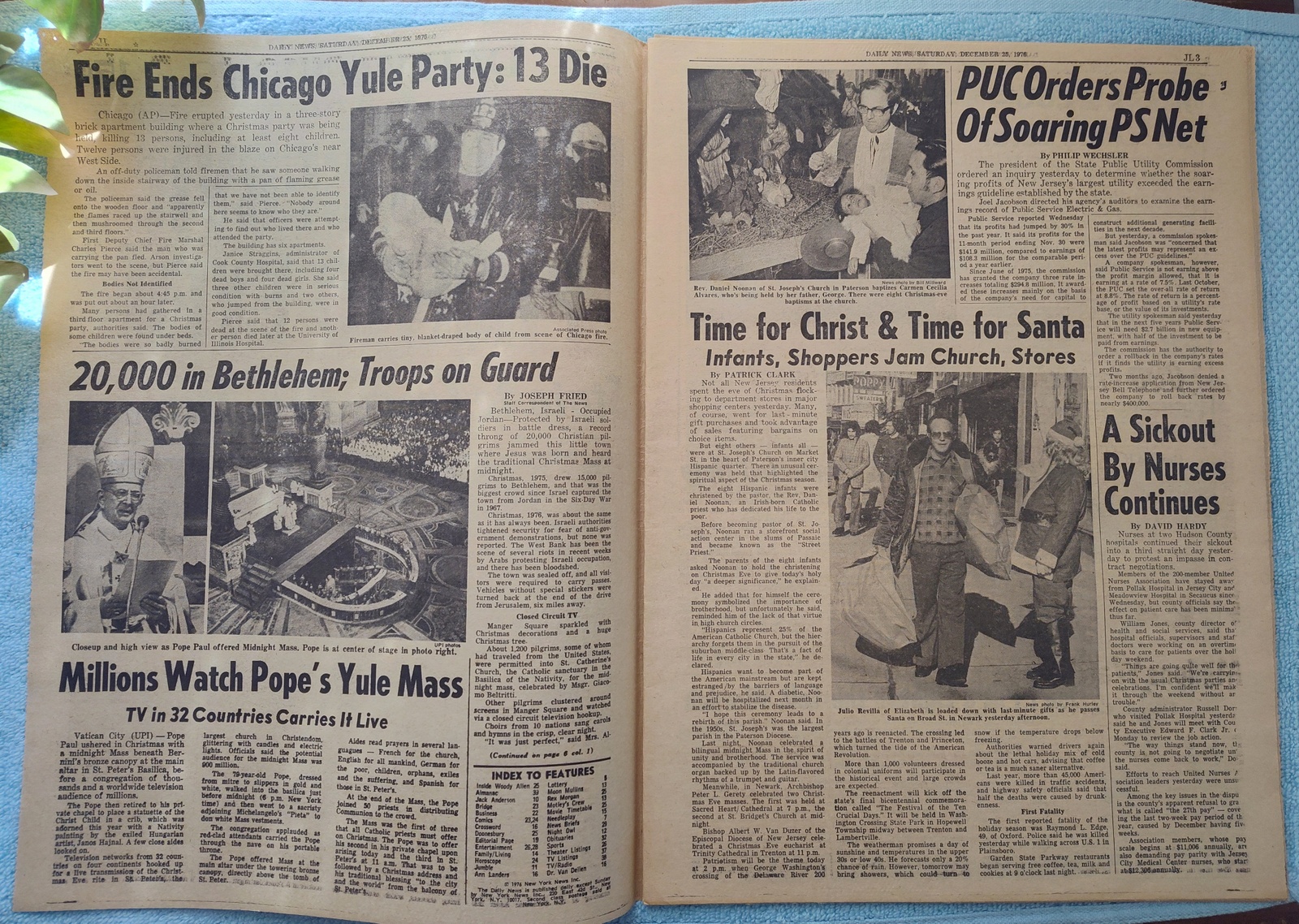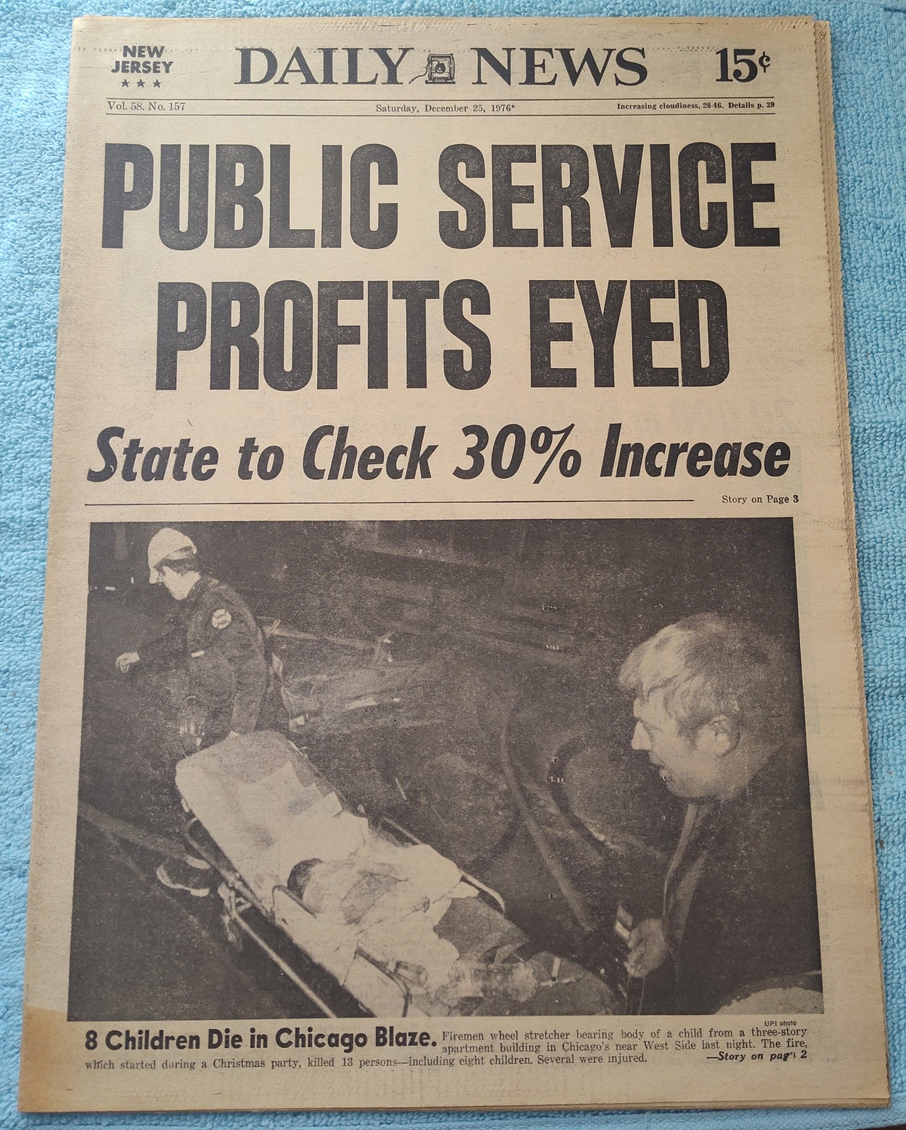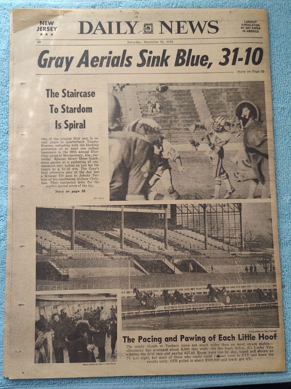 New York Daily News (New Jersey Edition) – Saturday, December 25, 1976. This old newspaper features on the front page a picture of a child on a stretcher from a fire at a Christmas party which killed 13, including 8 children. The headline is: ‘Public Service Profits Eyed’ and ‘State to Check 30% Increase’ – The back page features pictures of Tommy Kramer throwing the football during the Blue-Gray college all-star game and empty grandstands at the horse races at Yonkers. What you see in the pictures is what you get.