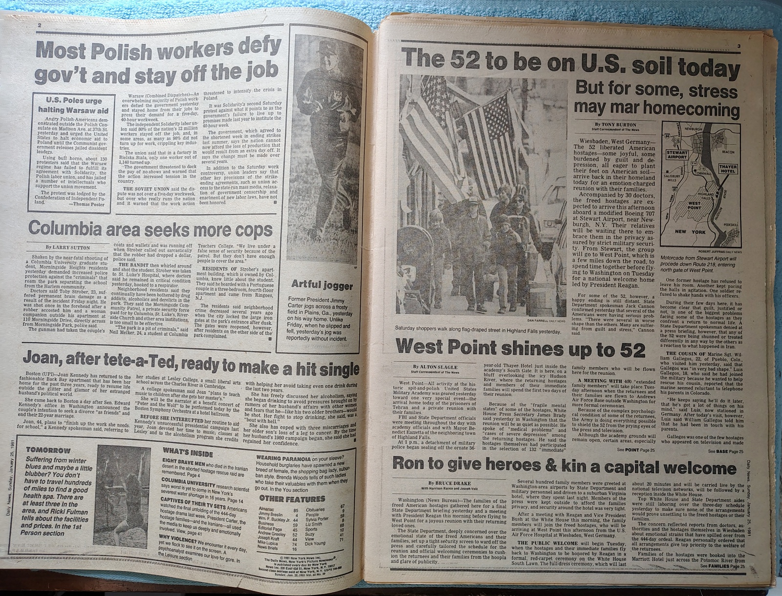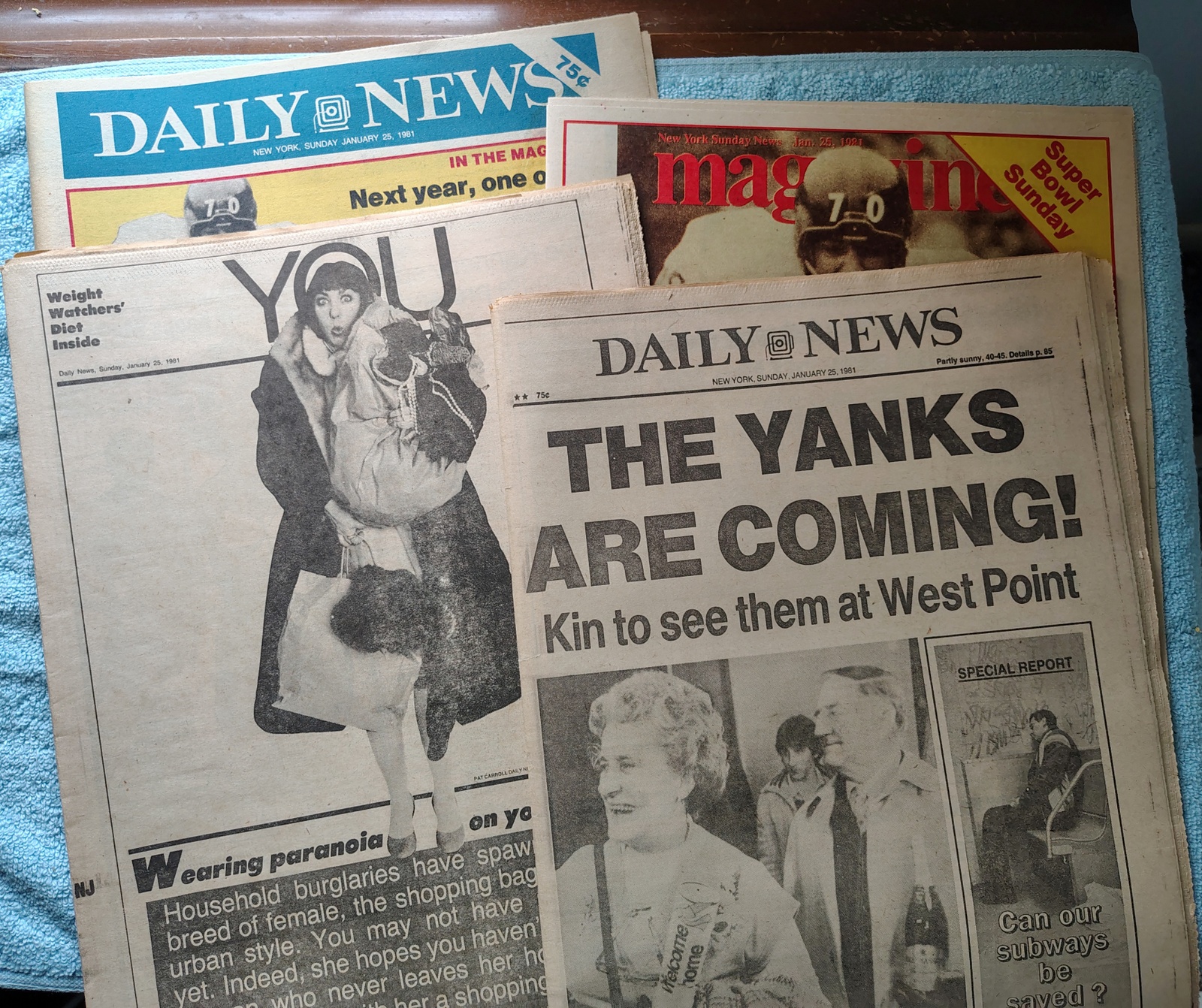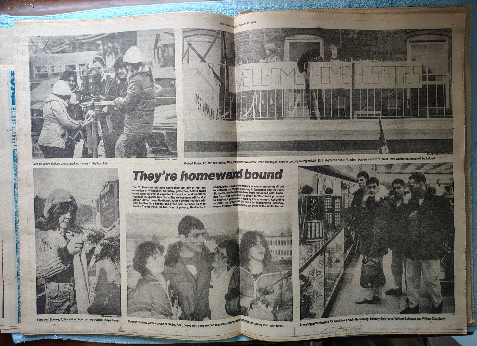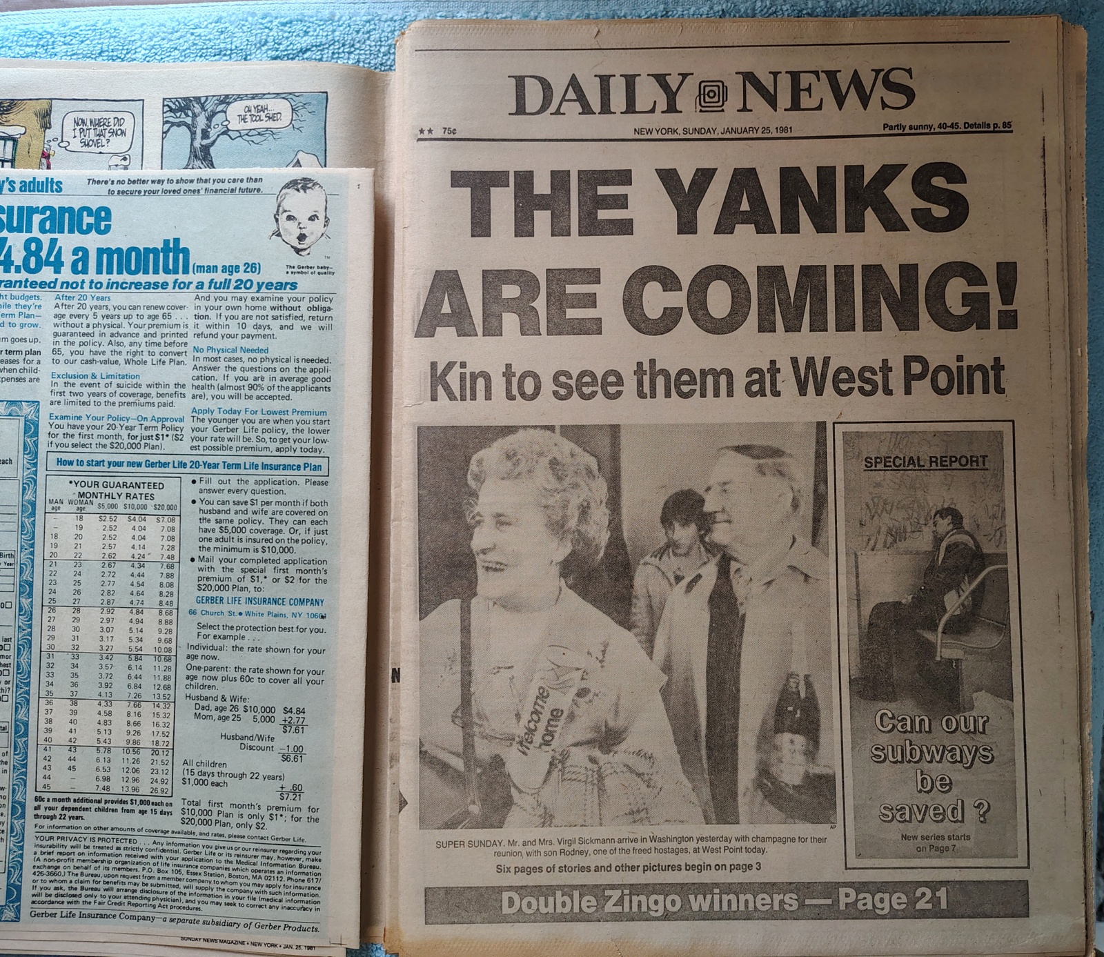 New York Daily News – Sunday, January 25, 1981. The headline is: ‘The Yanks Are Coming!’ and ‘Kin to see them at West Point’ The front page features a picture of Mr. & Mrs Virgil Sickmann arriving in Washington to see their son Rodney, one of the freed hostages. What you see in the pictures is what you get.