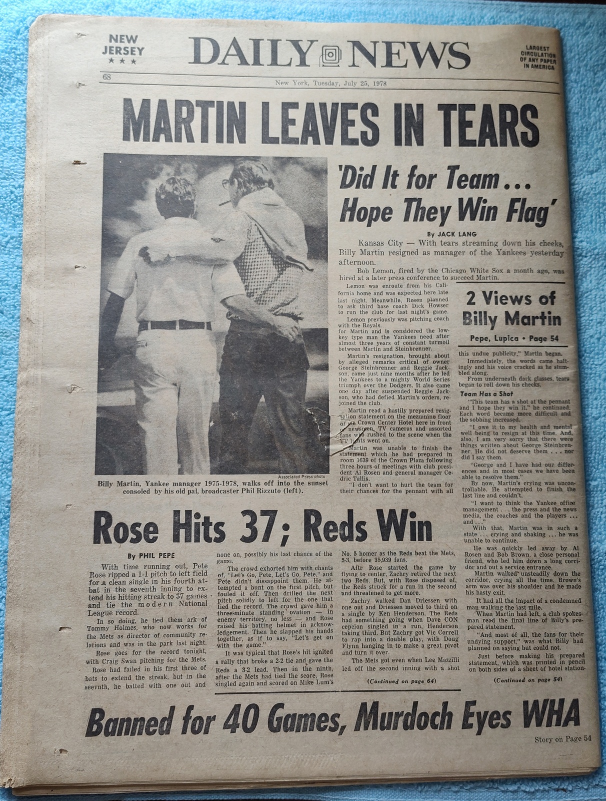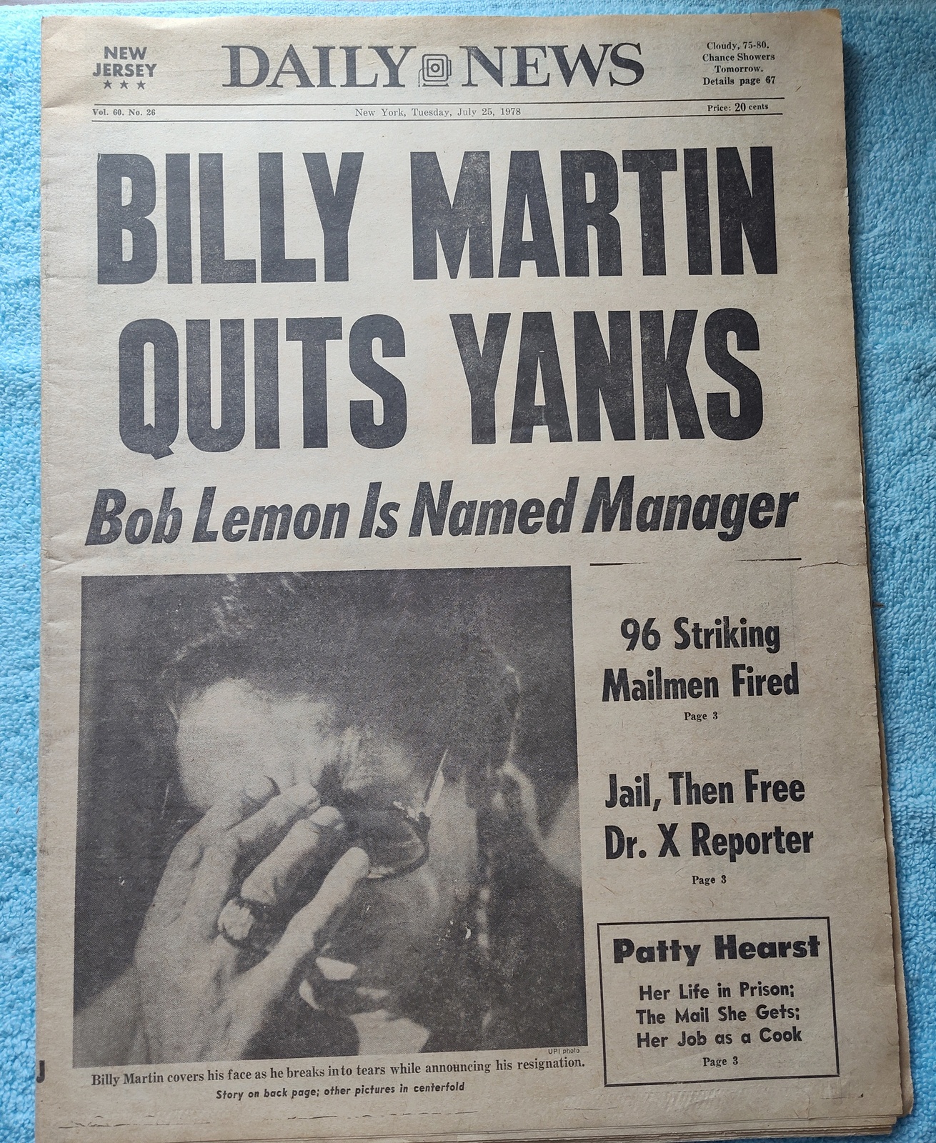 New York Daily News (New Jersey Edition) – Tuesday, July 25, 1978. This old newspaper features on the front page a picture of recently resigned Manager of the New York Yankees – Billy Martin. The headline is: ‘Billy Martin Quits Yanks’ and ‘Bob Lemon Is Named Manager’ – What you see in the pictures is what you get.