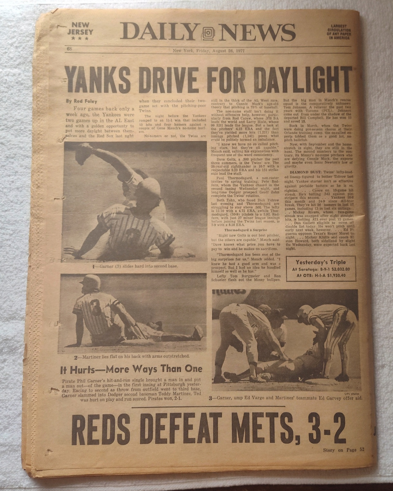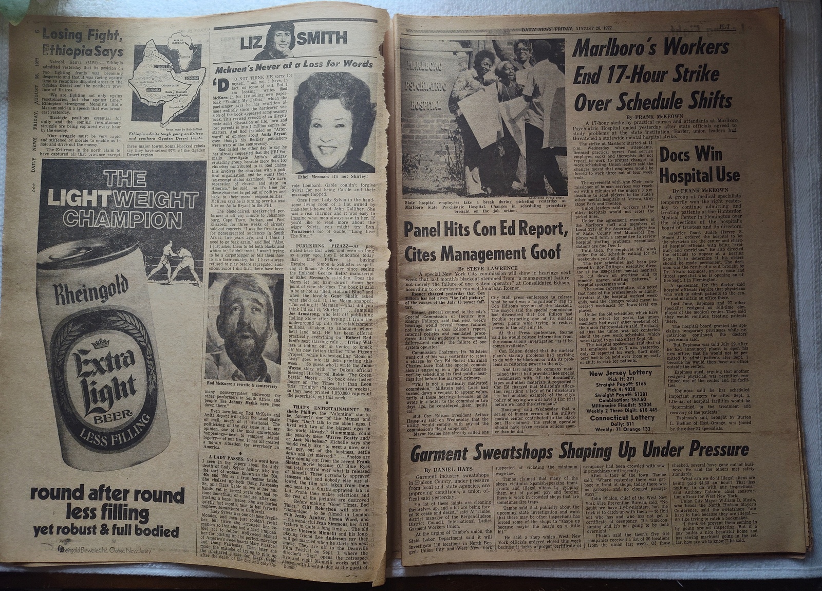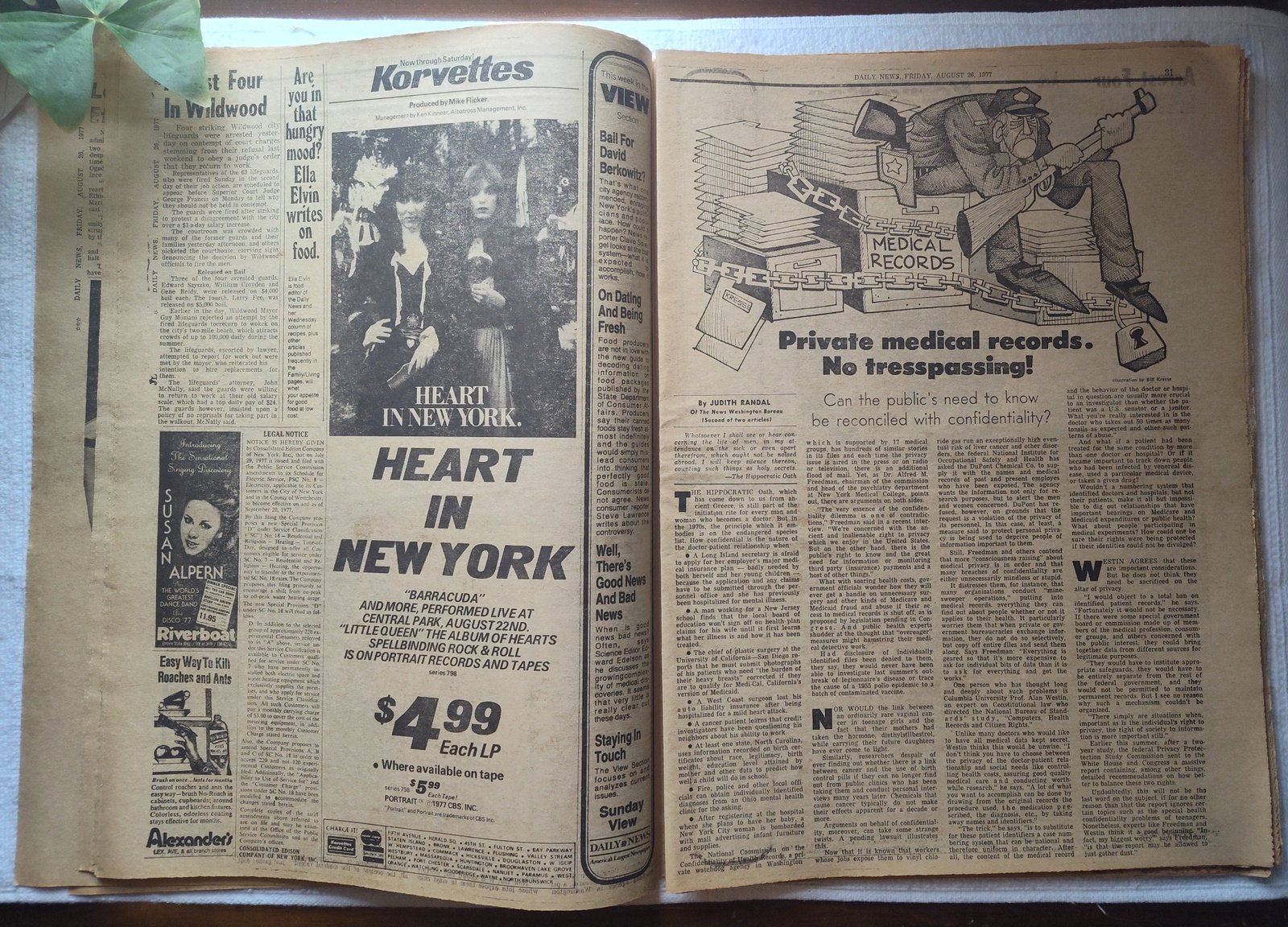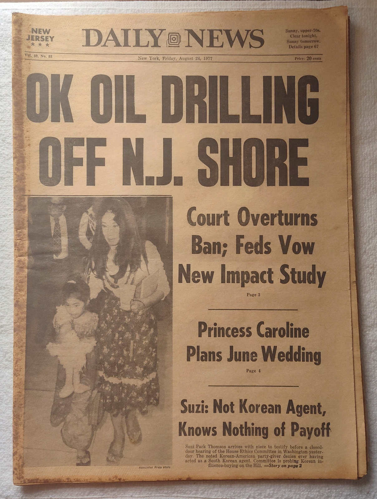 New York Daily News (New Jersey Edition) – Friday, August 26, 1977. This old newspaper features on the front page a picture of Suzi Park Thompson with niece arriving to testify before the House Ethics Committee in Washington. The headline is: ‘OK Oil Drilling Off N.J. Shore’ and ‘Court Overturns Ban; Feds Vow New Impact Study’ What you see in the pictures is what you get.