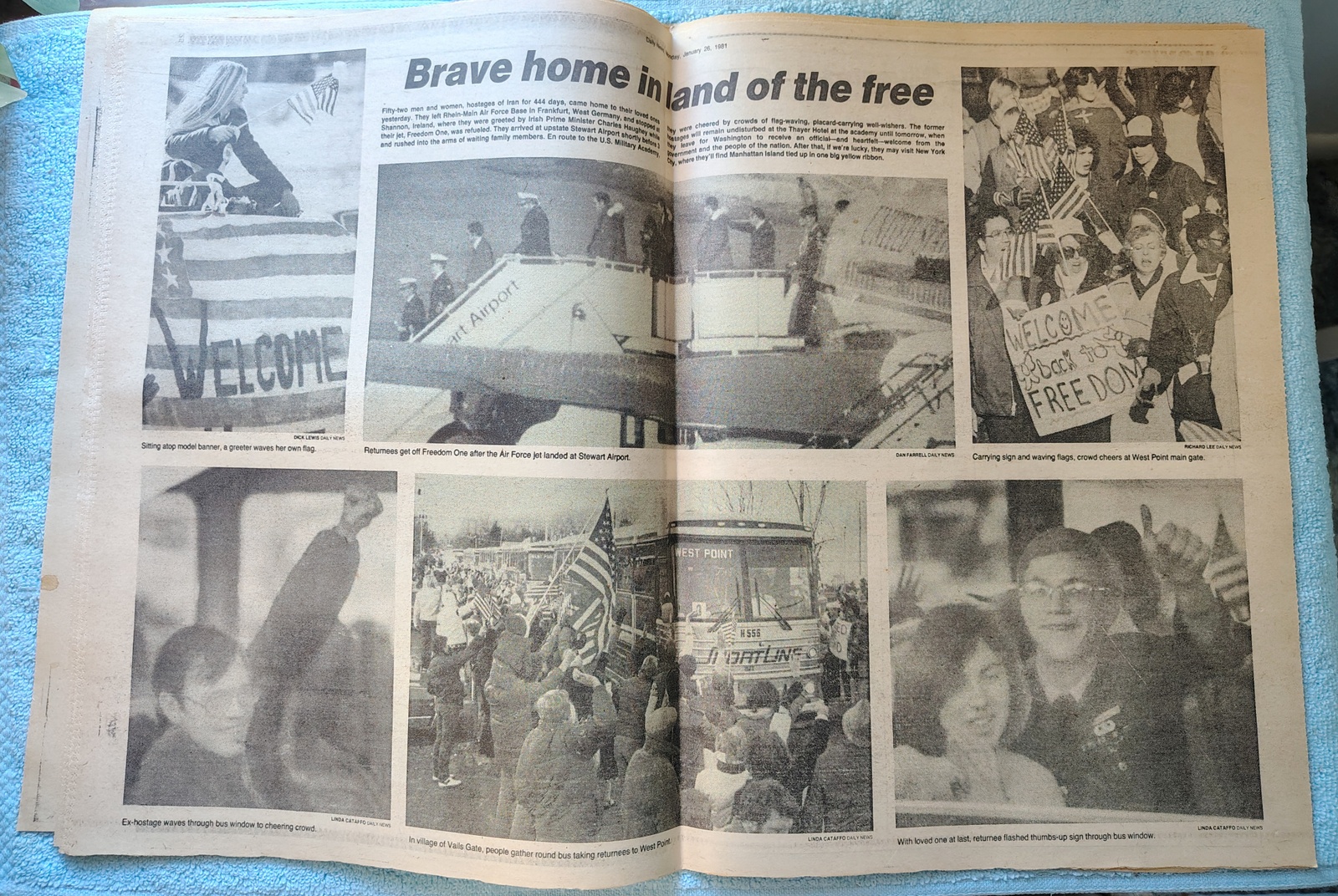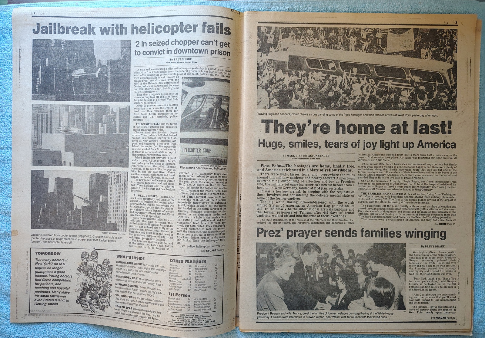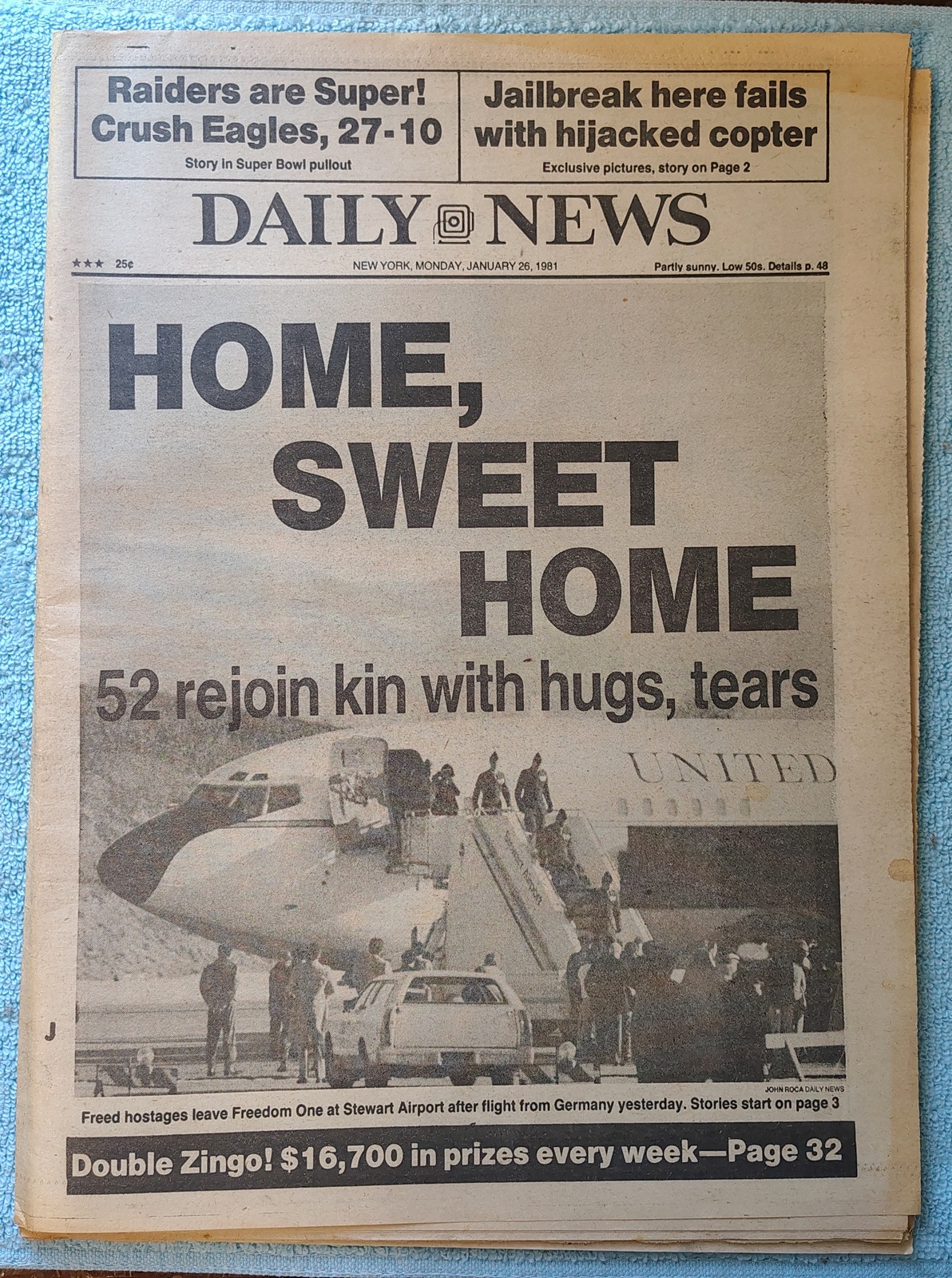 New York Daily News – Monday, January 26, 1981. The headline is: ‘Home, Sweet Home 52 rejoin kin with hugs, tears’ The front page features a picture of the freed hostages leaving the United jet that took them to Stewart Airport. What you see in the pictures is what you get.