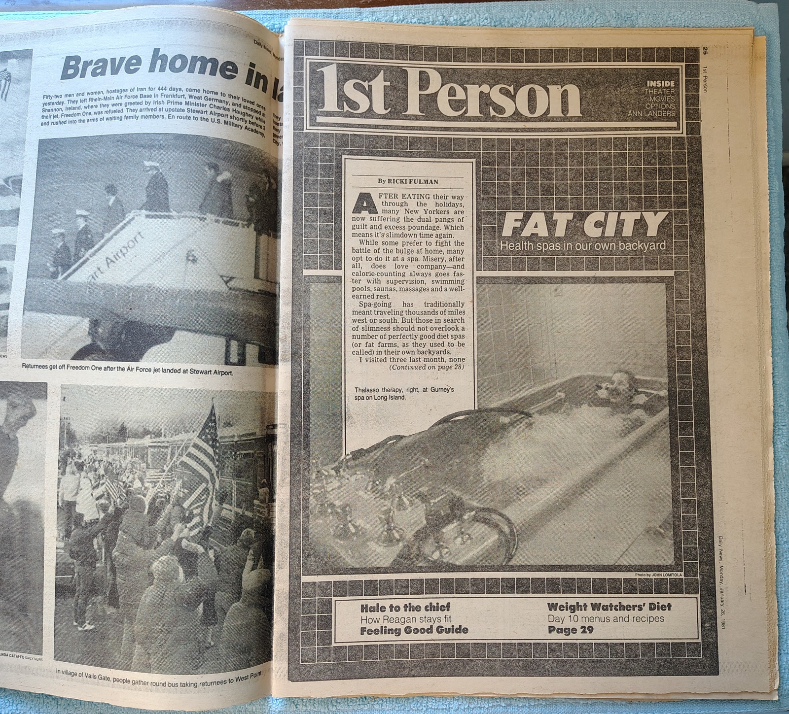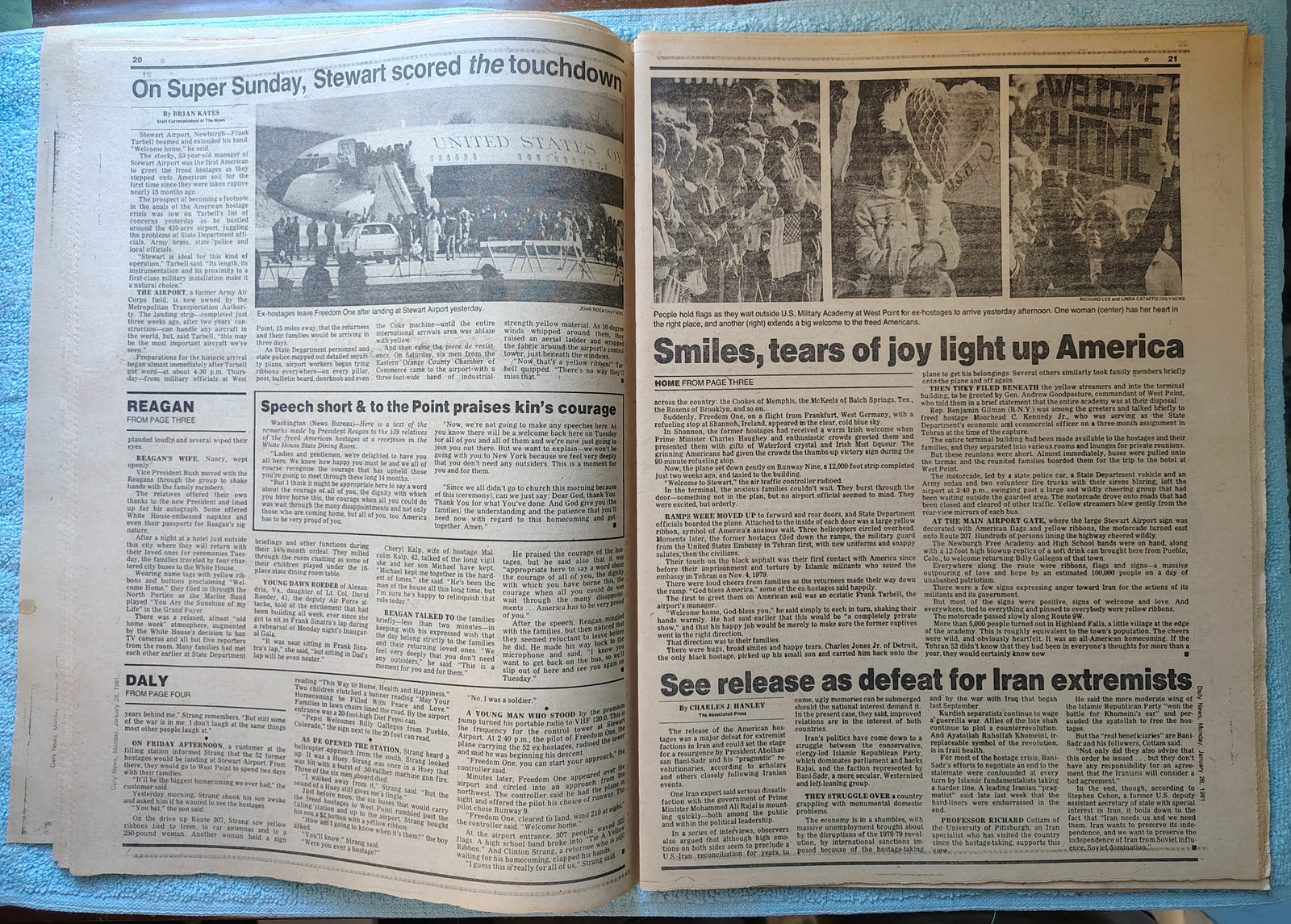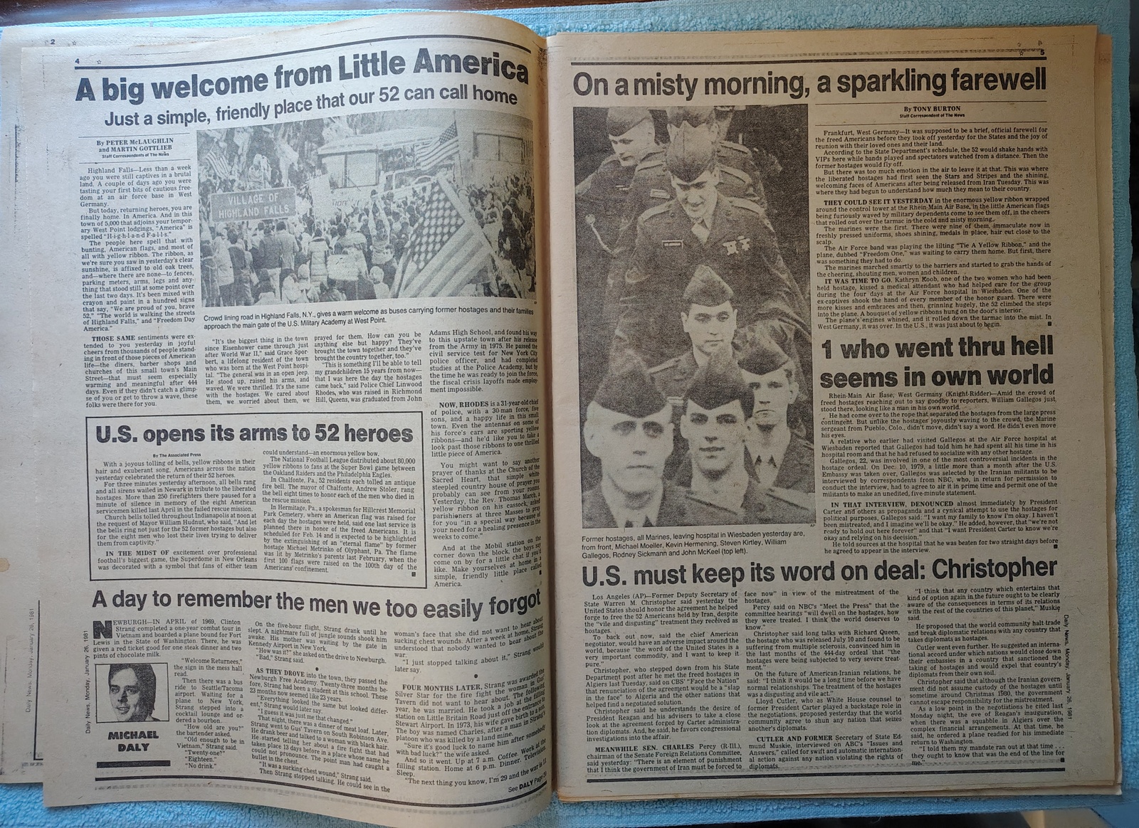 New York Daily News – Monday, January 26, 1981. The headline is: ‘Home, Sweet Home 52 rejoin kin with hugs, tears’ The front page features a picture of the freed hostages leaving the United jet that took them to Stewart Airport. What you see in the pictures is what you get.