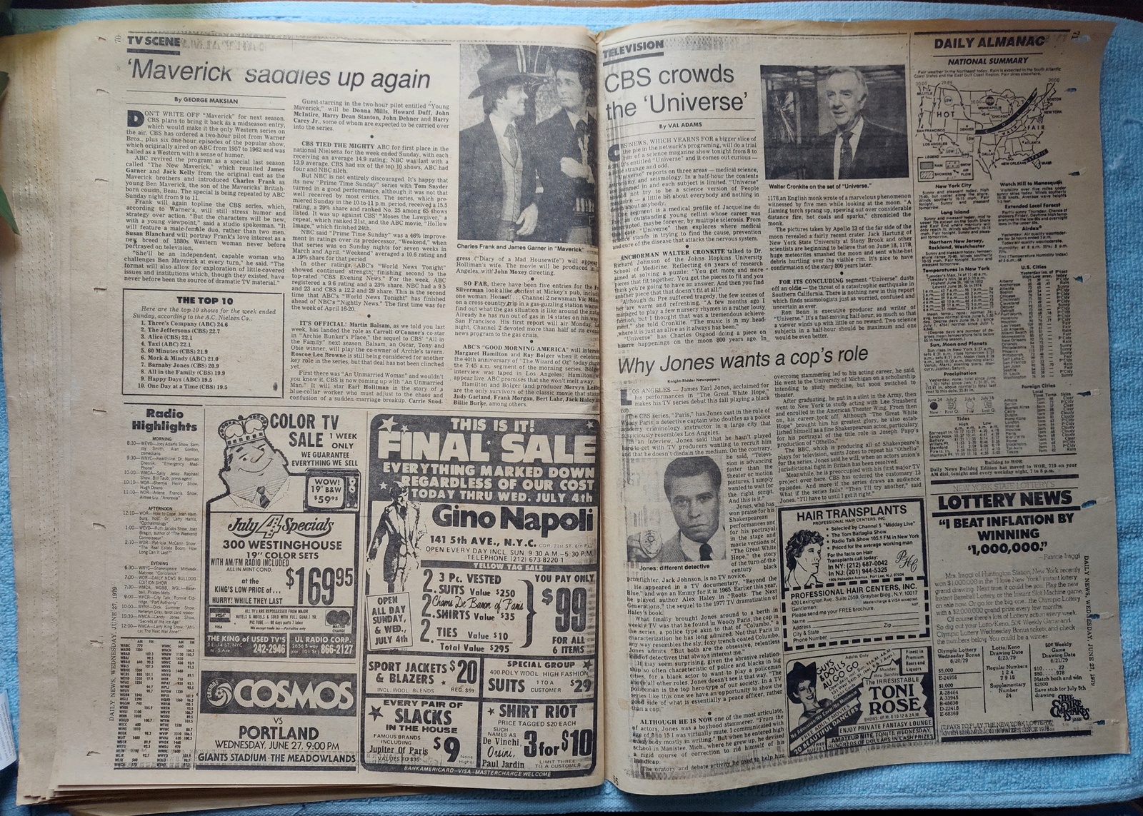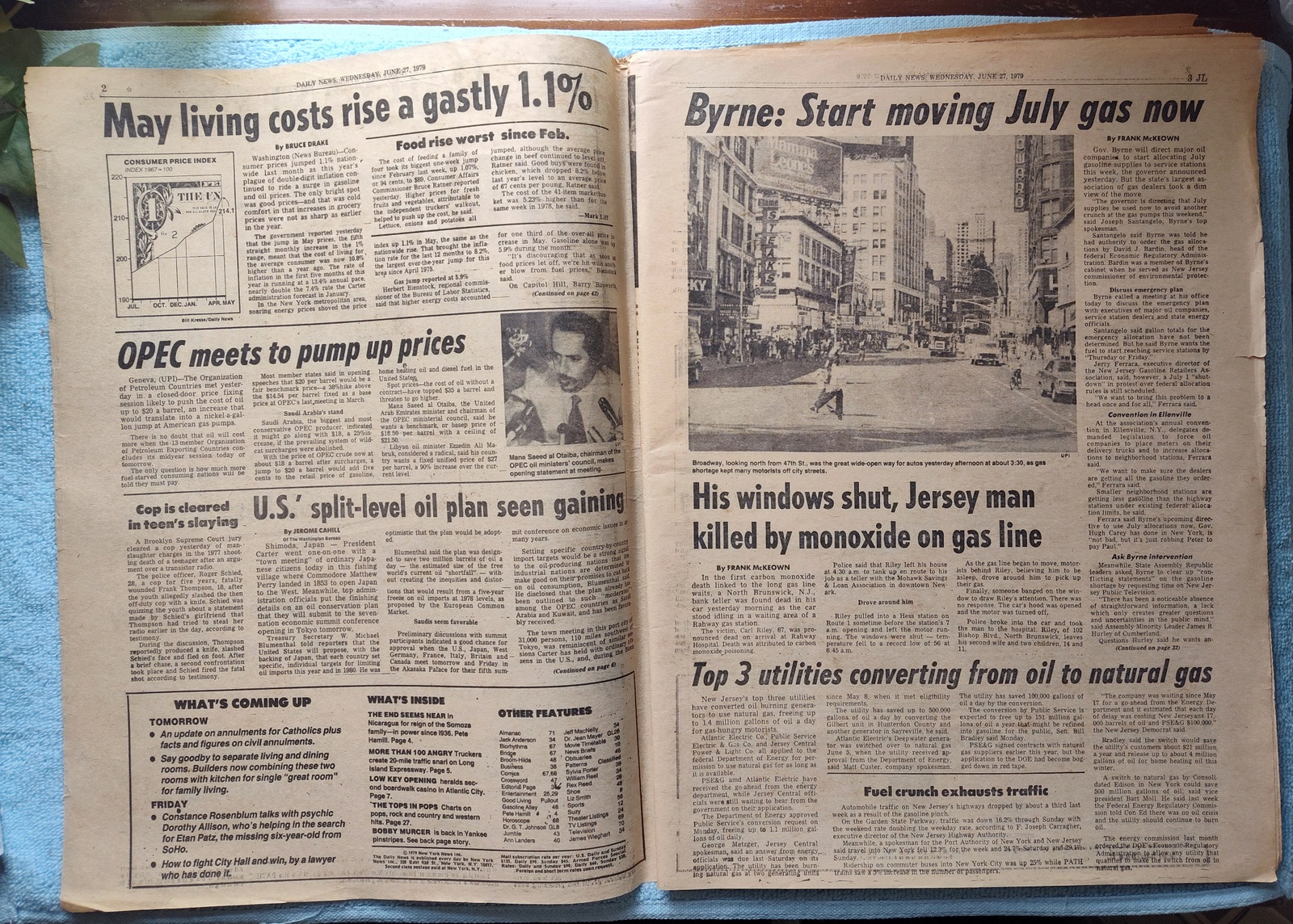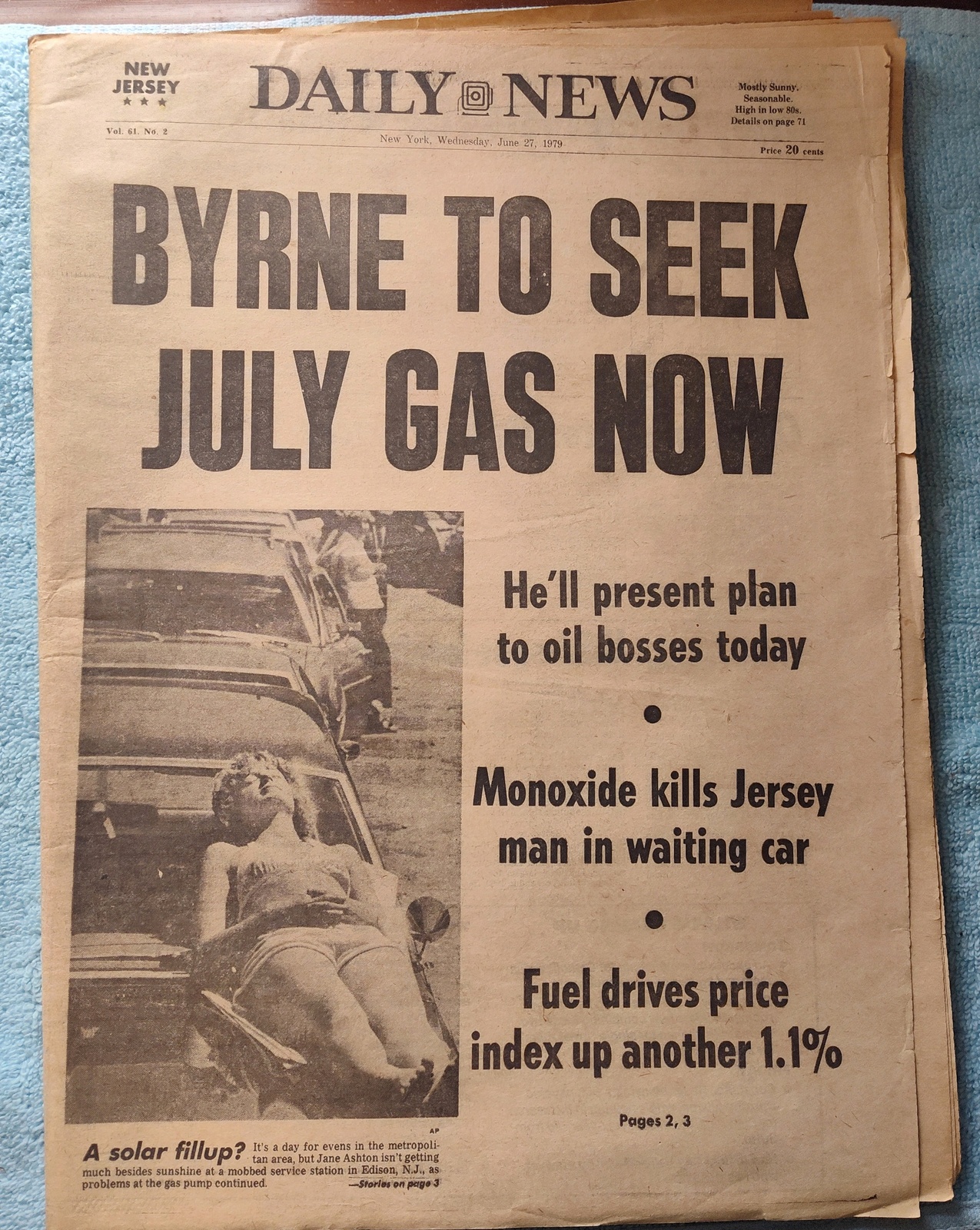 New York Daily News – Wednesday, June 27, 1979. This old newspaper features on the front page a picture of Jane Ashton sunning herself on the car while waiting in line to buy gasoline. The headline is: ‘Byrne To Seek July Gas Now’ and ‘Monoxide kills Jersey man in waiting car’ – What you see in the pictures is what you get.