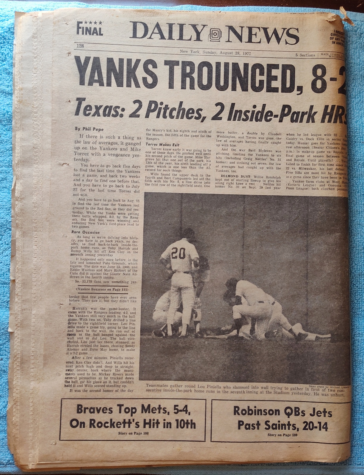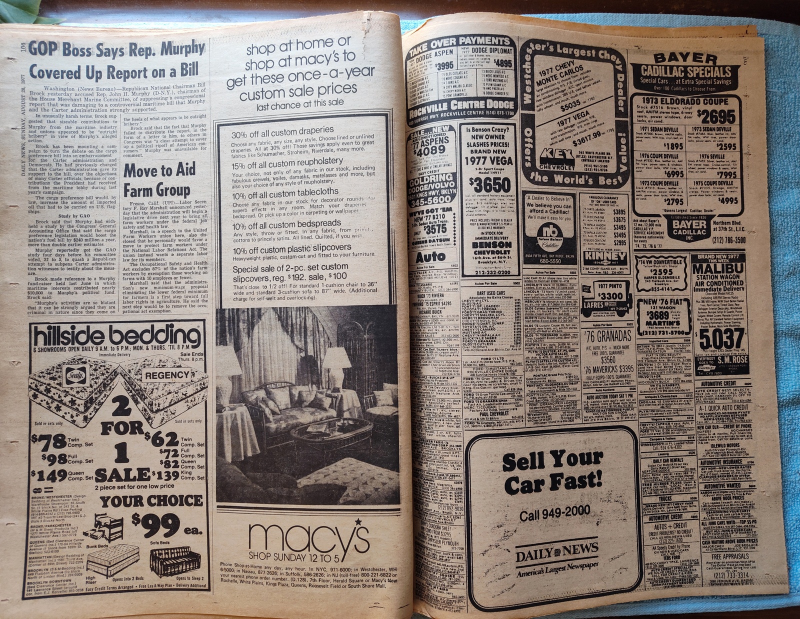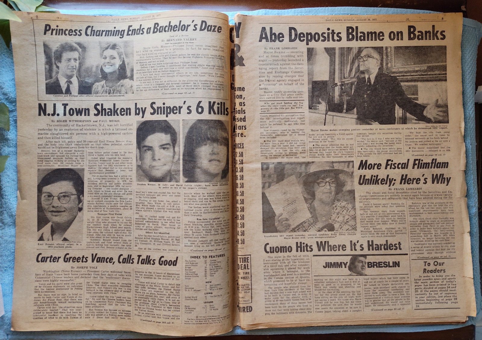 New York Daily News – Monday, August 29, 1977. This old newspaper features on the front page a picture of Secretary of State Cyrus Vance and President Carter. The headline is: ‘Cosmos Win It!’ ‘Prober: Sniper’s Gun Illegal’ ‘ Senator: Gun Bills Need Help’ What you see in the pictures is what you get.