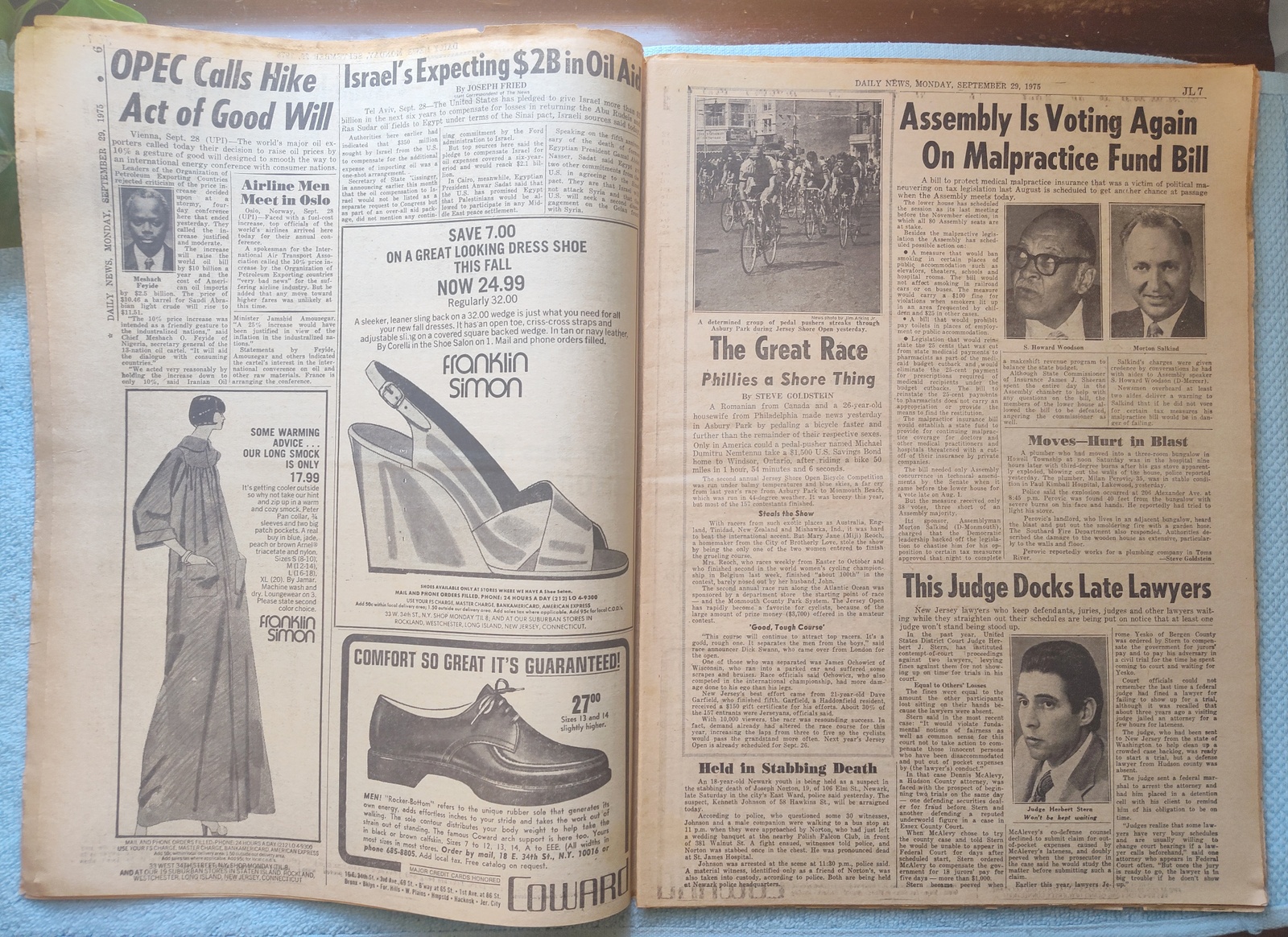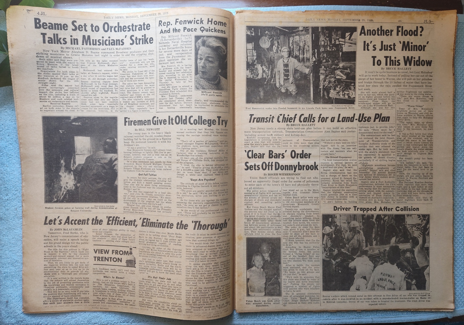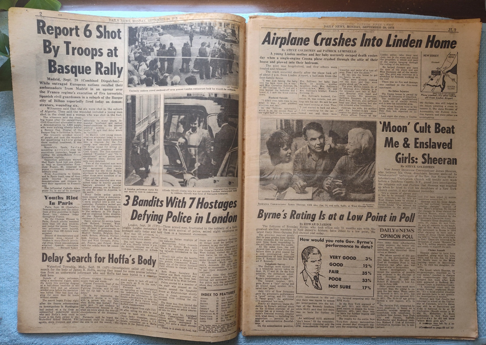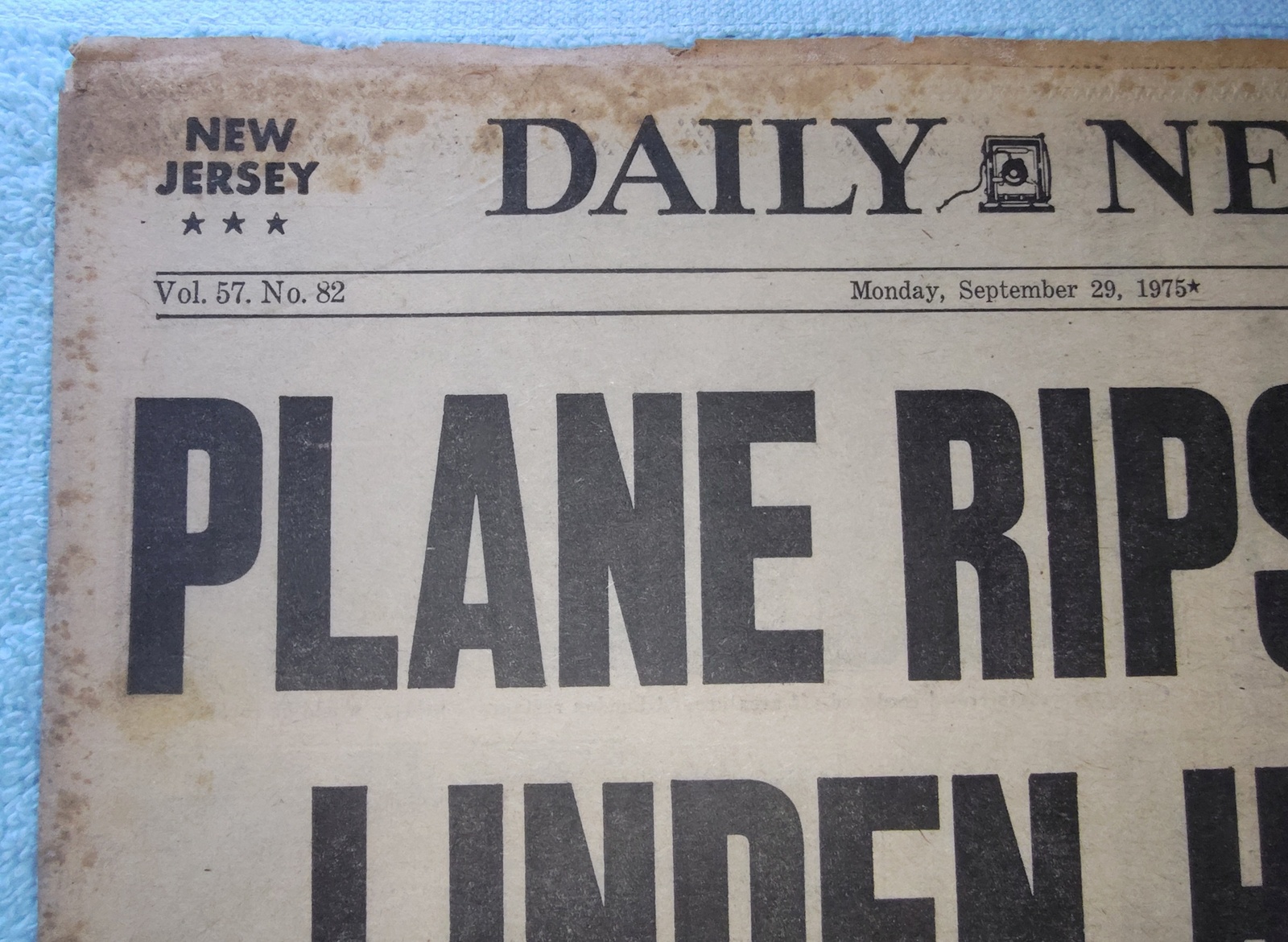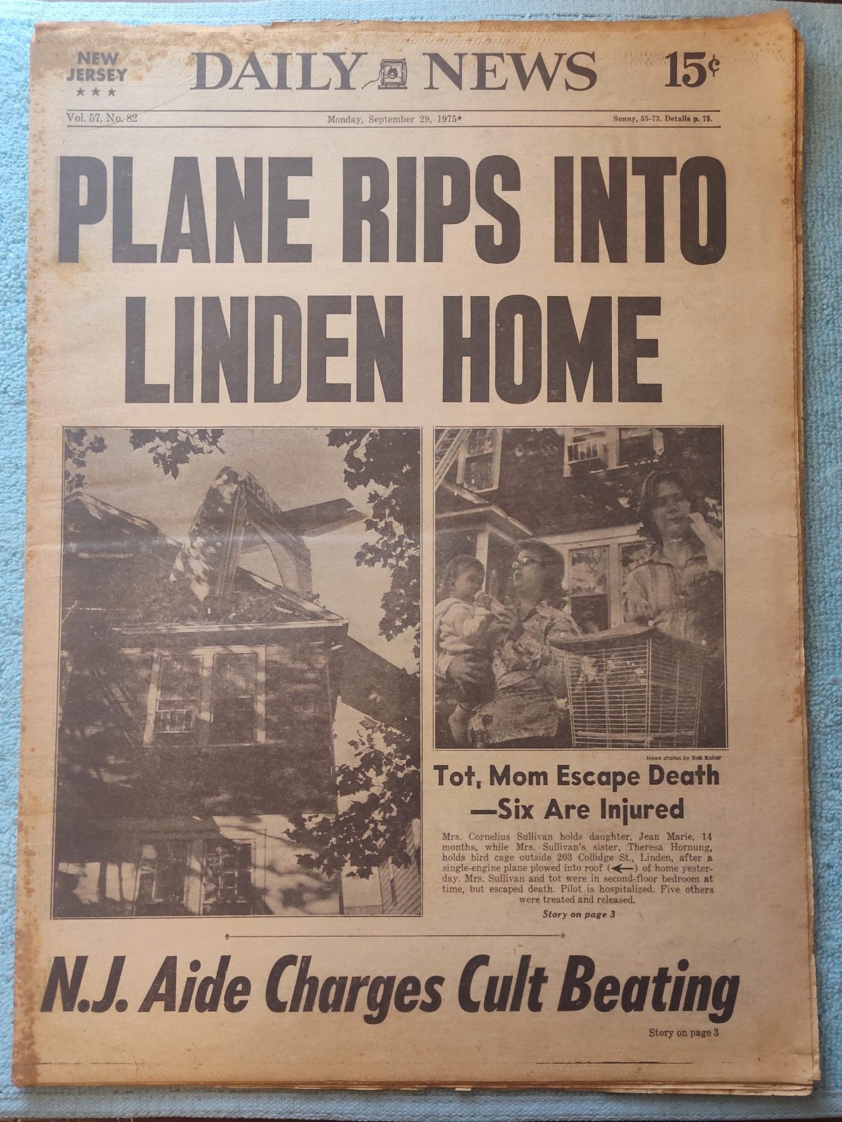 New York Daily News (New Jersey Edition) Monday, September 29, 1975. This old newspaper features on the front page a picture of a small plane sticking out of the roof of a house. The headline is: ‘Plane Rips Into Linden Home’ and ‘Tot, Mom Escape Death – Six Are Injured’ What you see in the pictures is what you get.