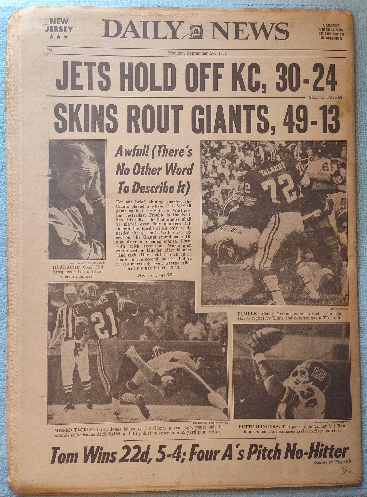- The back page features pictures of the Washington Redskins defeating the New York Giants in Washington, 49-13.