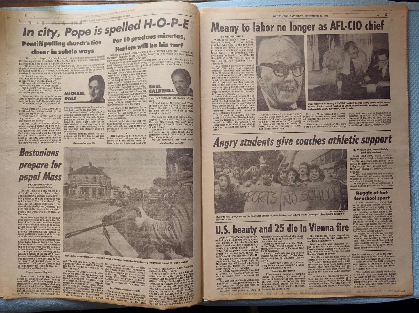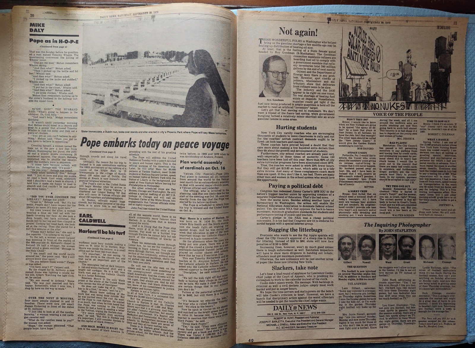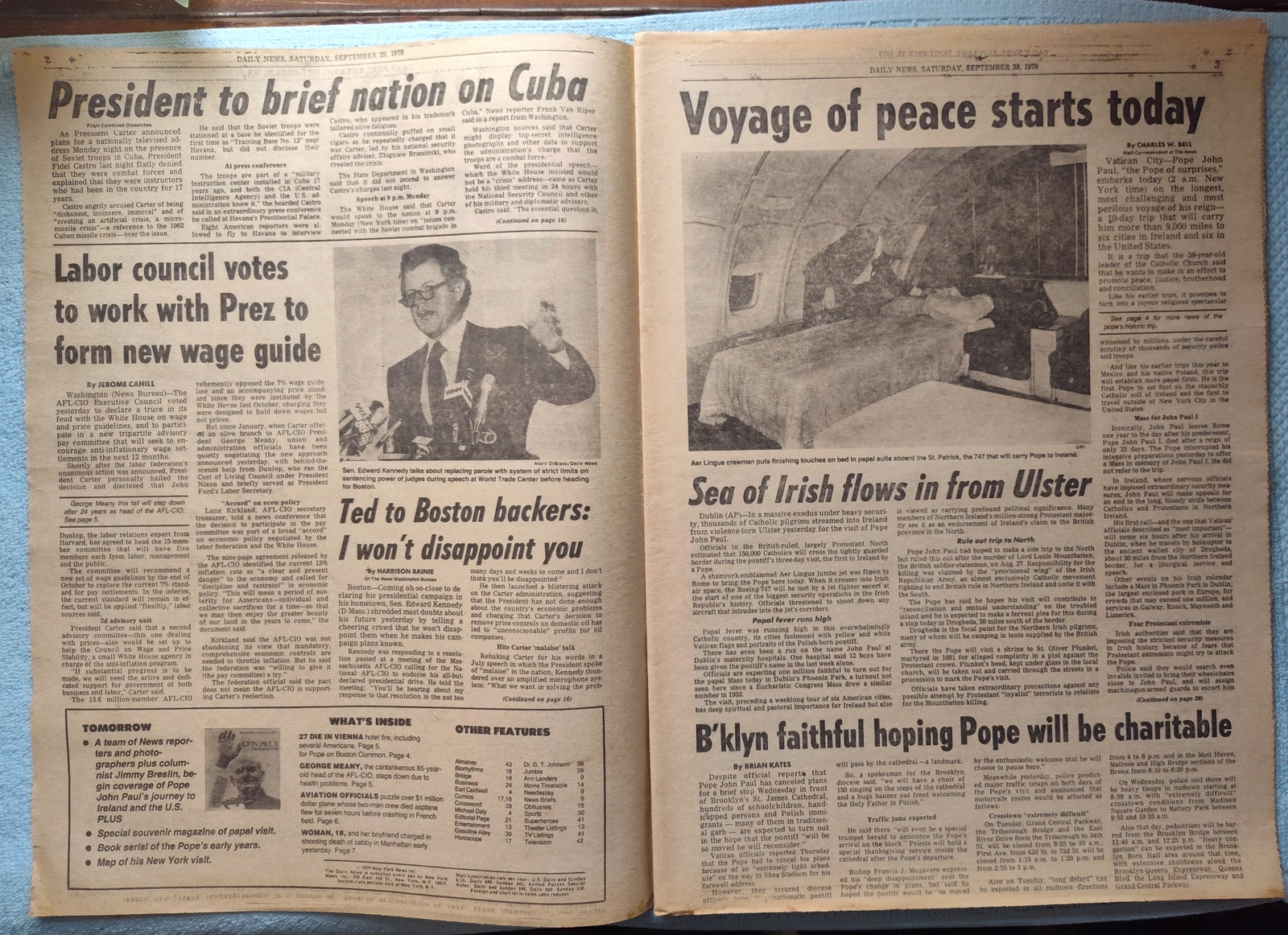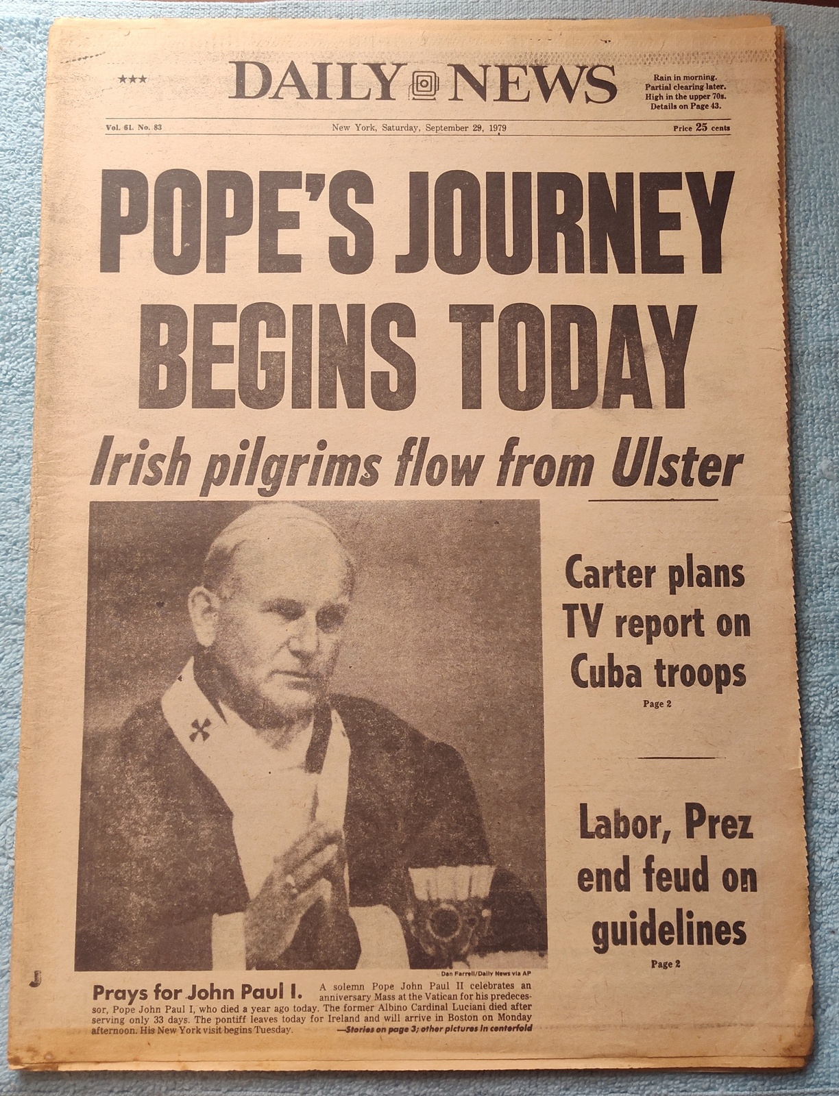 New York Daily News – Saturday, September 29, 1979. This old newspaper features on the front page a picture of Pope John Paul II celebrating a mass in honor of his predecessor – John Paul I before his trip to Ireland and the United States. The headline is: ‘Pope’s Journey Begins Today’ and ‘Irish pilgrims flow from Ulster’ – What you see in the pictures is what you get.