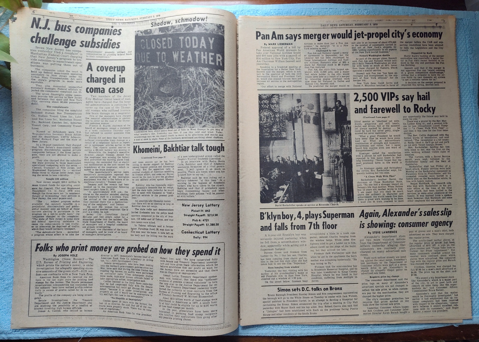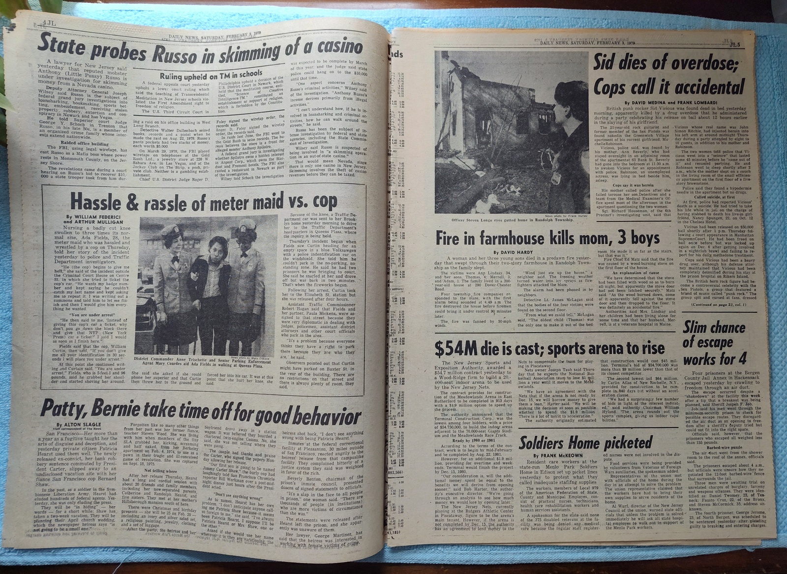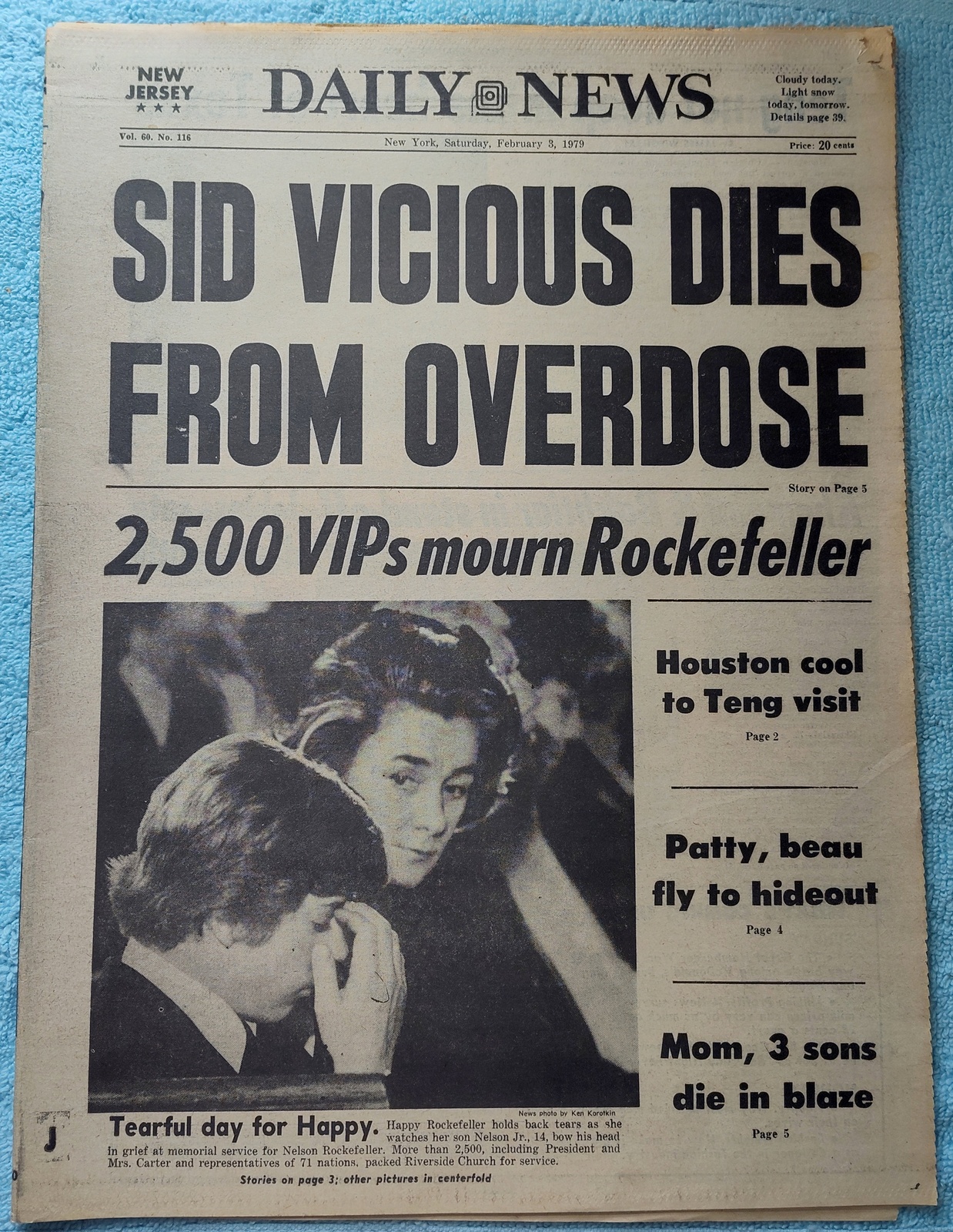 New York Daily News (New Jersey Edition) – Saturday, February 3, 1979. This old newspaper features on the front page a picture of Happy Rockefeller and son Nelson Jr., at the memorial service for Nelson Rockefeller. The headline is: ‘Sid Vicious Dies From Overdose’ ‘2,500 VIPs mourn Rockefeller’ What you see in the pictures is what you get.