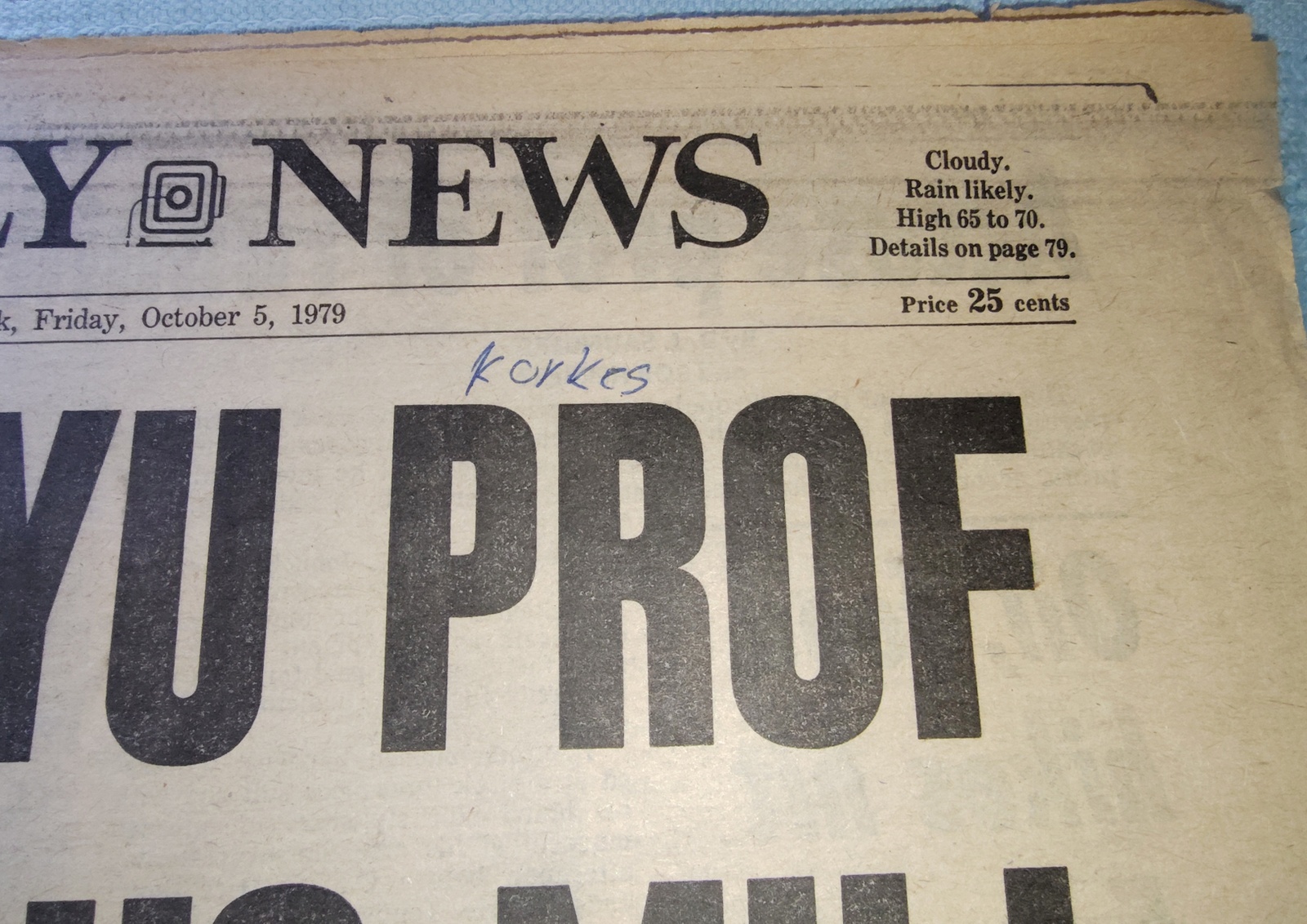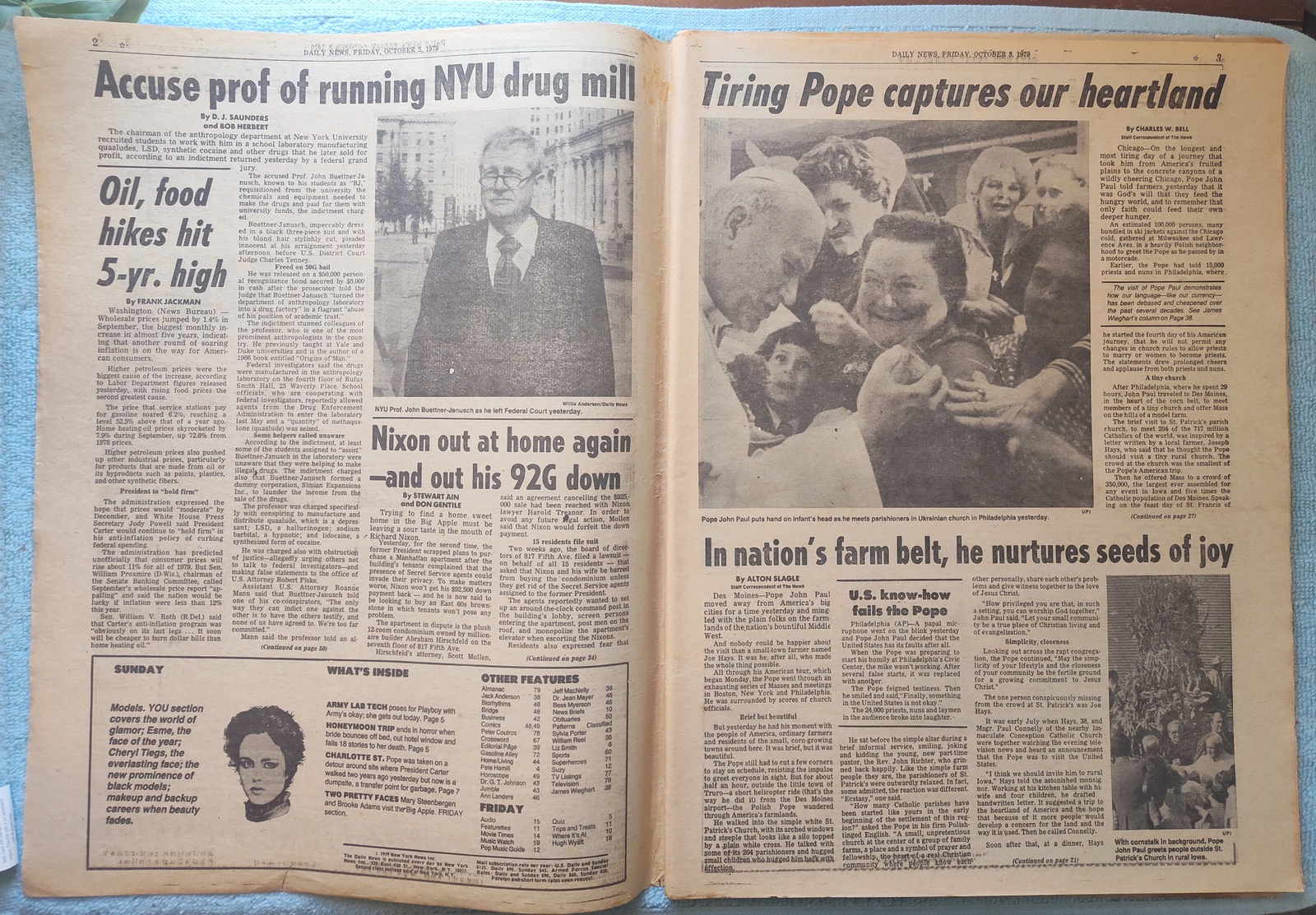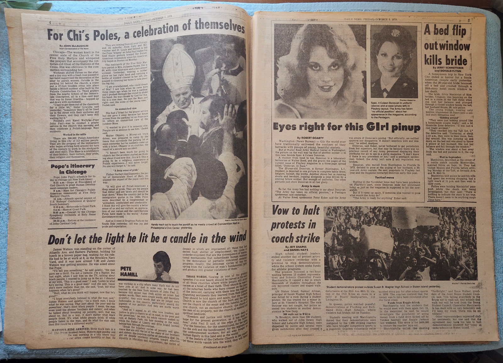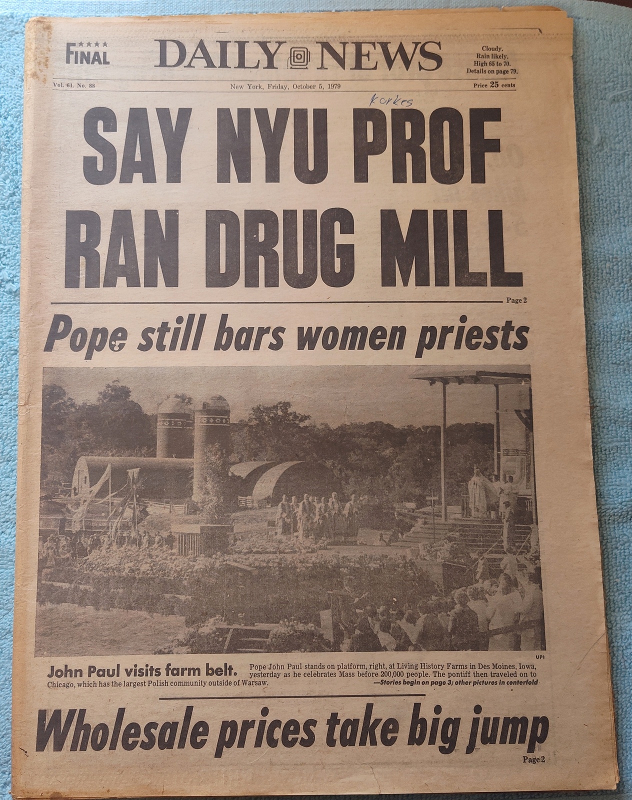 New York Daily News – Friday, October 5, 1979. This old newspaper features on the front page a picture of Pope John Paul II celebrating mass in Des Moines, IA with 200,000 of the faithful before heading to Chicago. The headline is: ‘Say NYU Prof Ran Drug Mill’ and ‘Pope still bars women priests’ – What you see in the pictures is what you get. This paper is autographed in blue ink by none other than ‘korkes’ – look on the front page!