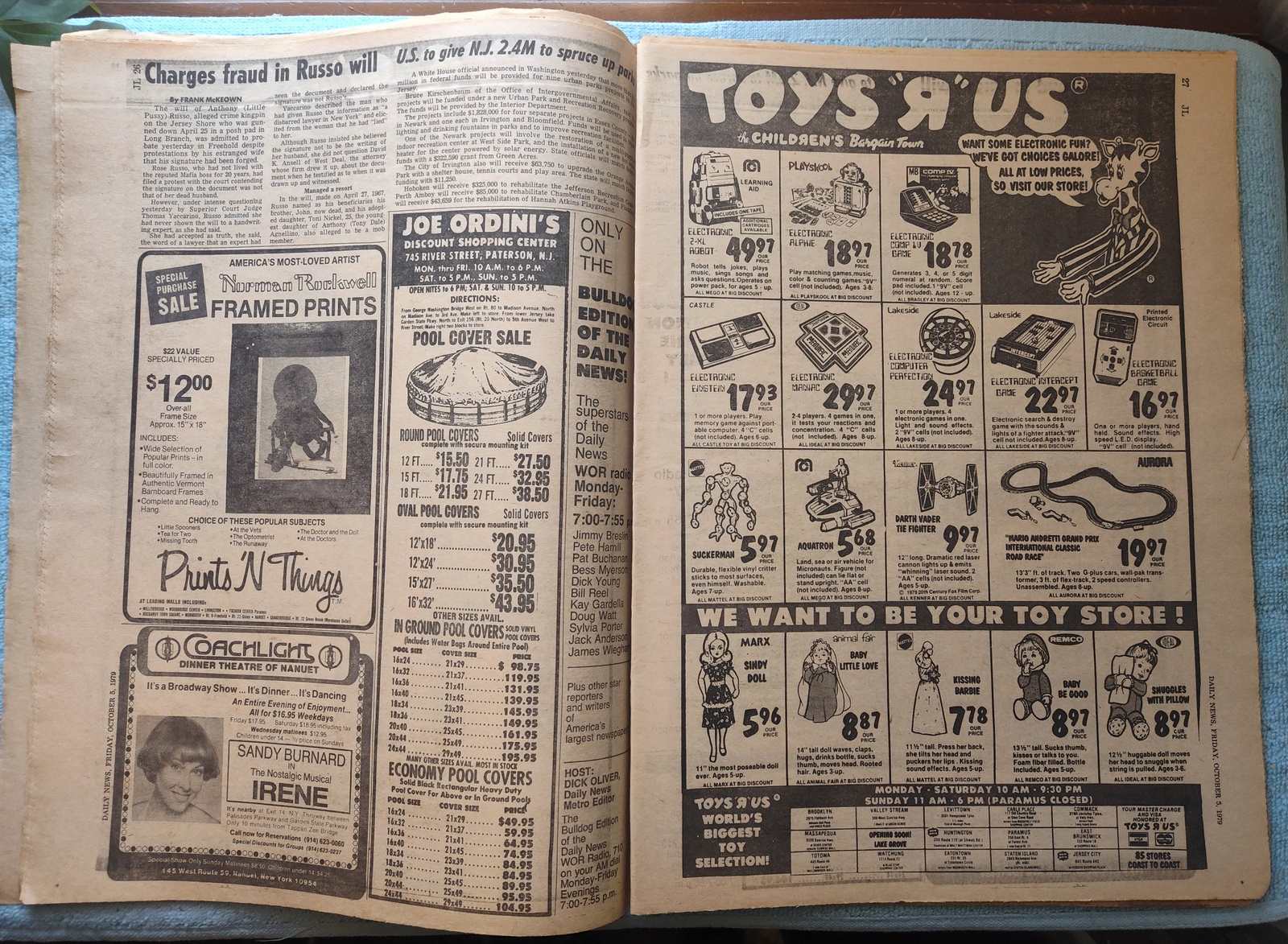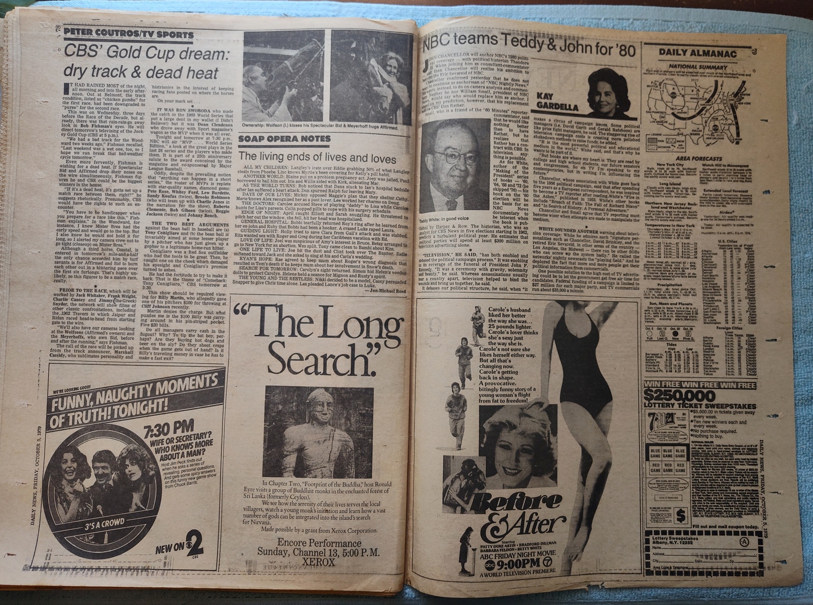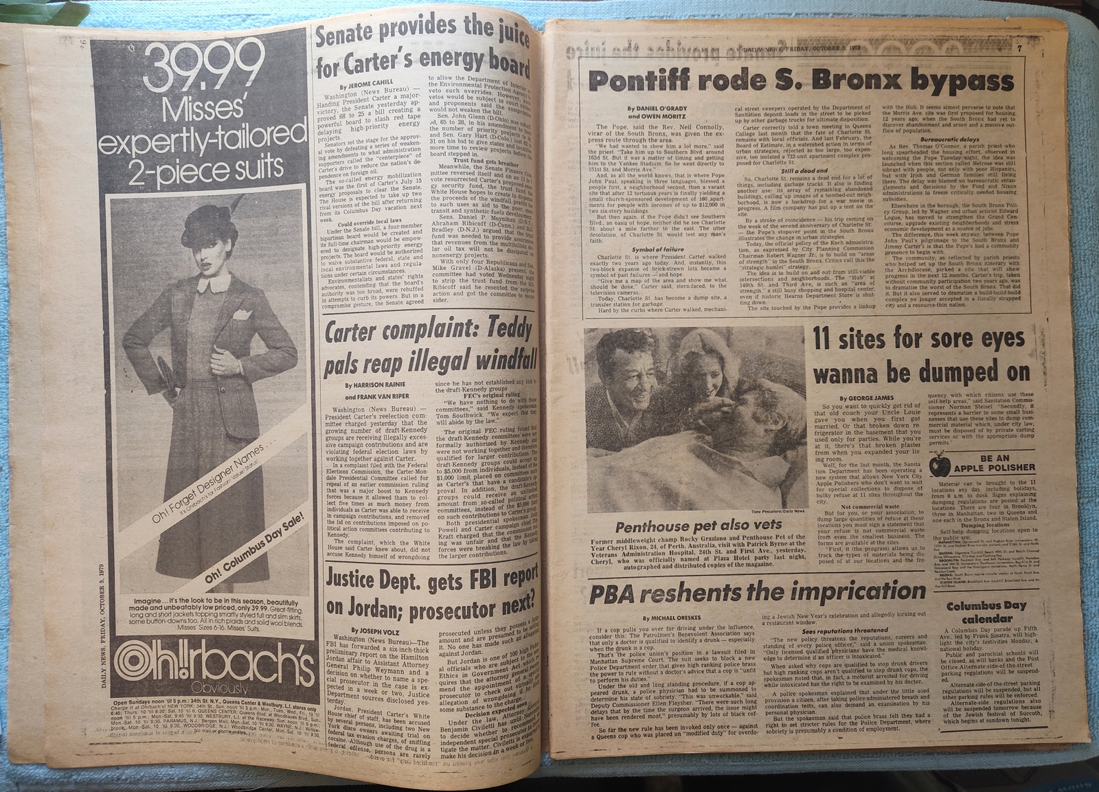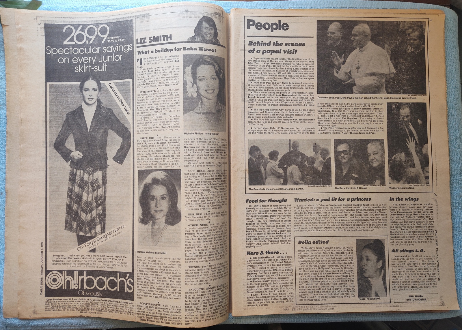 New York Daily News – Friday, October 5, 1979. This old newspaper features on the front page a picture of Pope John Paul II celebrating mass in Des Moines, IA with 200,000 of the faithful before heading to Chicago. The headline is: ‘Say NYU Prof Ran Drug Mill’ and ‘Pope still bars women priests’ – What you see in the pictures is what you get. This paper is autographed in blue ink by none other than ‘korkes’ – look on the front page!
