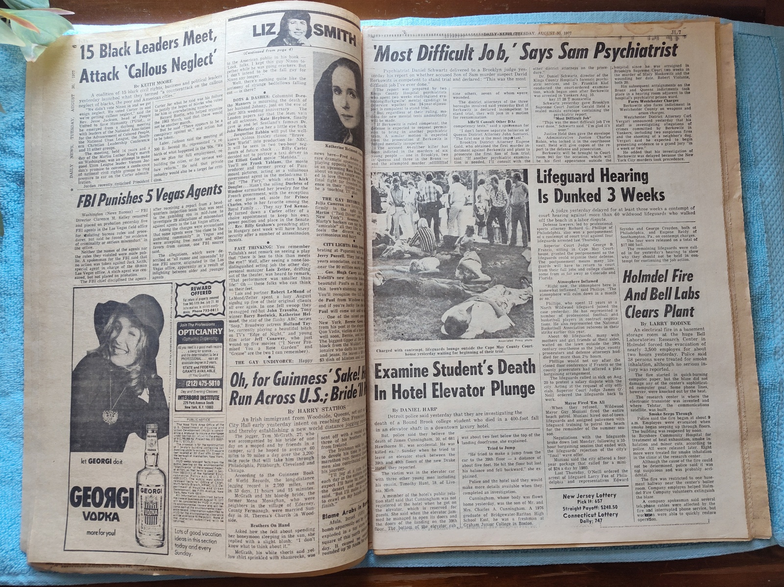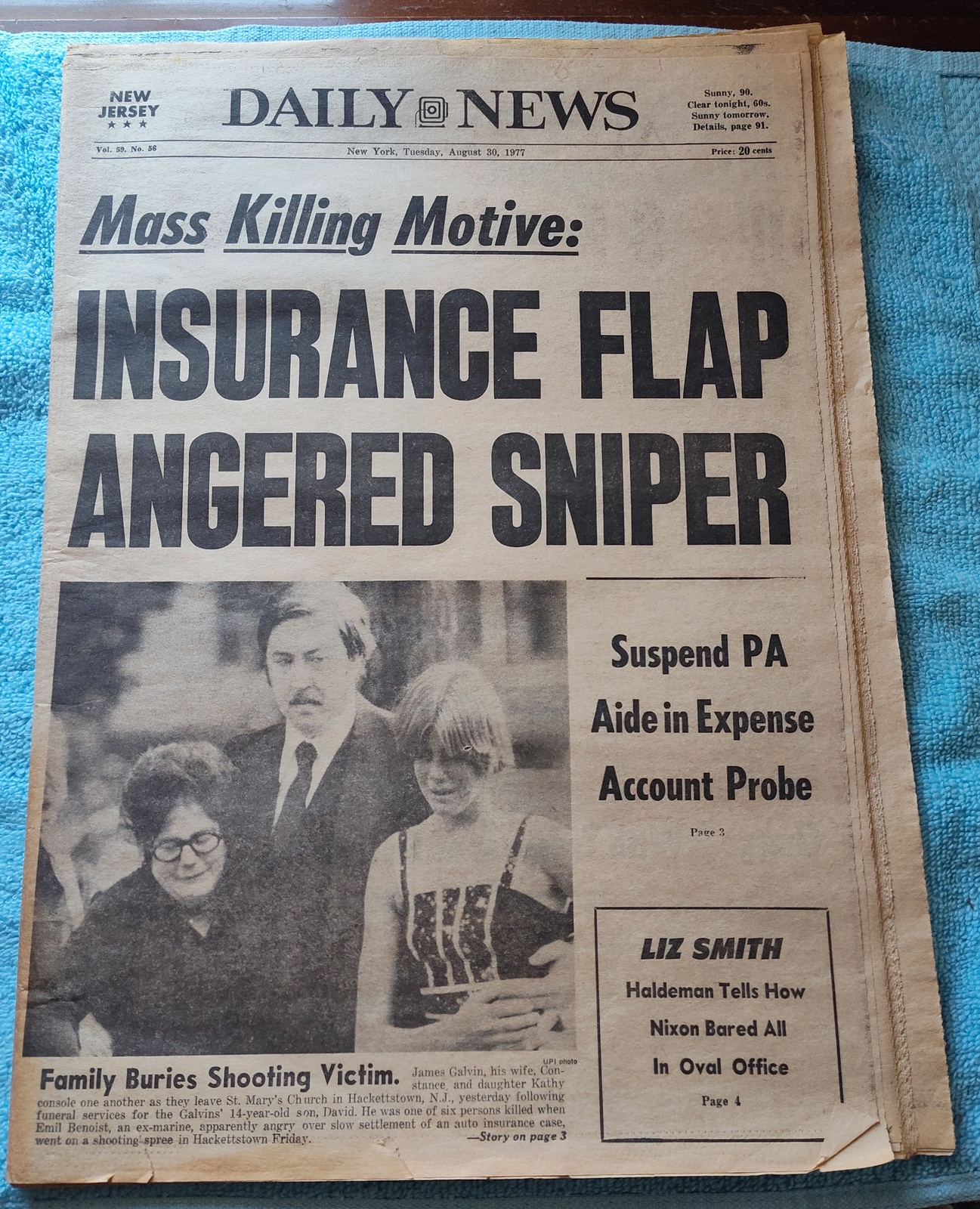 New York Daily News – Tuesday, August 30, 1977. This old newspaper features on the front page a picture of mourners of one of the shooting victims. The headline is: ‘Mass Killing Motive: Insurance Flap Angered Sniper’ What you see in the pictures is what you get.