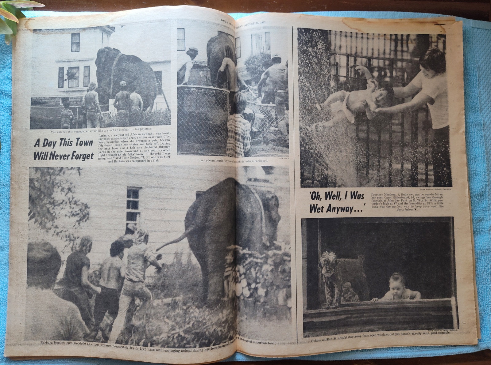 - The centerfold has pictures of an escaped elephant having an hour of freedom and a couple of babies.