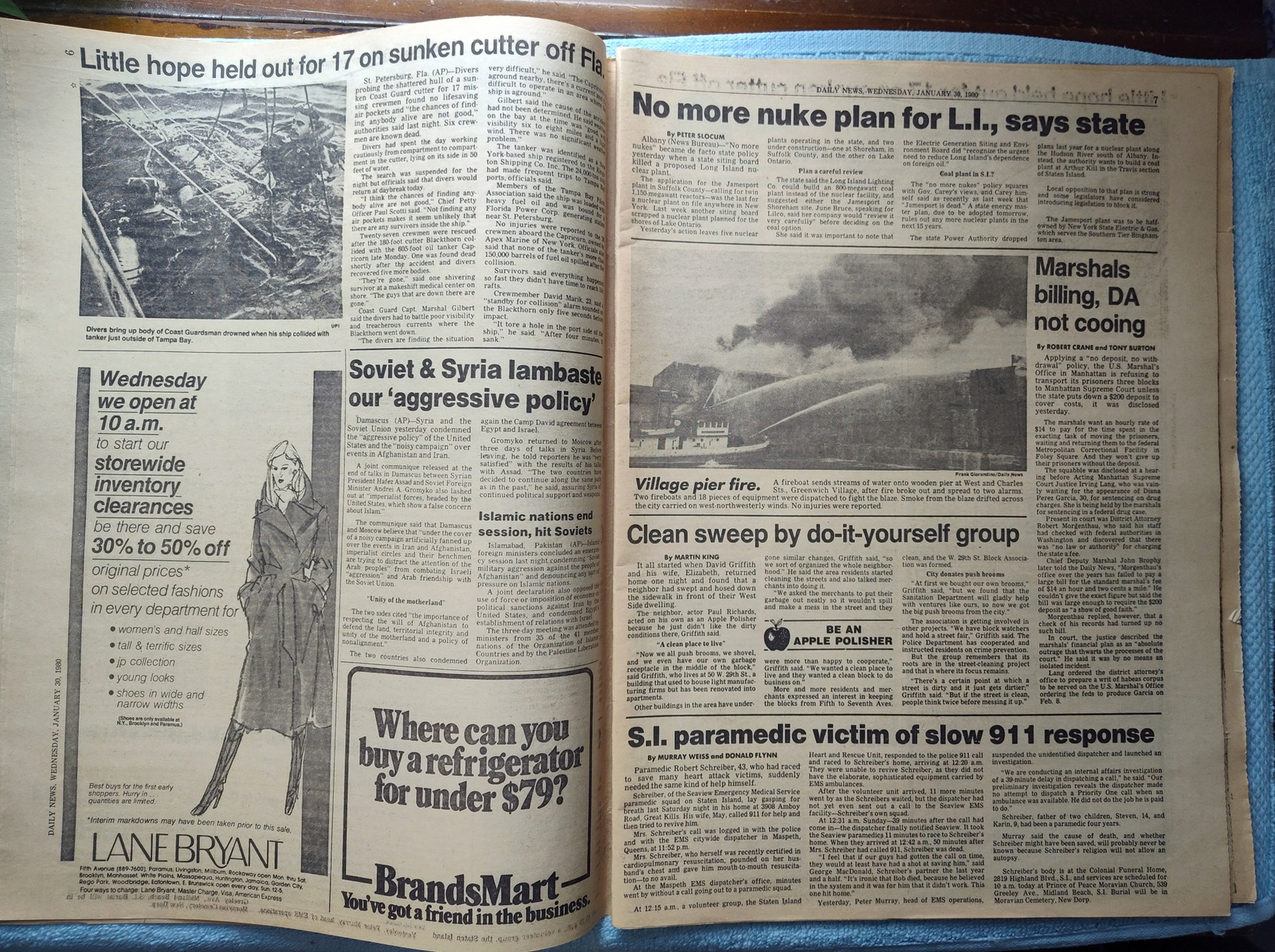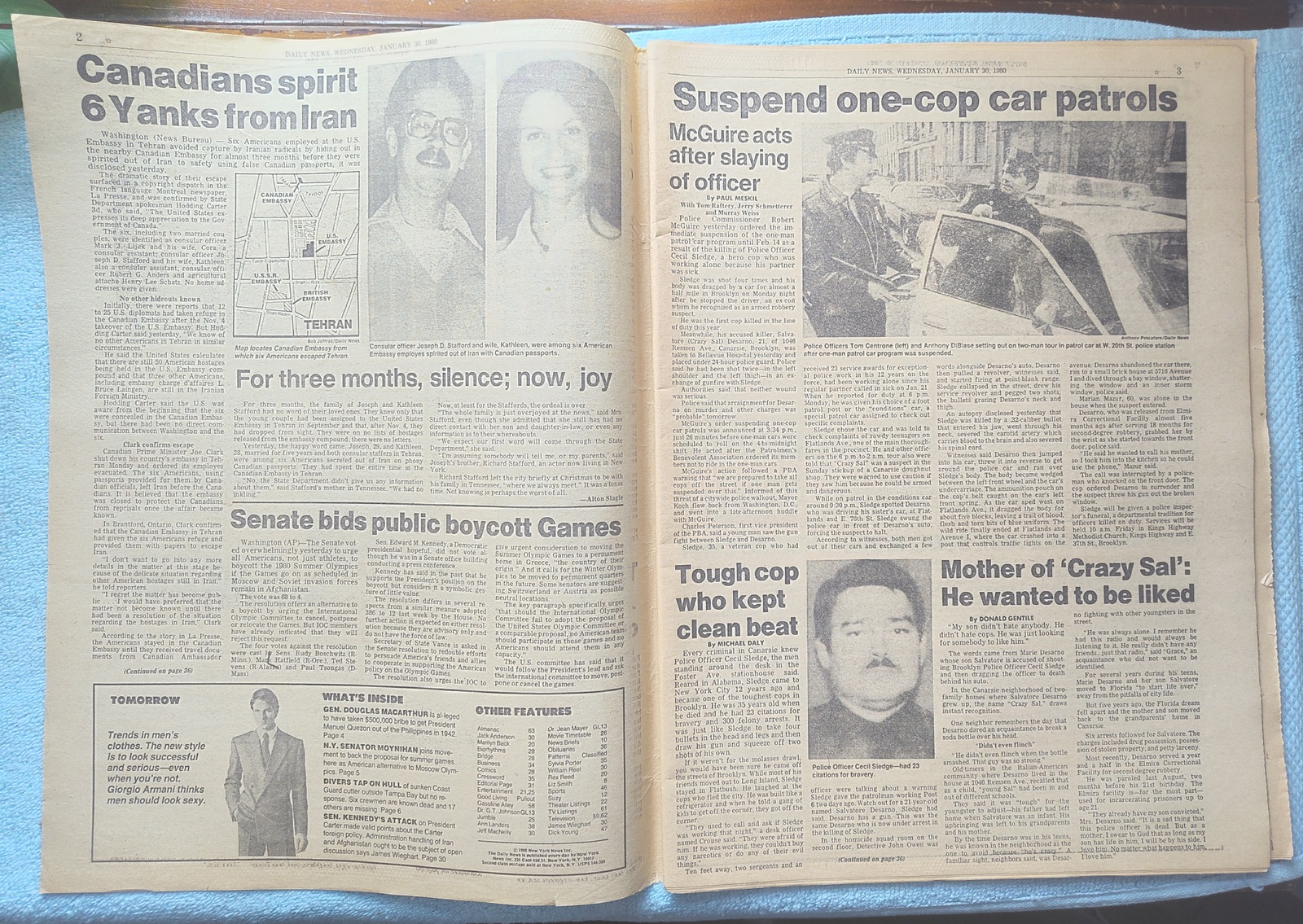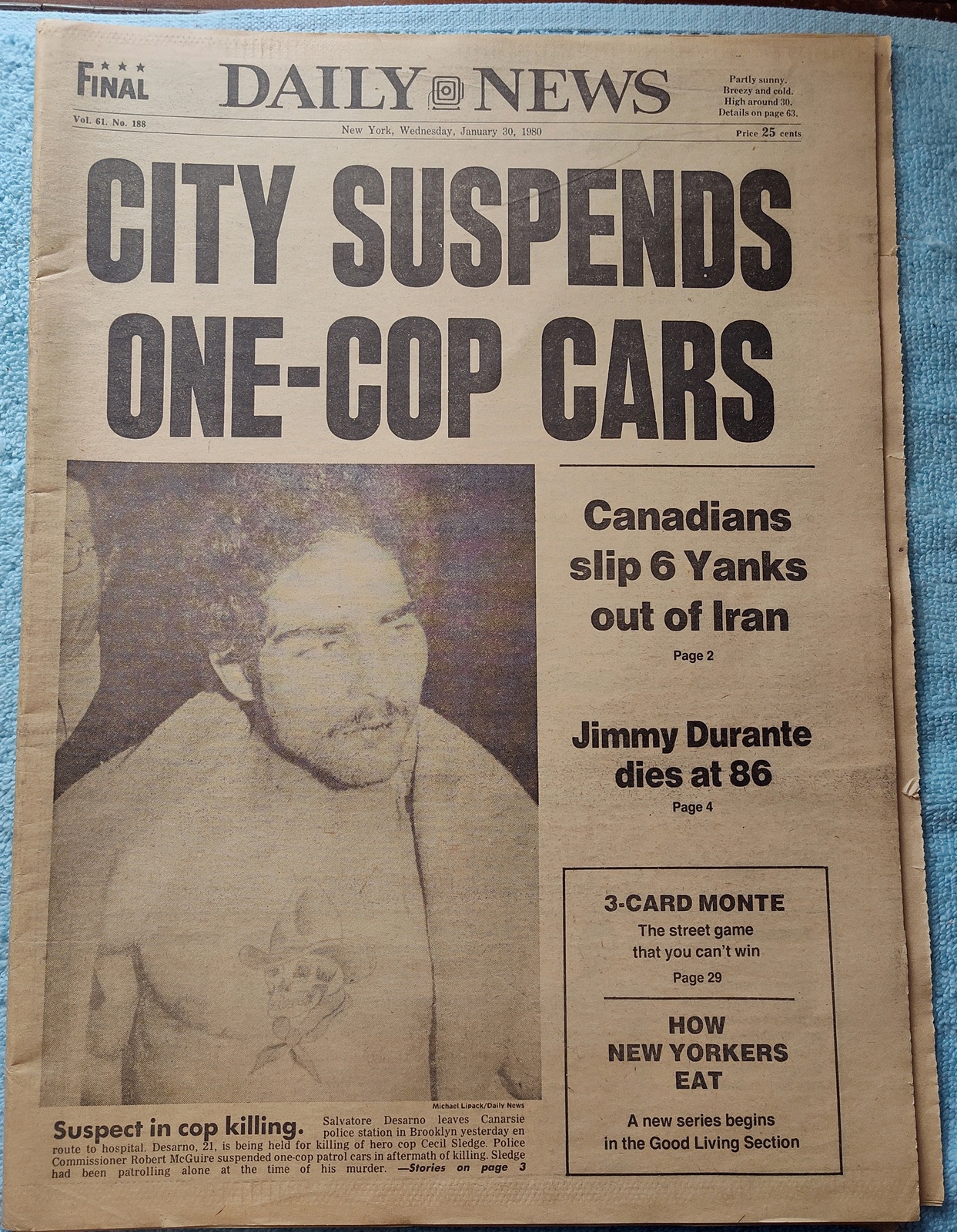 New York Daily News – Wednesday, January 30, 1980. This old newspaper features on the front page a picture of the suspect in the killing of a police officer: Salvatore Desarno. The headline is: ‘City Suspends One-Cop Cars’ and ‘Canadians slip 6 Yanks out of Iran’ and ‘Jimmy Durante dies at 86’ What you see in the pictures is what you get.