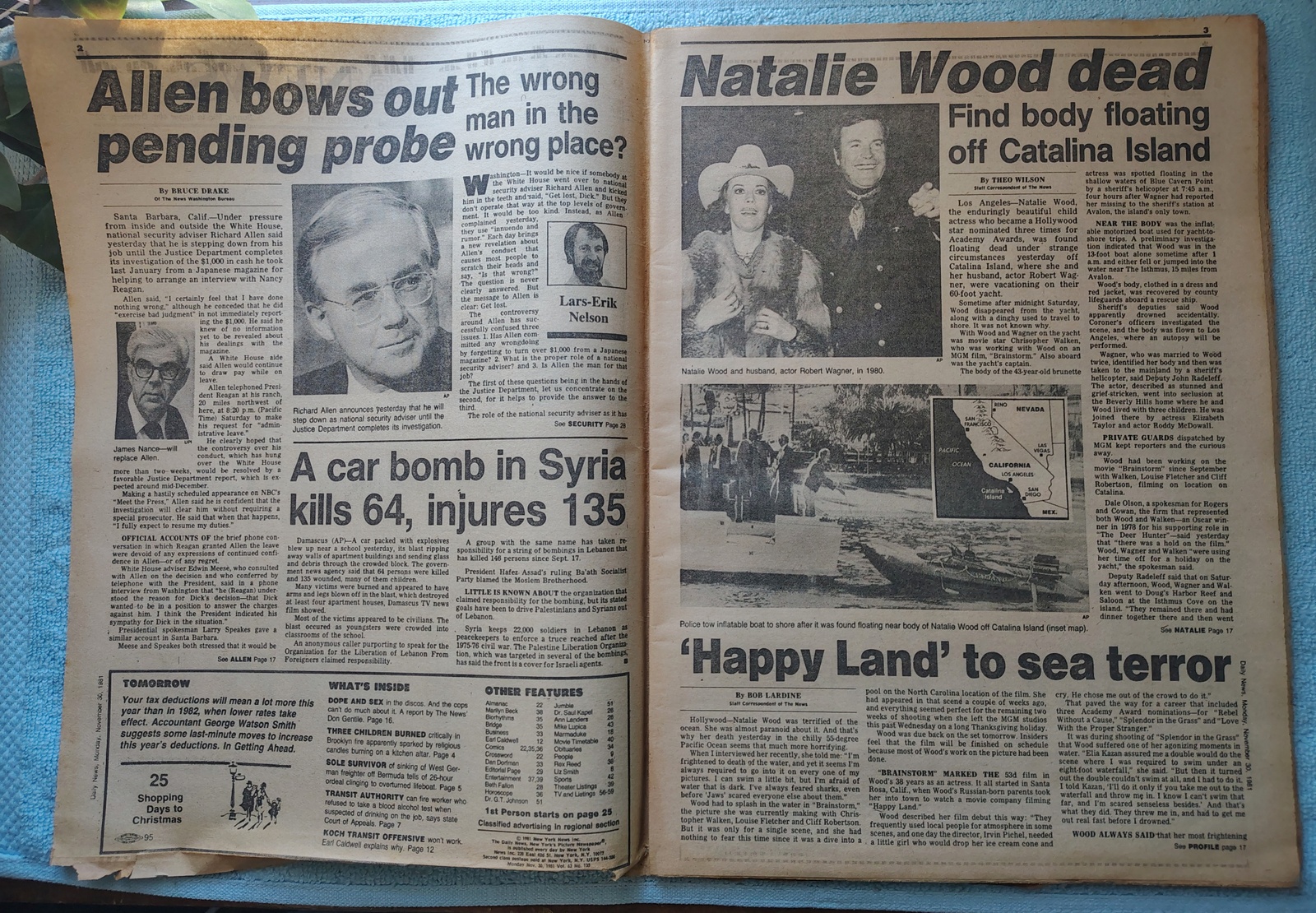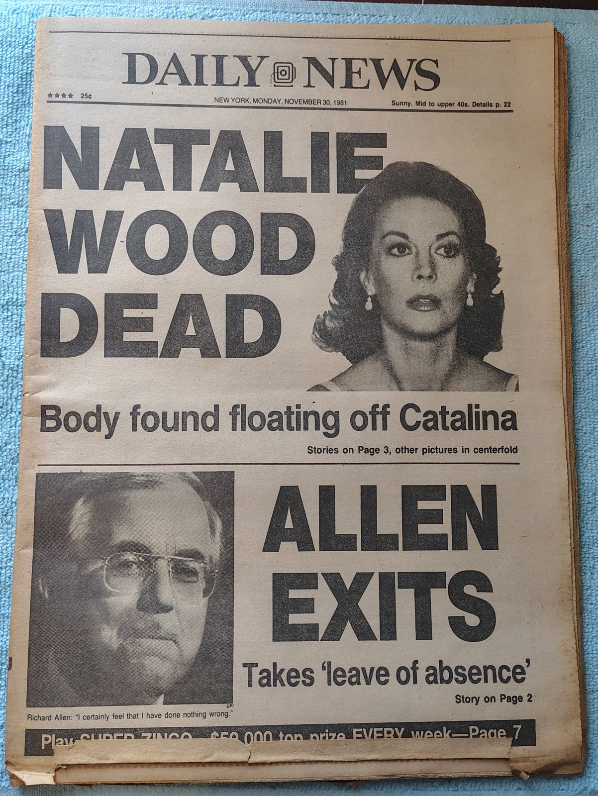 New York Daily News – Monday, November 30, 1981. The headline is: ‘Natalie Wood Dead’ ‘Body Found Floating off Catalina’ The front page features pictures of Natalie Wood and National Security Advisor Richard Allen. What you see in the pictures is what you get.