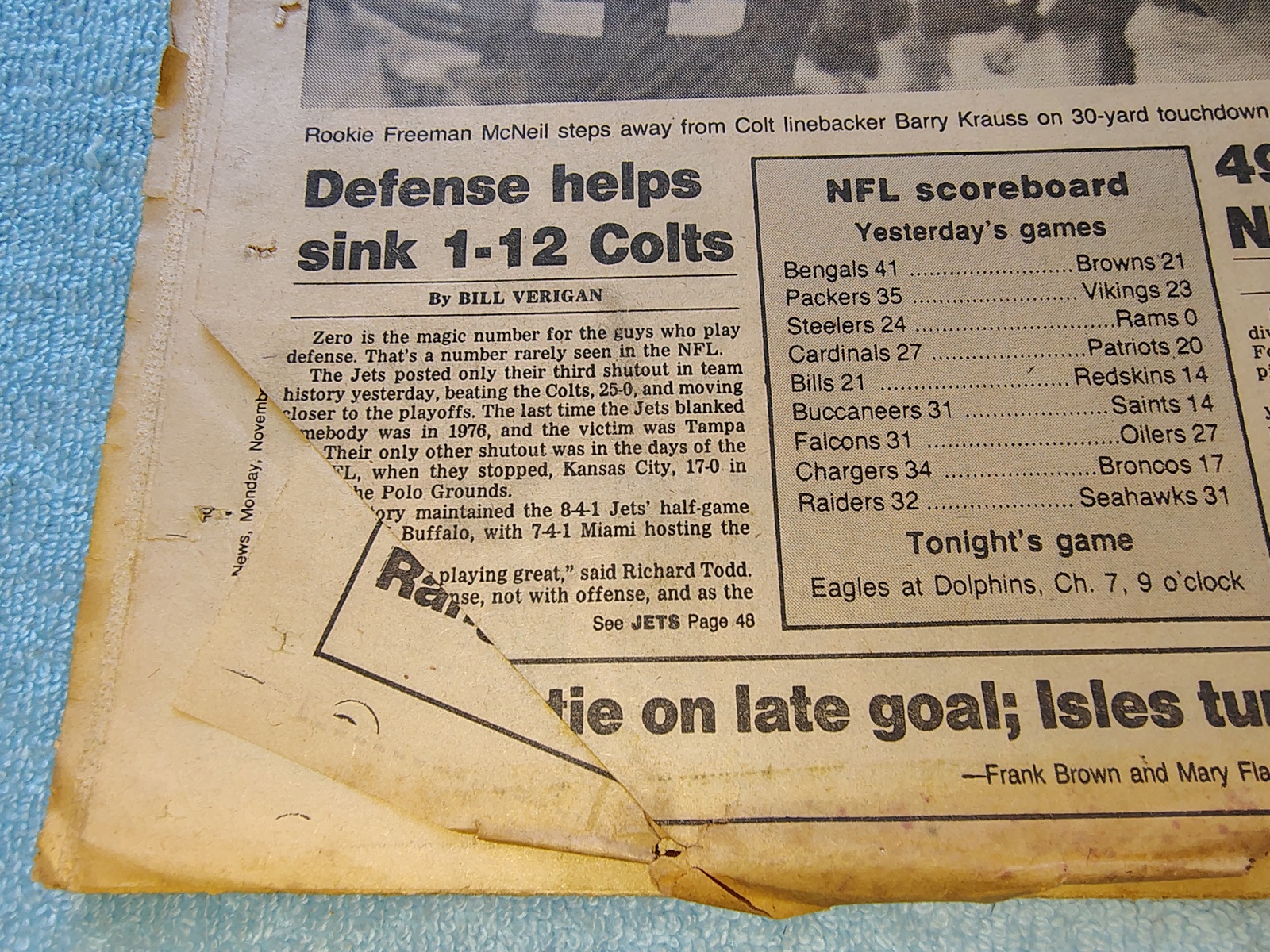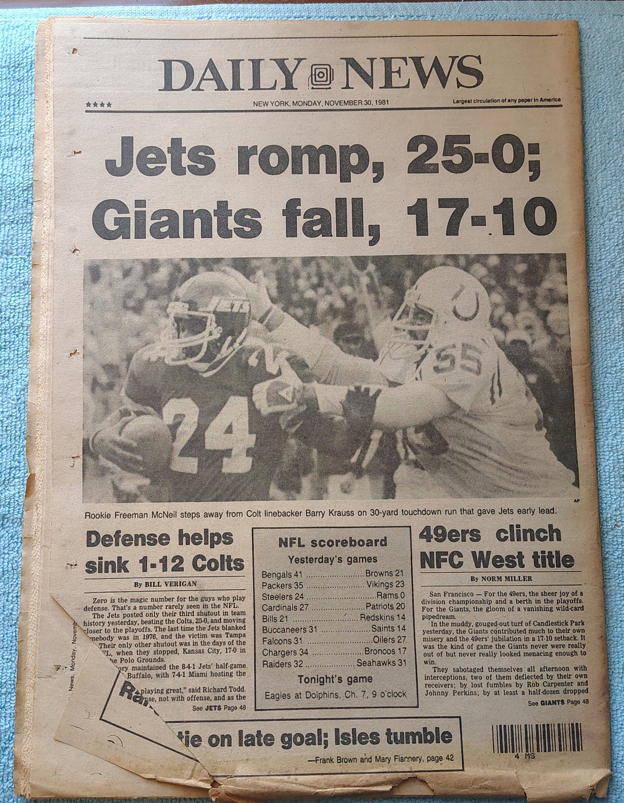 - The back page features a picture of Freeman McNeil trying to evade Colt linebacker Barry Krauss in NFL action.