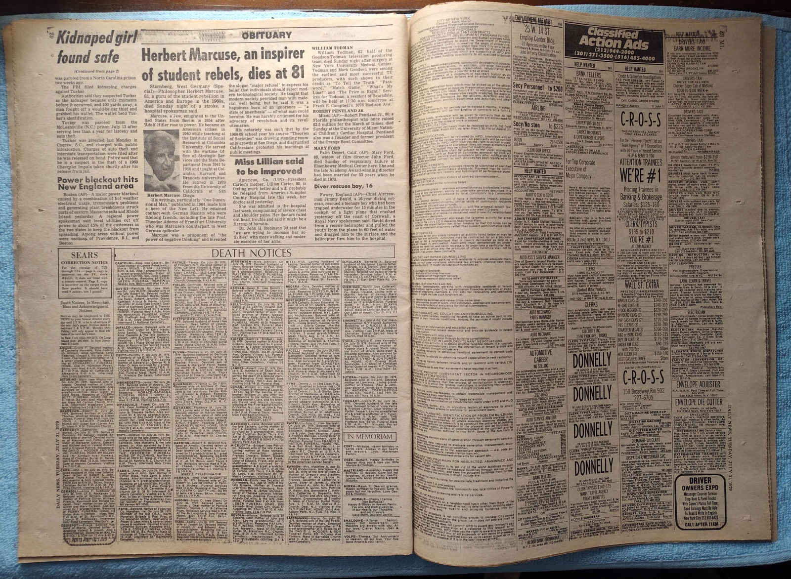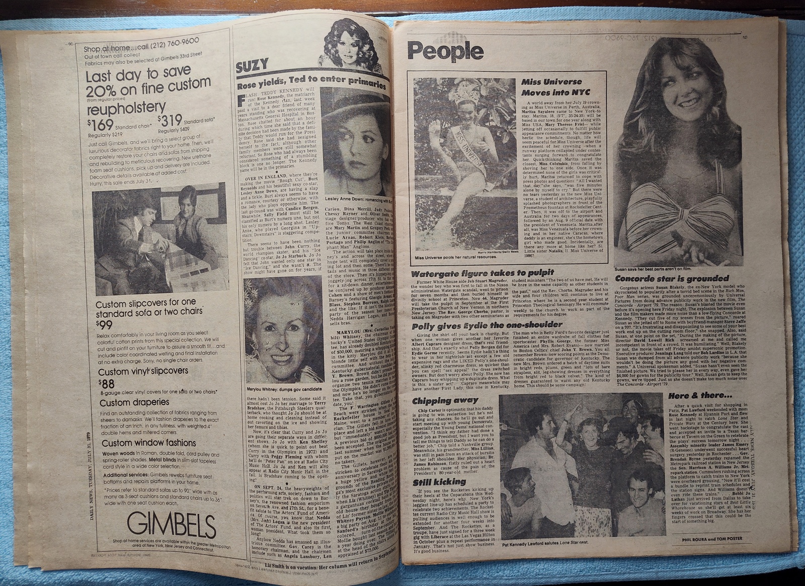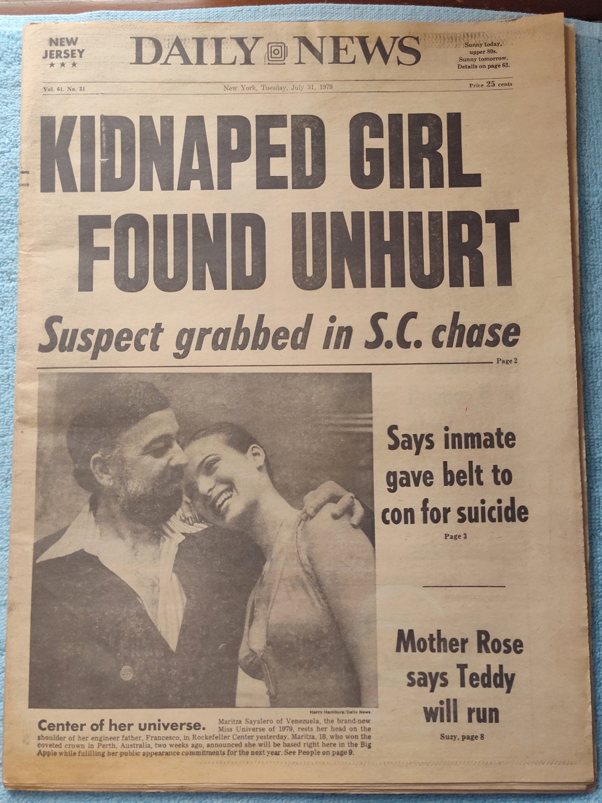 New York Daily News – Tuesday, July 31, 1979. This old newspaper features on the front page a picture of Miss Universe 1979, Maritza Sayalero with her father, Francesco basing herself in New York for the duties of Miss Universe. The headline is: ‘Kidnapped Girl Found Unhurt’ and ‘Suspect grabbed in S.C. chase’ – What you see in the pictures is what you get.