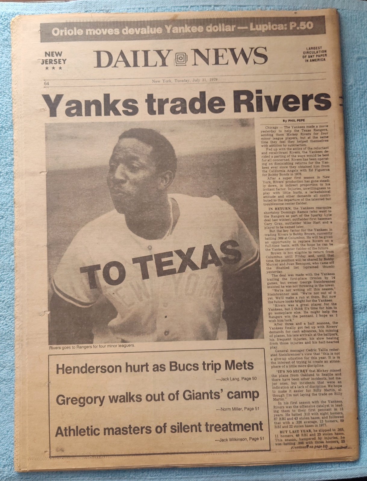 - The back page features a picture of Mickey Rivers formally of the Yankees who was traded to the Texas Rangers.