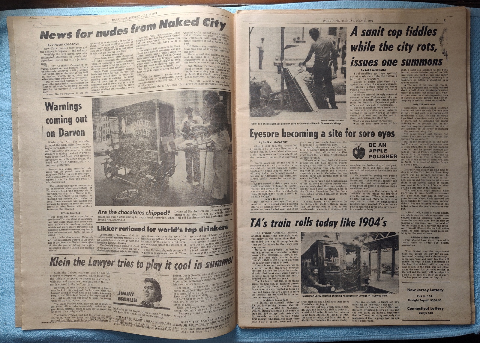 - ‘News for nudes from Naked City’ – A bill prohibiting nude sunbathing allows ‘the city’s oarks commissioner the right to set aside “a properly enclosed area for the purpose of nude sunbathing”‘