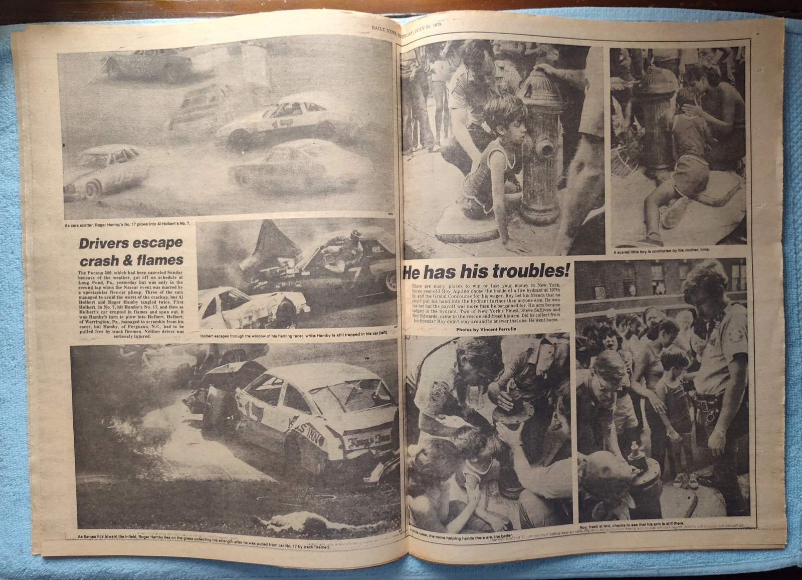 - The centerfold has several pictures of a crash scene at the Pocono 500 NASCAR race as well as pictures of seven-year-old Roy Aquino getting his arm freed from being stuck in a fire hydrant.