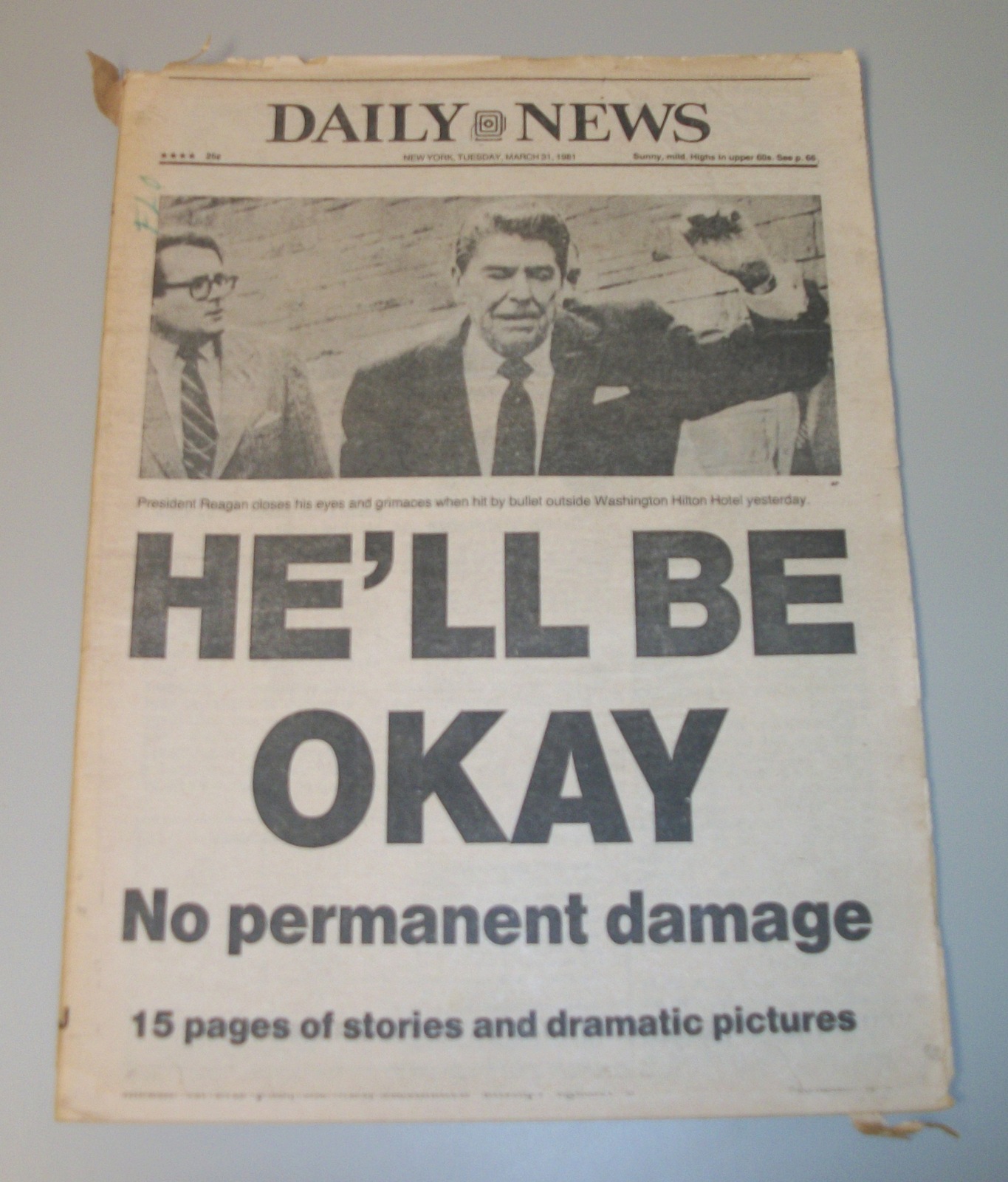 New York Daily News – Tuesday March 31, 1981. Headlines include: ‘HE’LL BE OKAY’ ‘No permanent damage’ ’15 pages of stories and dramatic pictures’ ‘President Reagan closes his eyes and grimaces when hit by bullet outside Washington Hilton Hotel yesterday.’ What you see in the pictures is what you get.