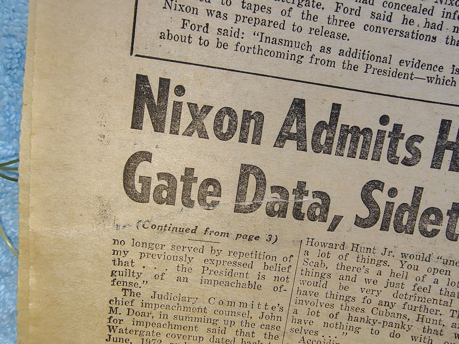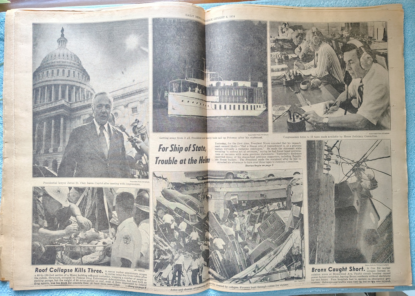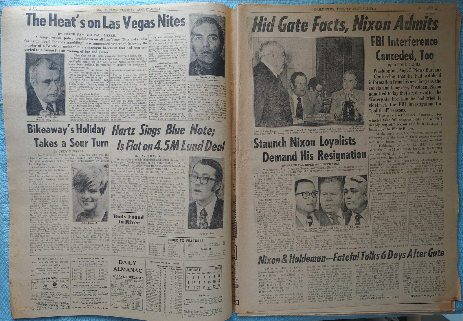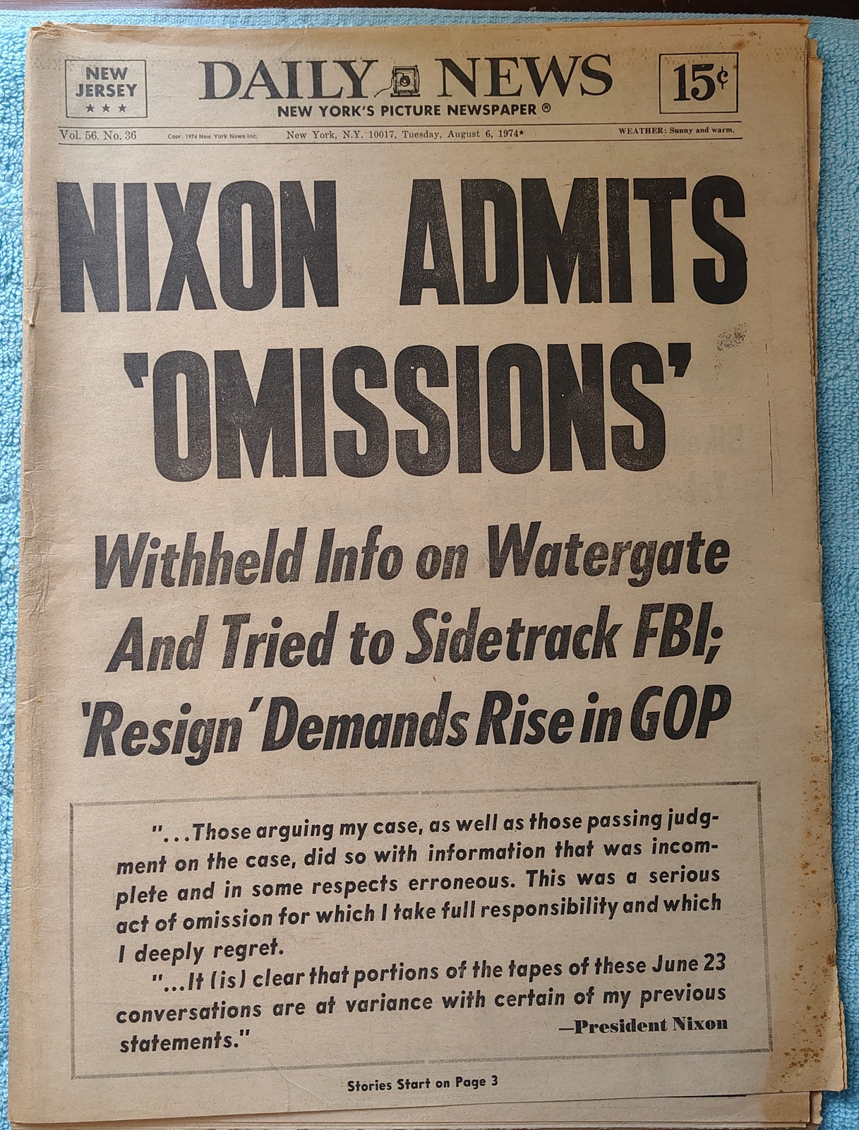 New York Daily News – Tuesday, August 6, 1974. The headline is: ‘Nixon Admits ‘Omissions” and ‘Withheld Info on Watergate And Tried to Sidetrack FBI;’Resign’ Demands Rise in GOP’ – What you see in the pictures is what you get.