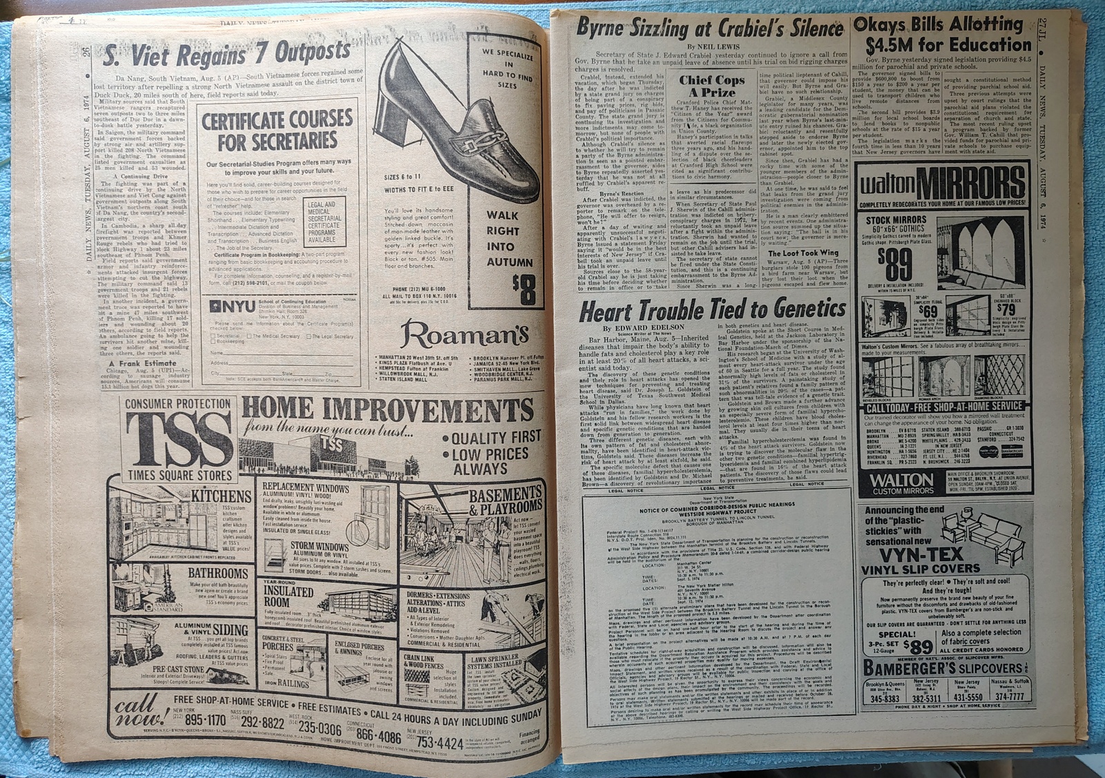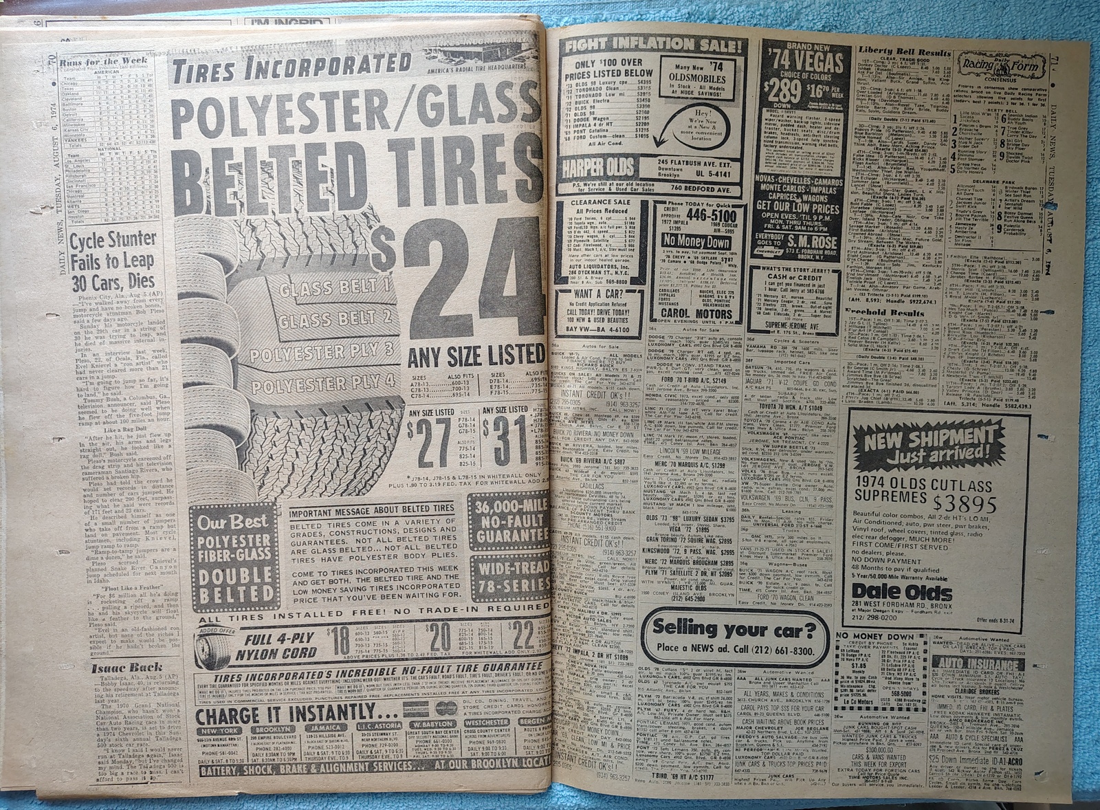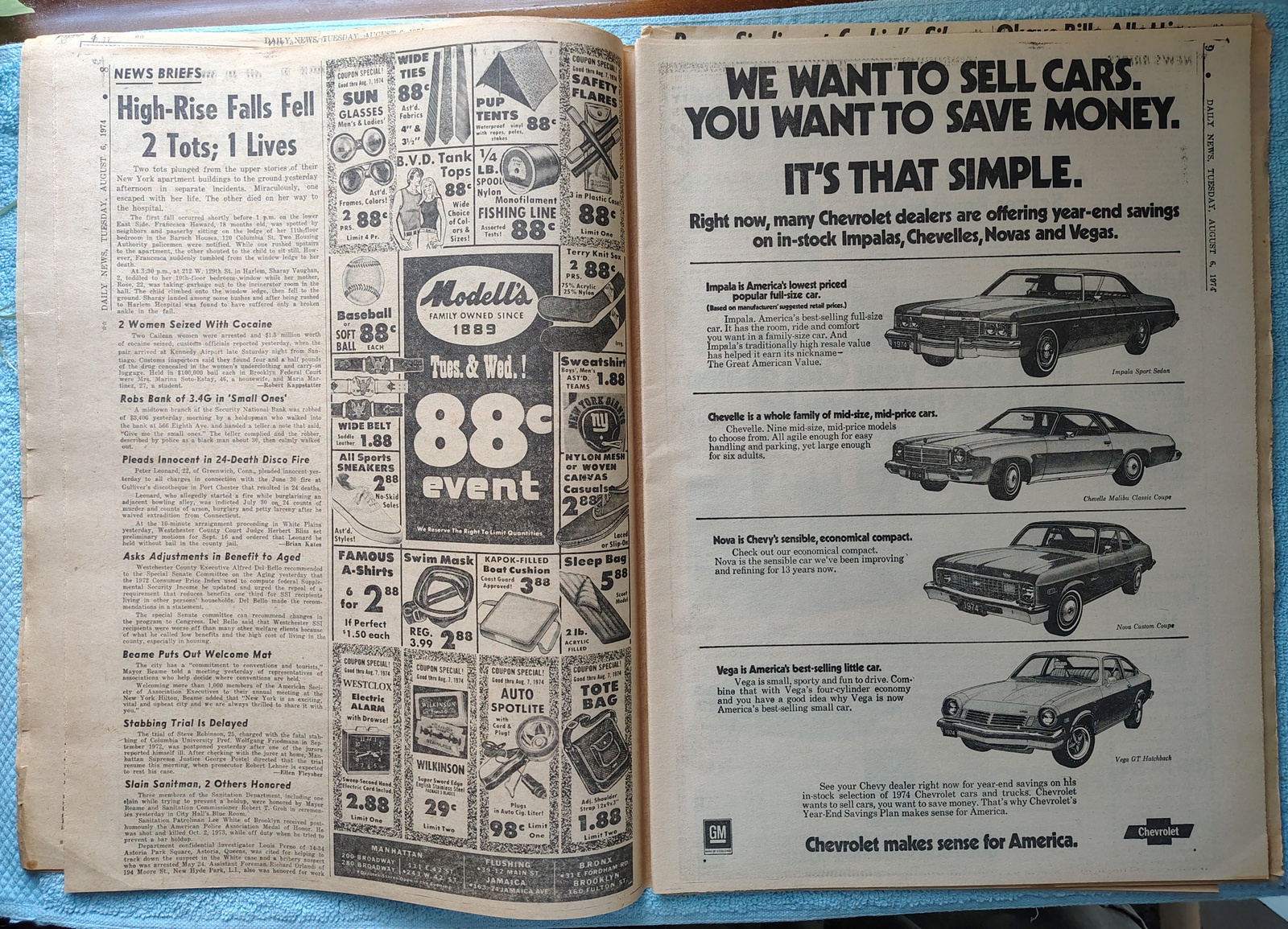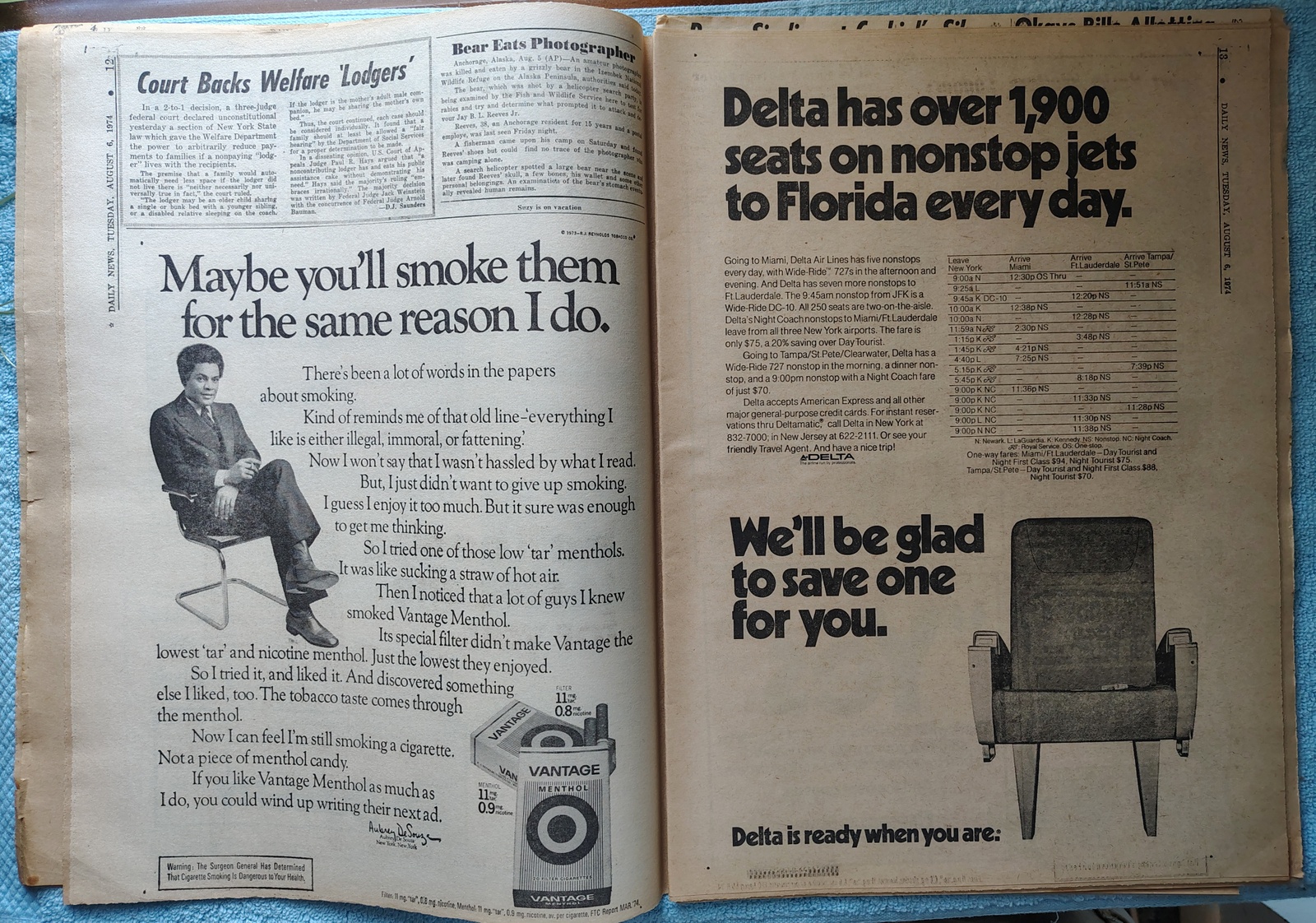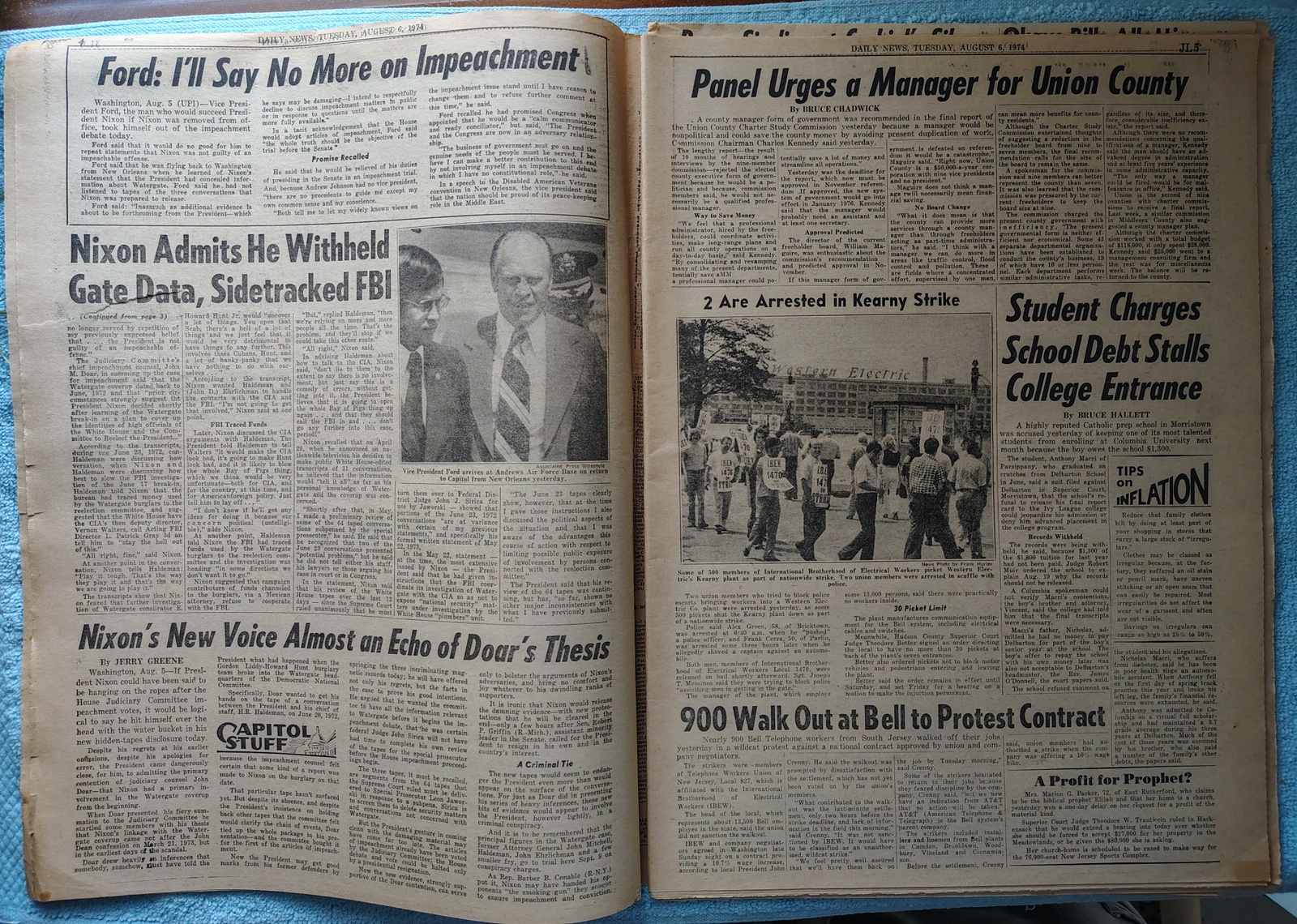 New York Daily News – Tuesday, August 6, 1974. The headline is: ‘Nixon Admits ‘Omissions” and ‘Withheld Info on Watergate And Tried to Sidetrack FBI;’Resign’ Demands Rise in GOP’ – What you see in the pictures is what you get.