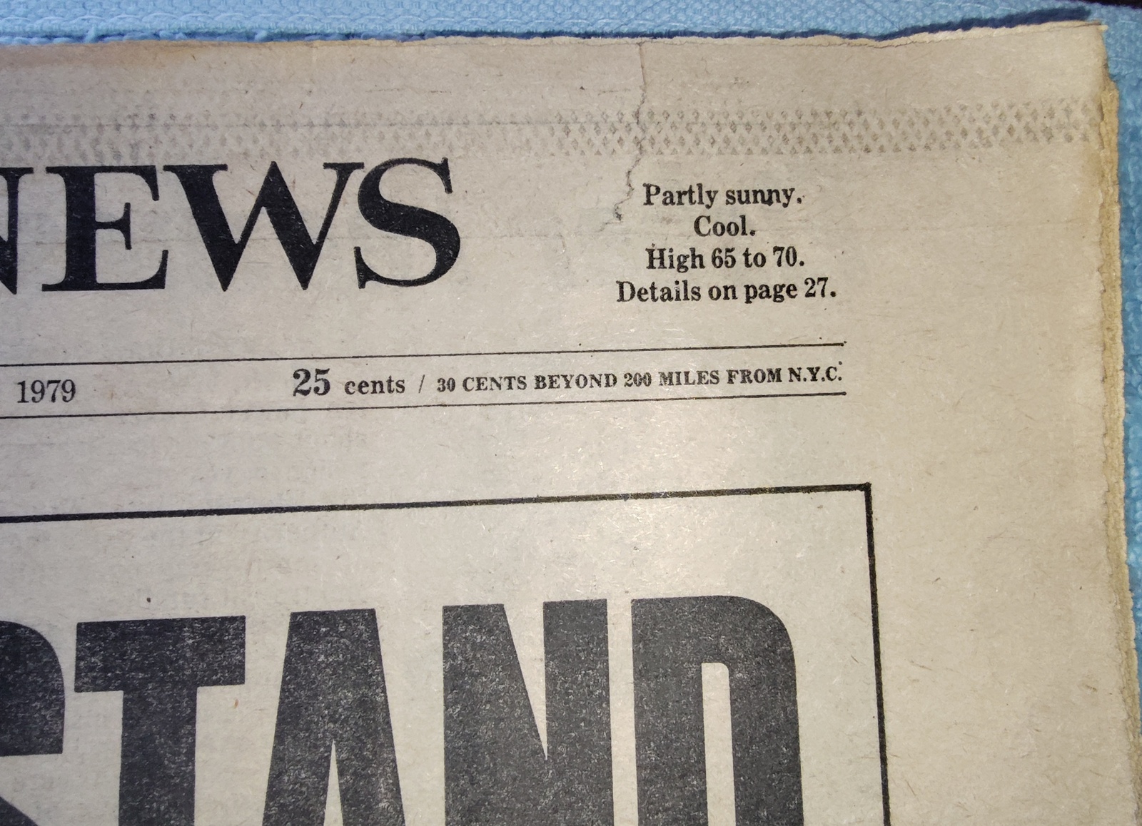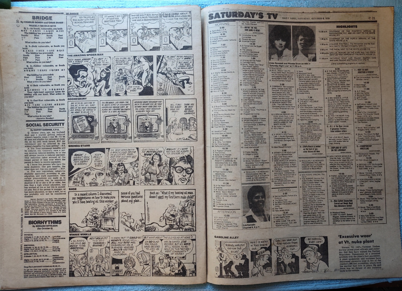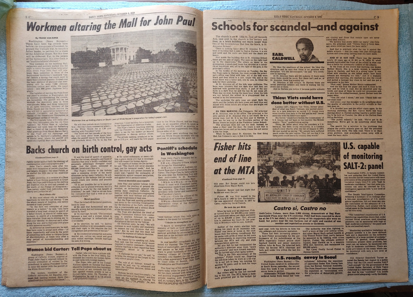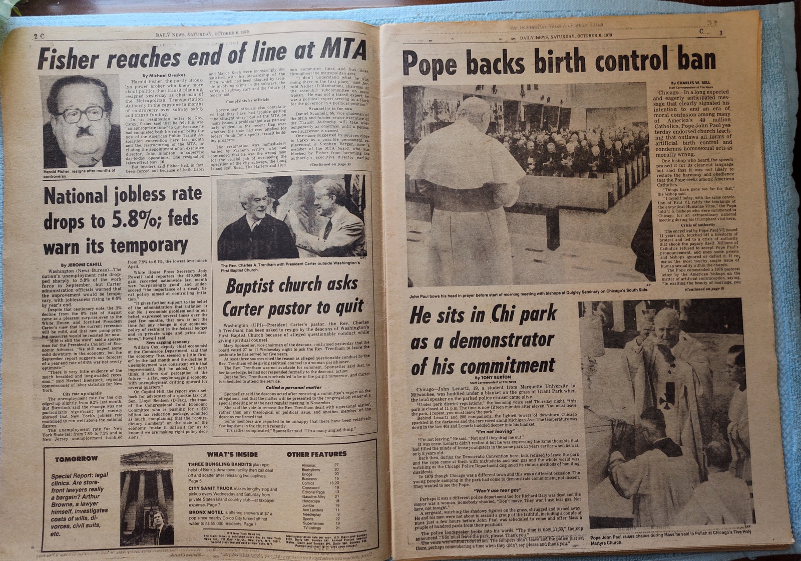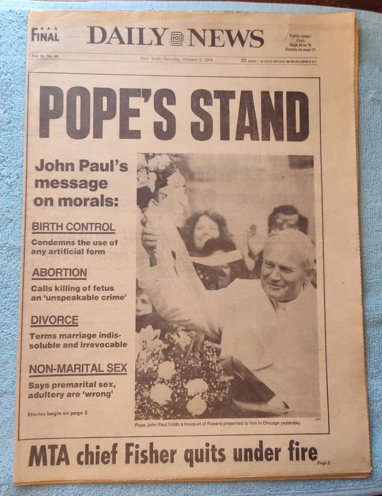 New York Daily News – Saturday, October 6, 1979. This old newspaper features on the front page a picture of Pope John Paul II holding a bouquet of flowers in Chicago. The headline is: ‘Pope’s Stand’ and ‘John Paul’s message on morals: Birth Control, Abortion, Divorce, Non-Marital Sex’ – What you see in the pictures is what you get.