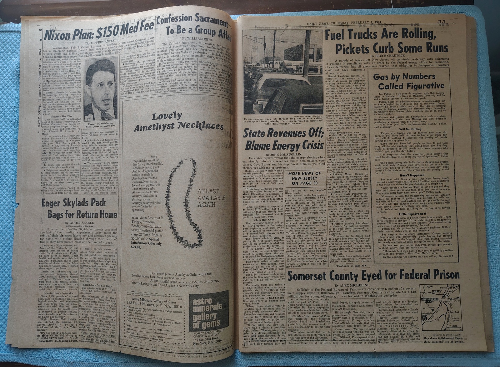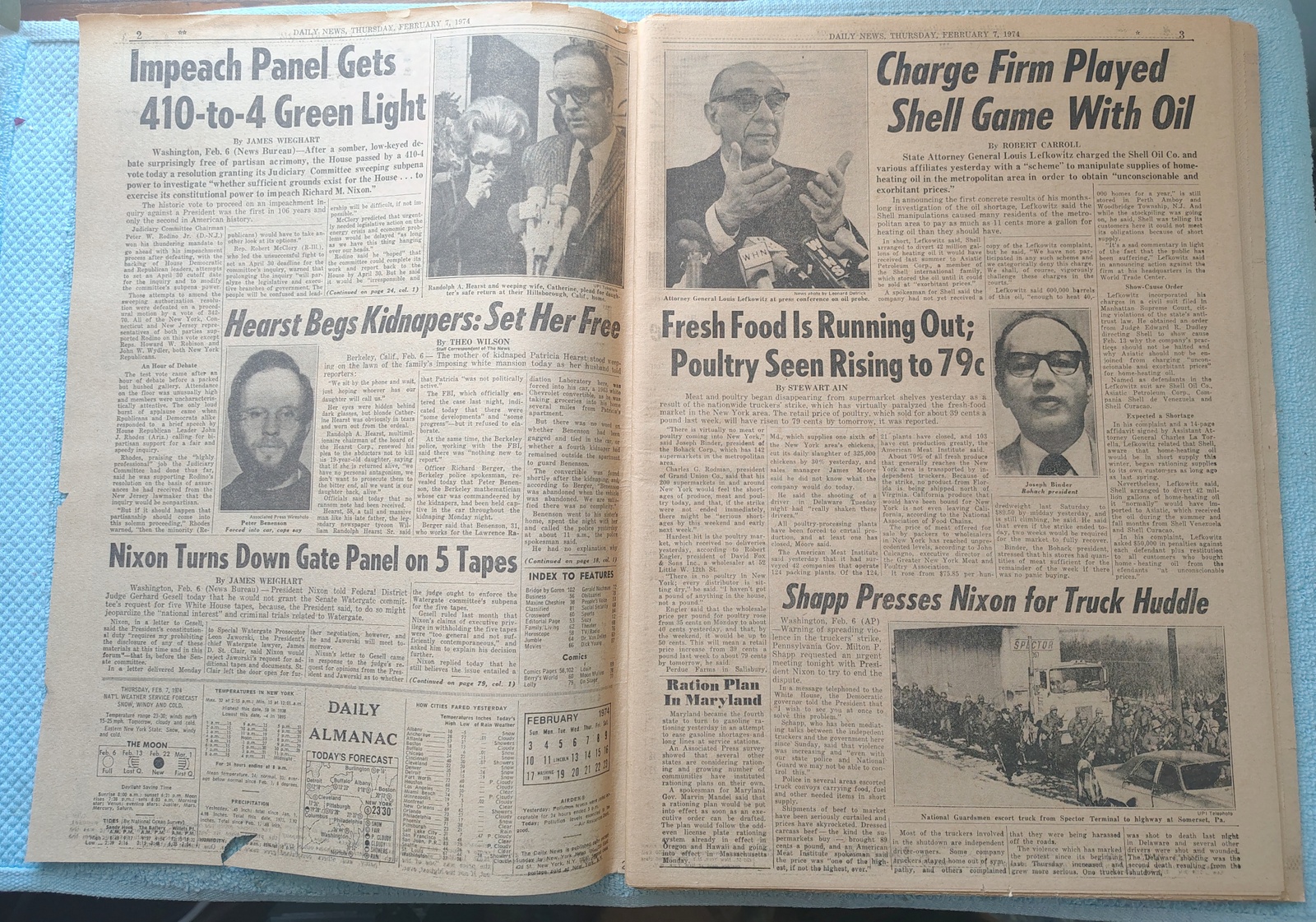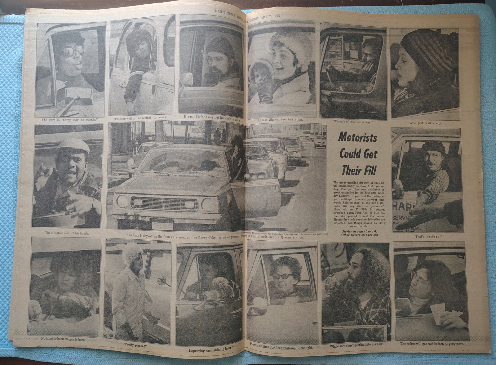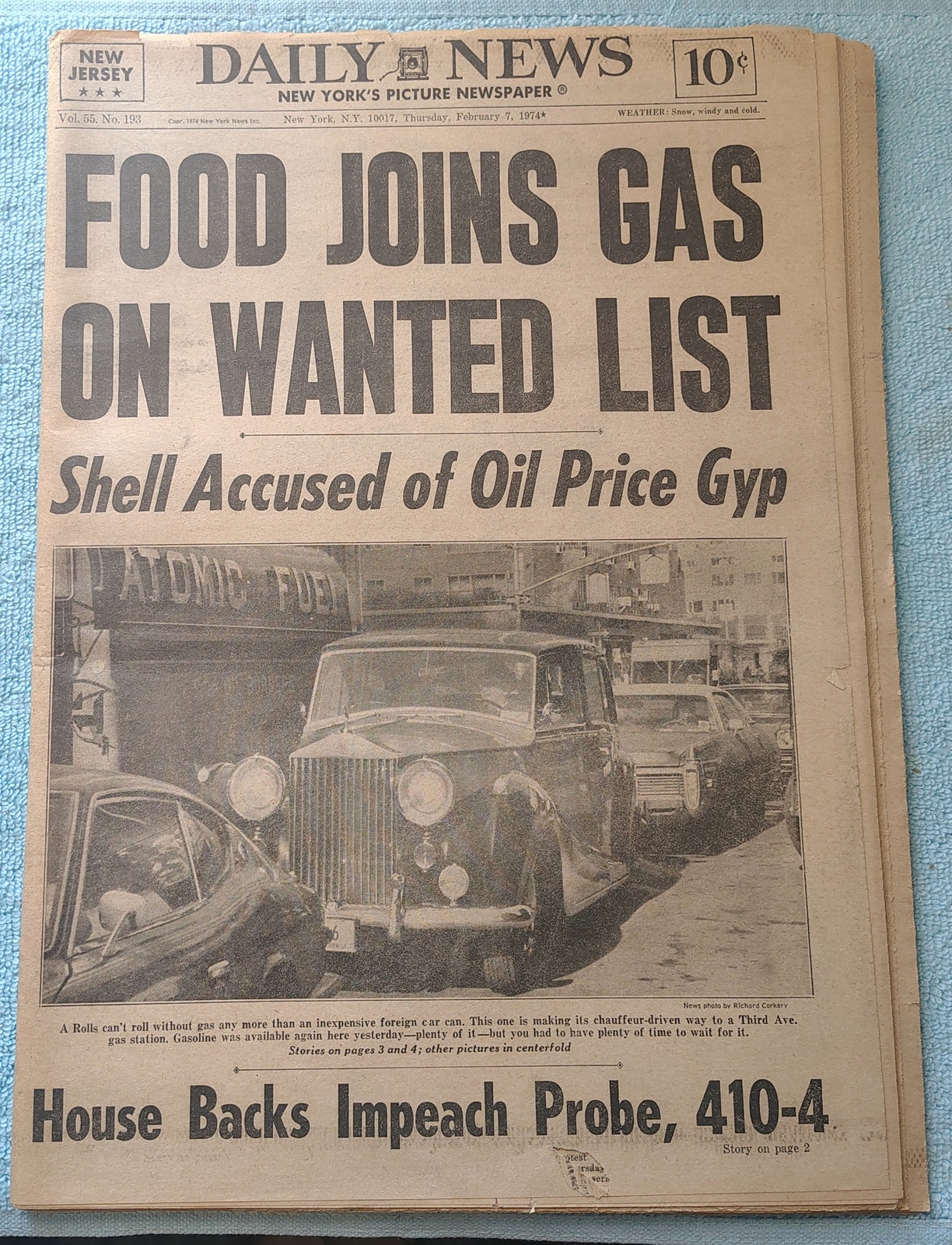New York Daily News – Thursday, February 7, 1974. The headline is: ‘Food Joins Gas On Wanted List’ ‘Shell Accused of Oil Price Gyp’ ‘House Backs Impeach Probe’ The front page features a picture of a Rolls Royce waiting in line to purchase fuel at a 3rd Ave gas station. What you see in the pictures is what you get.