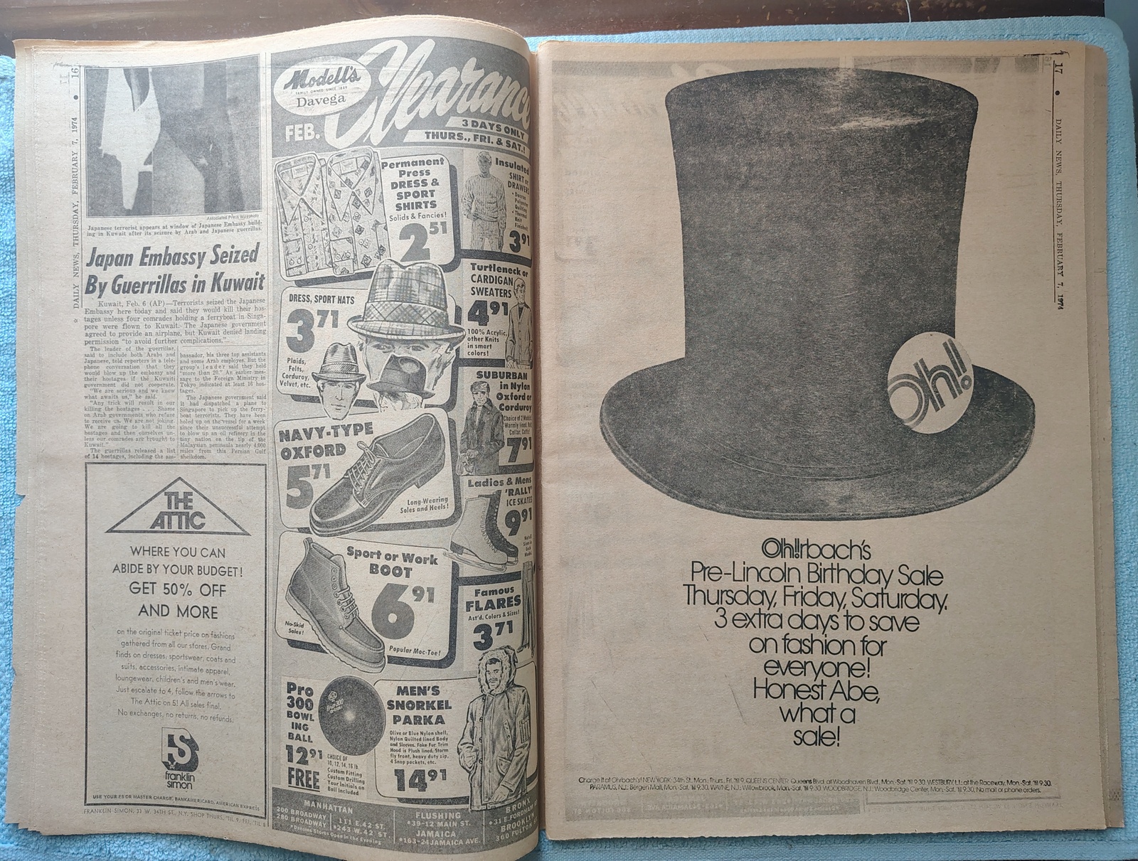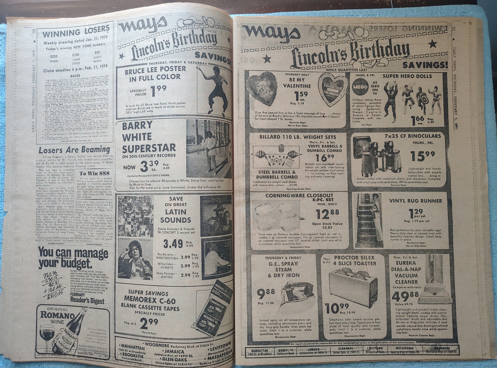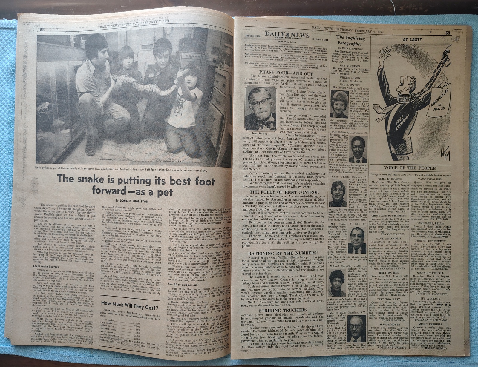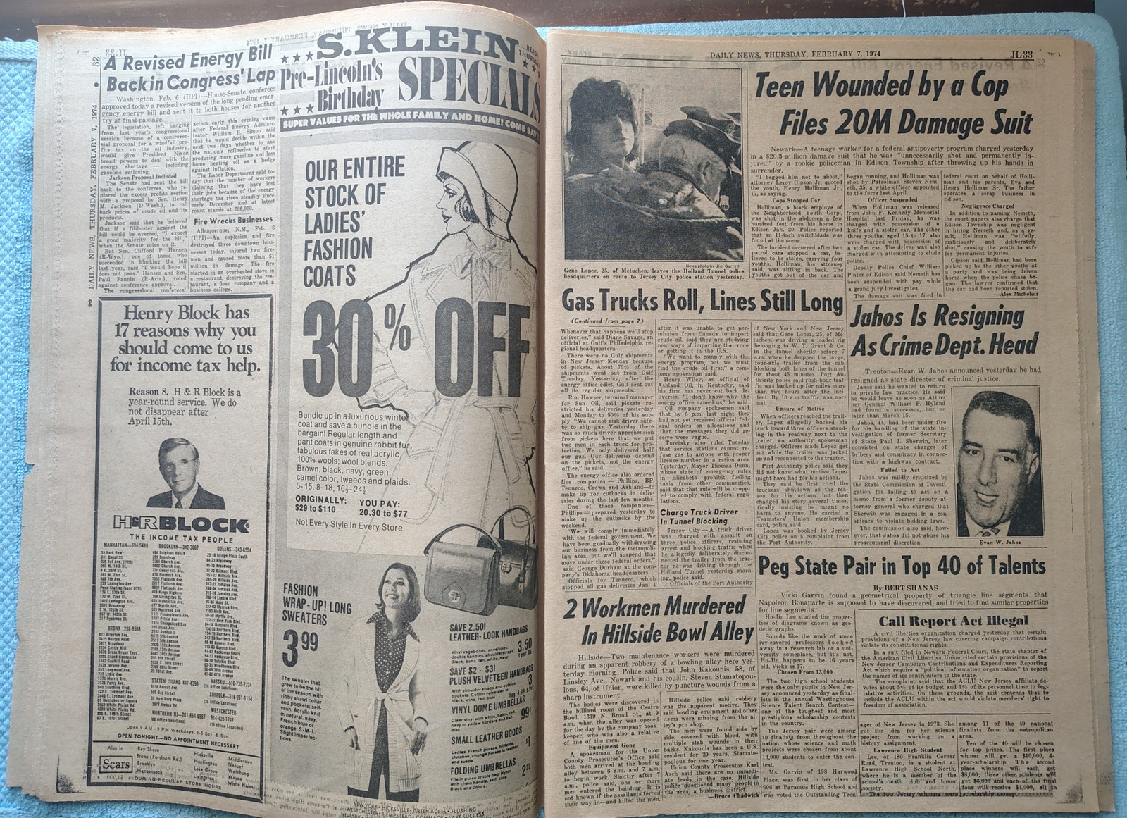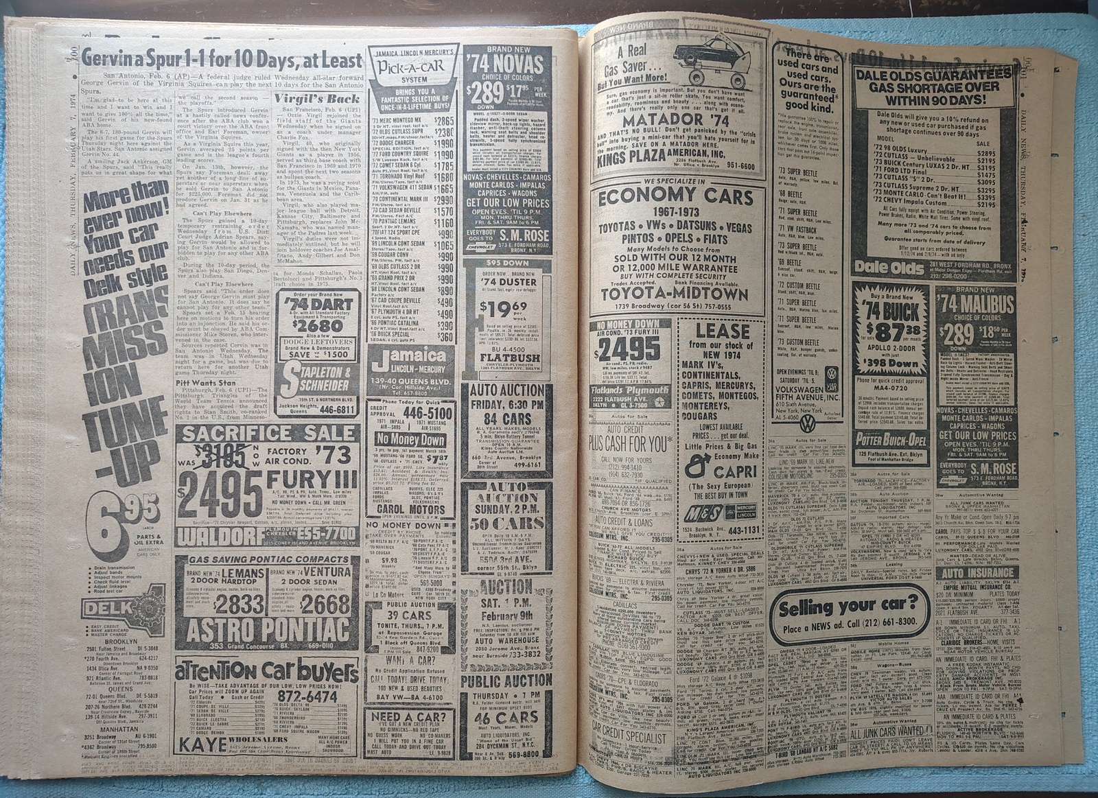 New York Daily News – Thursday, February 7, 1974. The headline is: ‘Food Joins Gas On Wanted List’ ‘Shell Accused of Oil Price Gyp’ ‘House Backs Impeach Probe’ The front page features a picture of a Rolls Royce waiting in line to purchase fuel at a 3rd Ave gas station. What you see in the pictures is what you get.