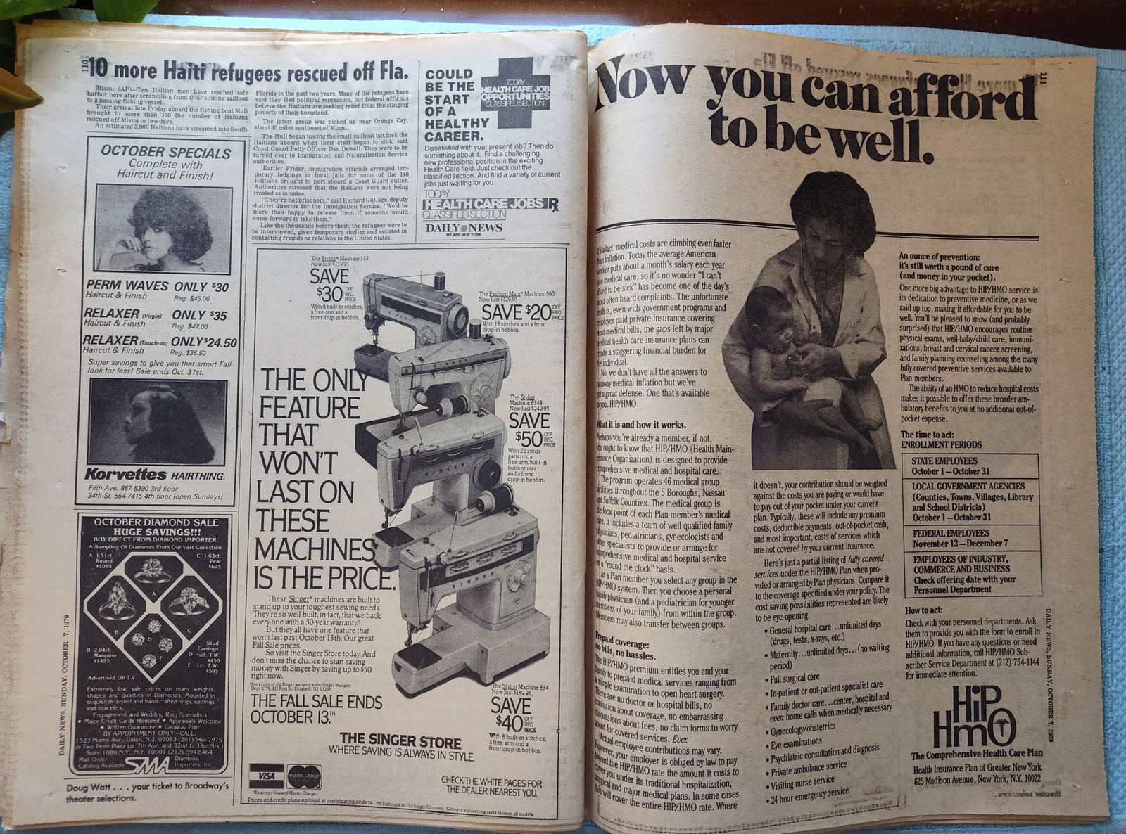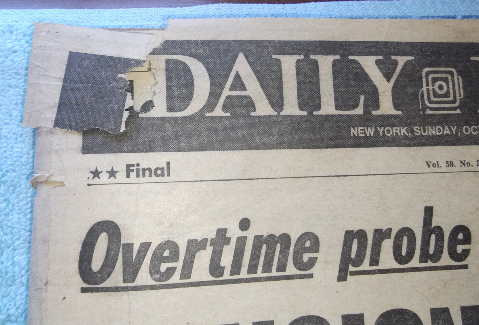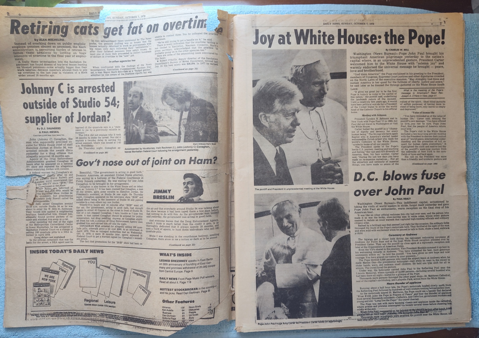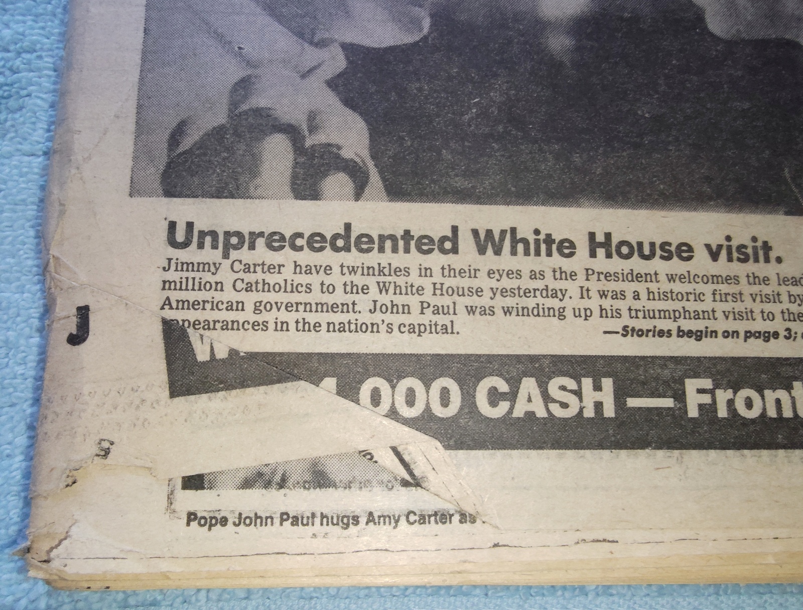 New York Daily News – Sunday, October 7, 1979. This old newspaper features on the front page a picture of Pope John Paul II visiting with President Jimmy Carter. The headline is: ‘Overtime Probe Bares: Pension Ripoff By Sanit Bosses’ – What you see in the pictures is what you get. There is some significant wear / tears on the front page – LOOK AT THE PICTURES!