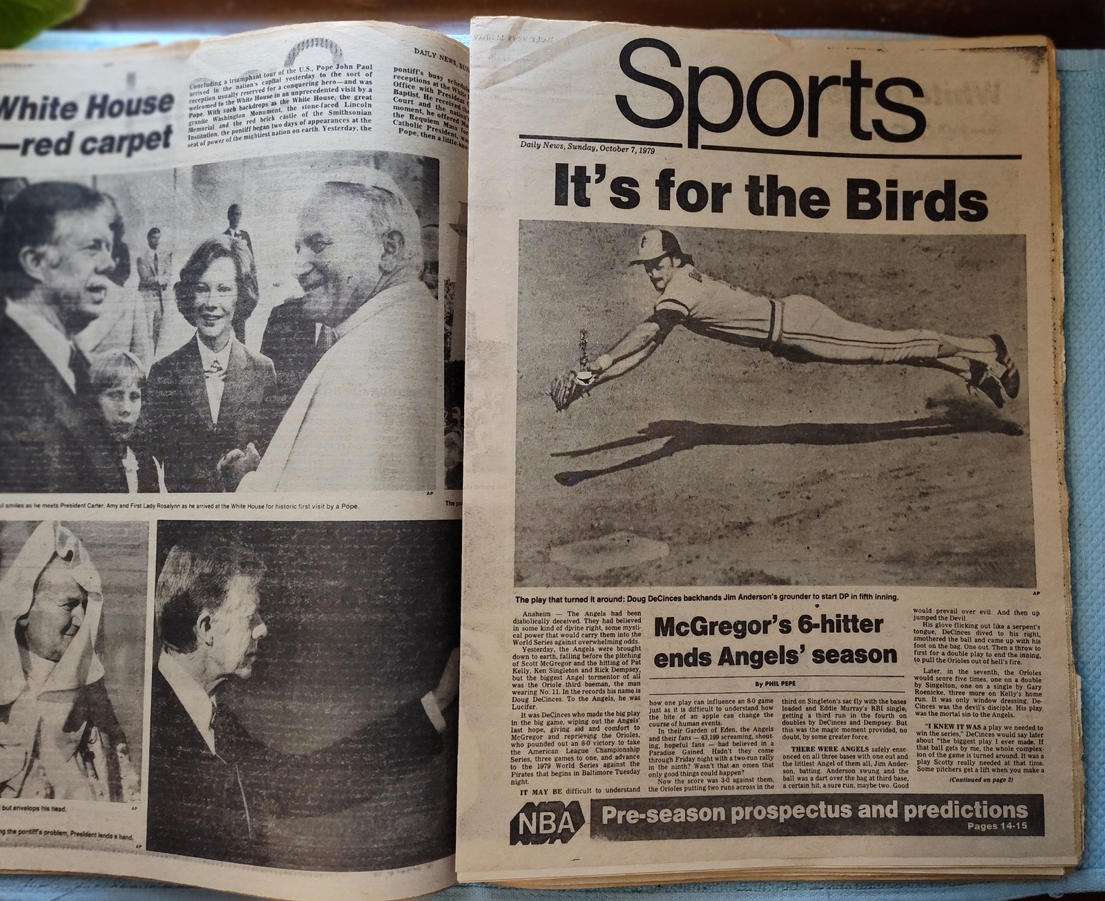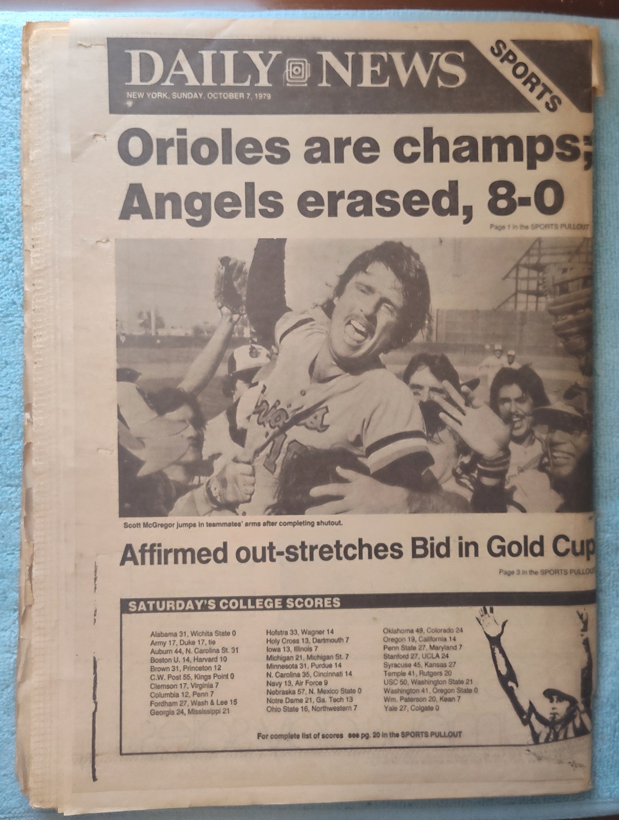 < - The back page features a picture of Scott McGregor celebrating the Orioles shutout of the Angels for the American League Championship.