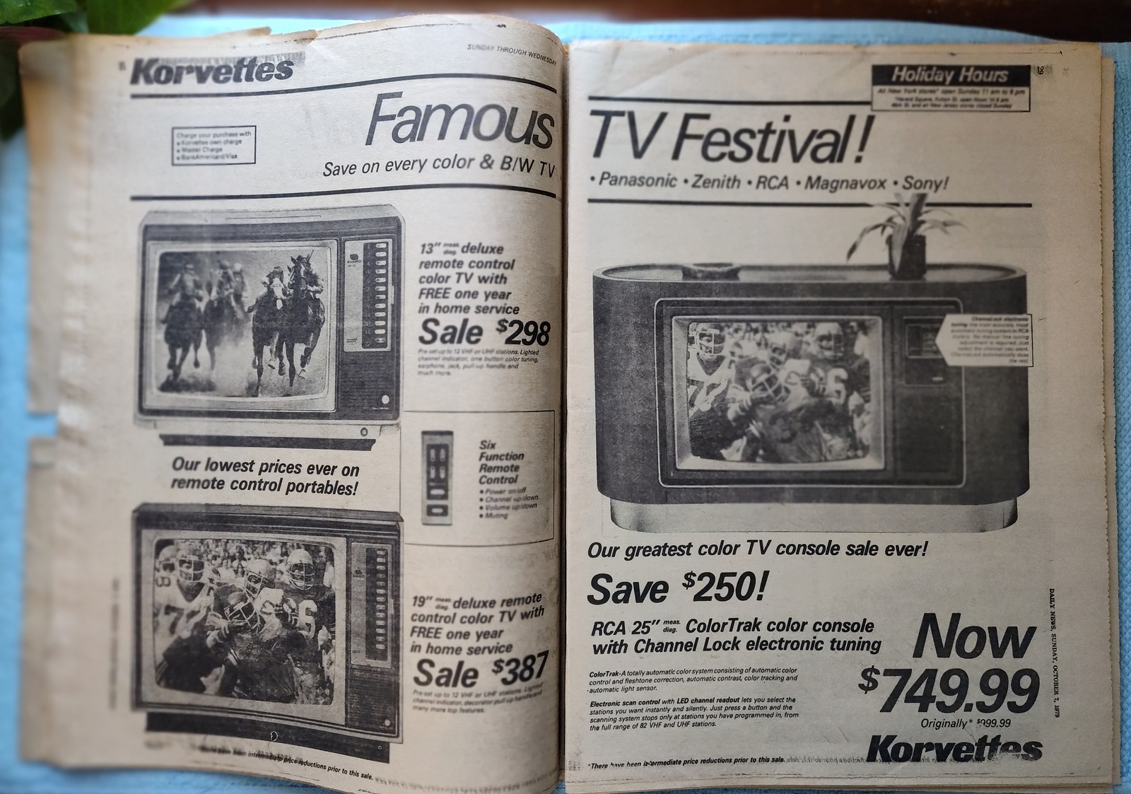 - Korvettes has an ‘RCA 25″ ColorTrak color console with Channel Lock electronic tuning’ for only $749.99.