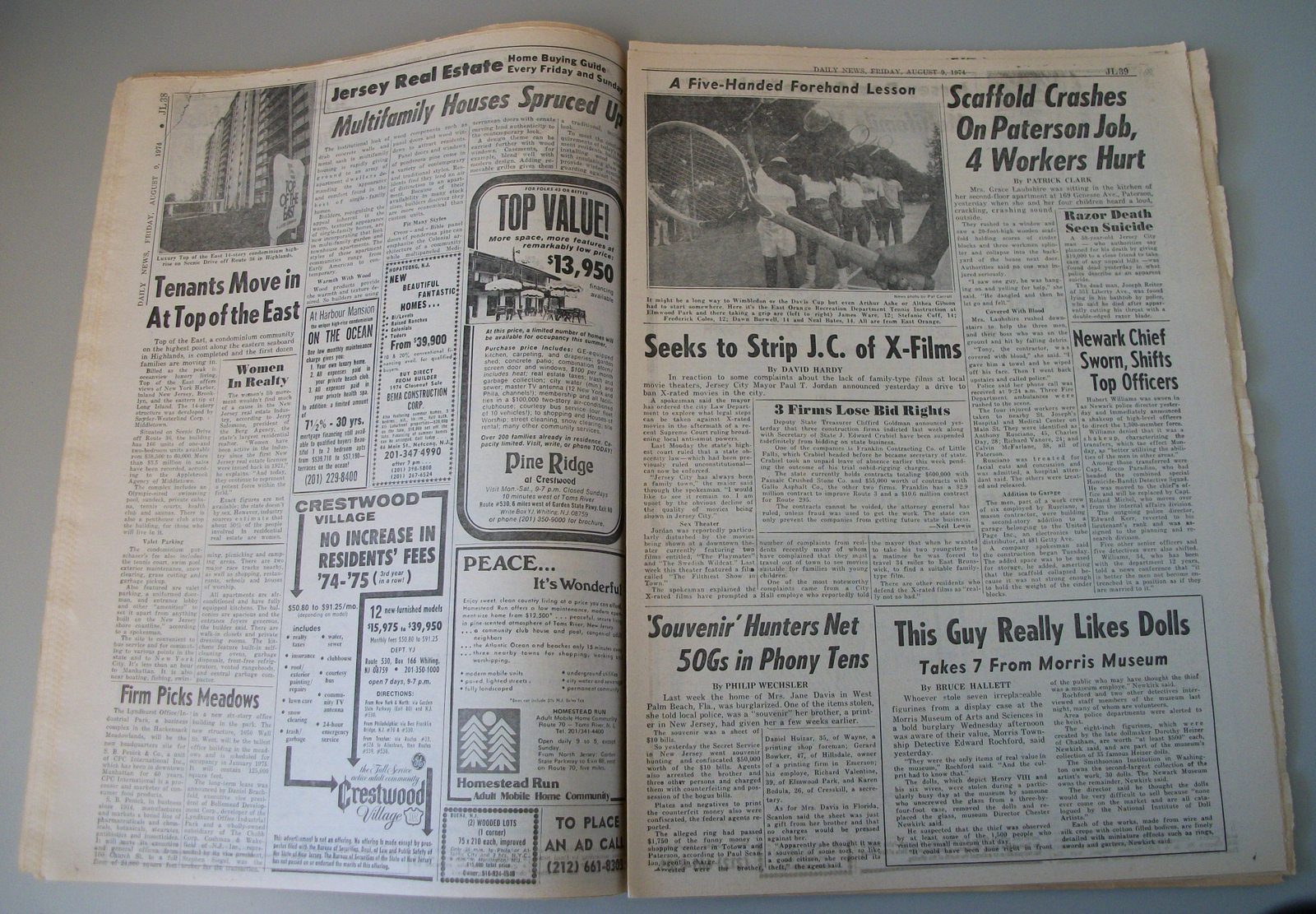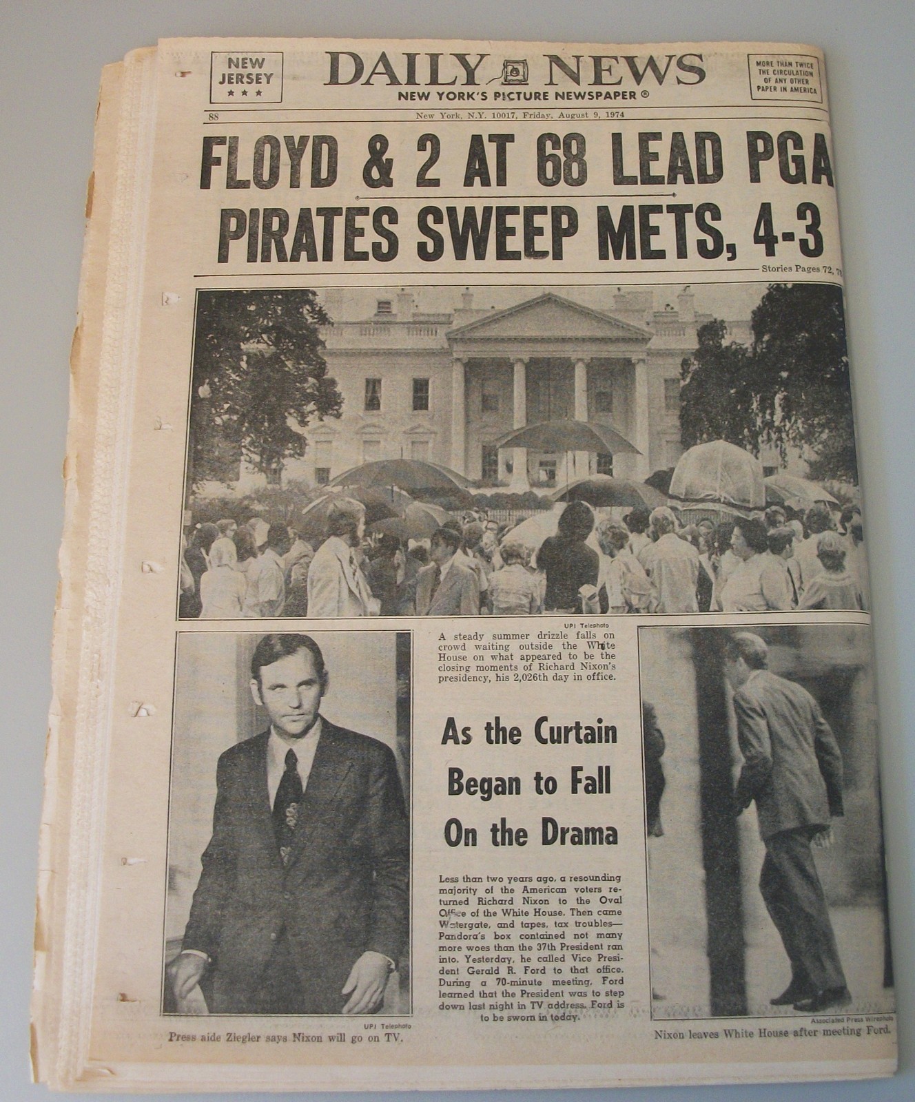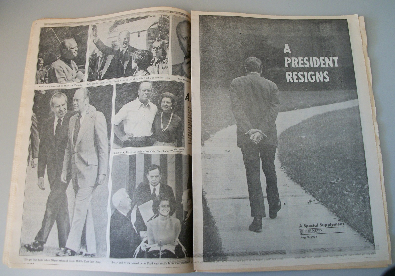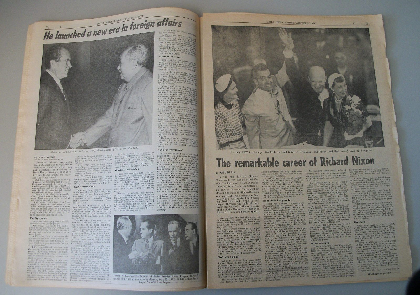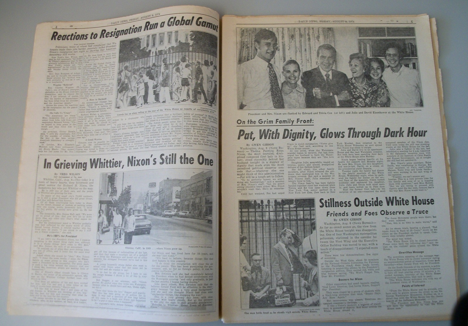 New York Daily News – Friday August 9, 1974 What you see in the pictures is what you get: all 88 pages are included.. There are some minor tears and wear around the edges – LOOK AT THE PICTURES! This is a very interesting old newspaper which features as the front page story: NIXON RESIGNS – Acts in ‘Interest of Nation,’ Asks For End to Bitterness; Ford Will Take Oath At Noon, Kissinger Agrees to Stay On.