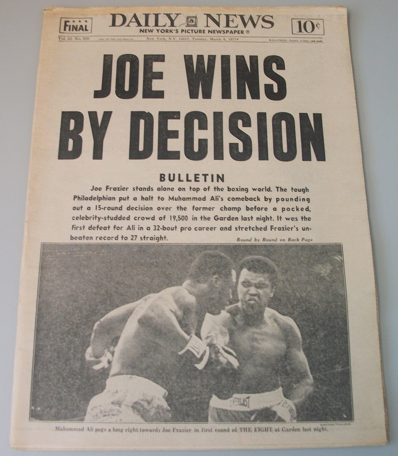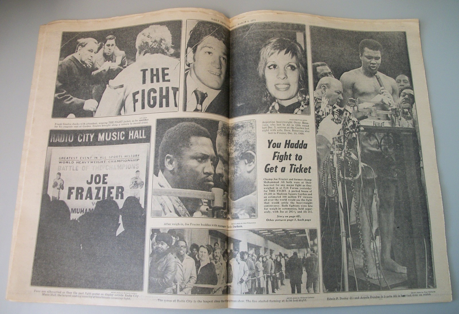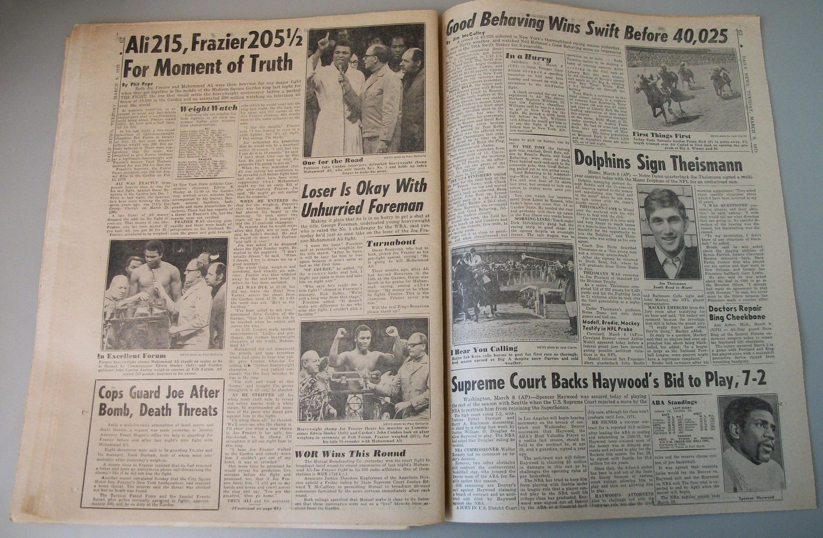 New York Daily News – Tuesday, March 9, 1971. This old newspaper features on the front page a picture of Mohammad Ali’s comeback fight against Joe Frazier where Joe Frazier won in a decision after 15 rounds. What you see in the pictures is what you get.