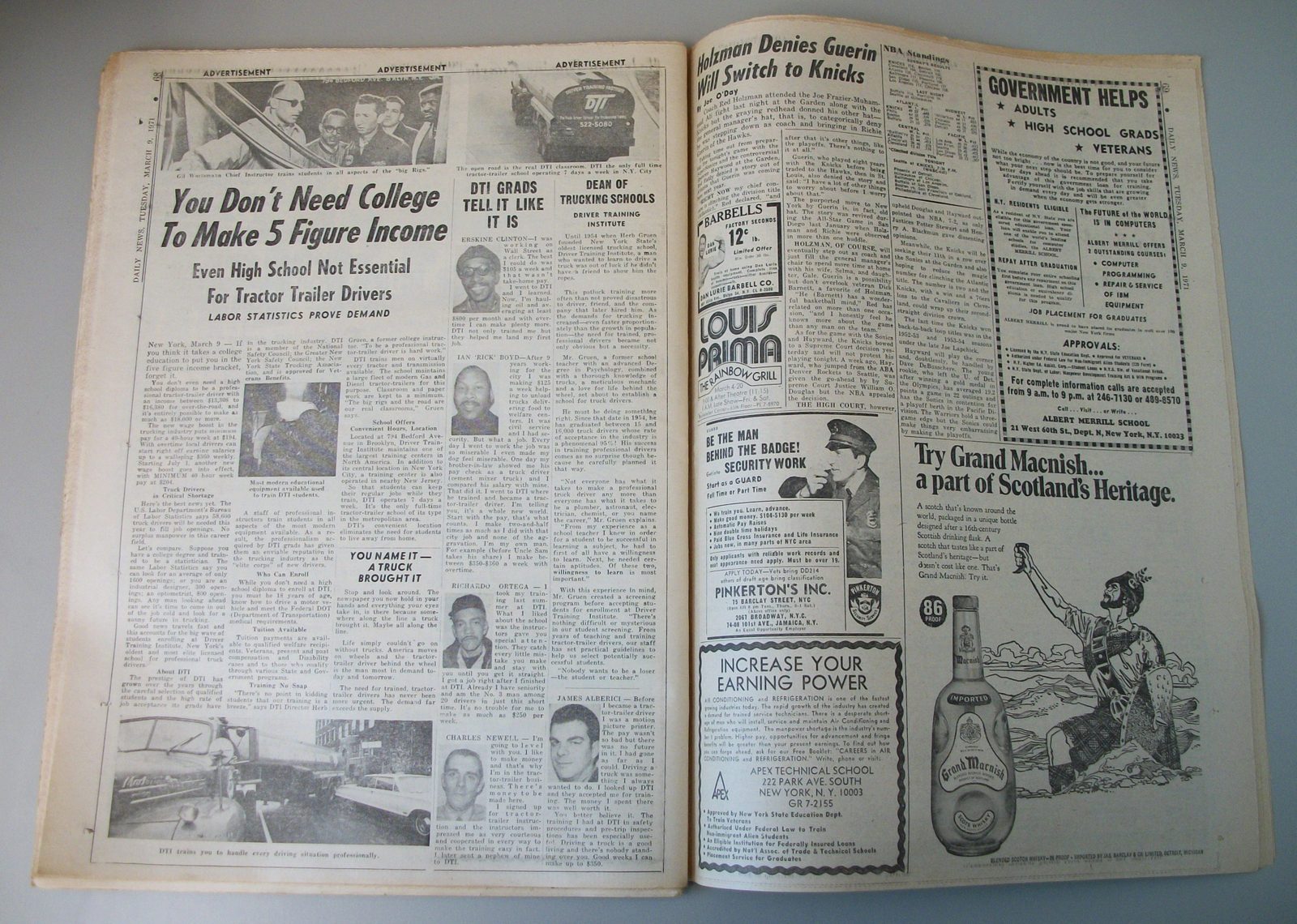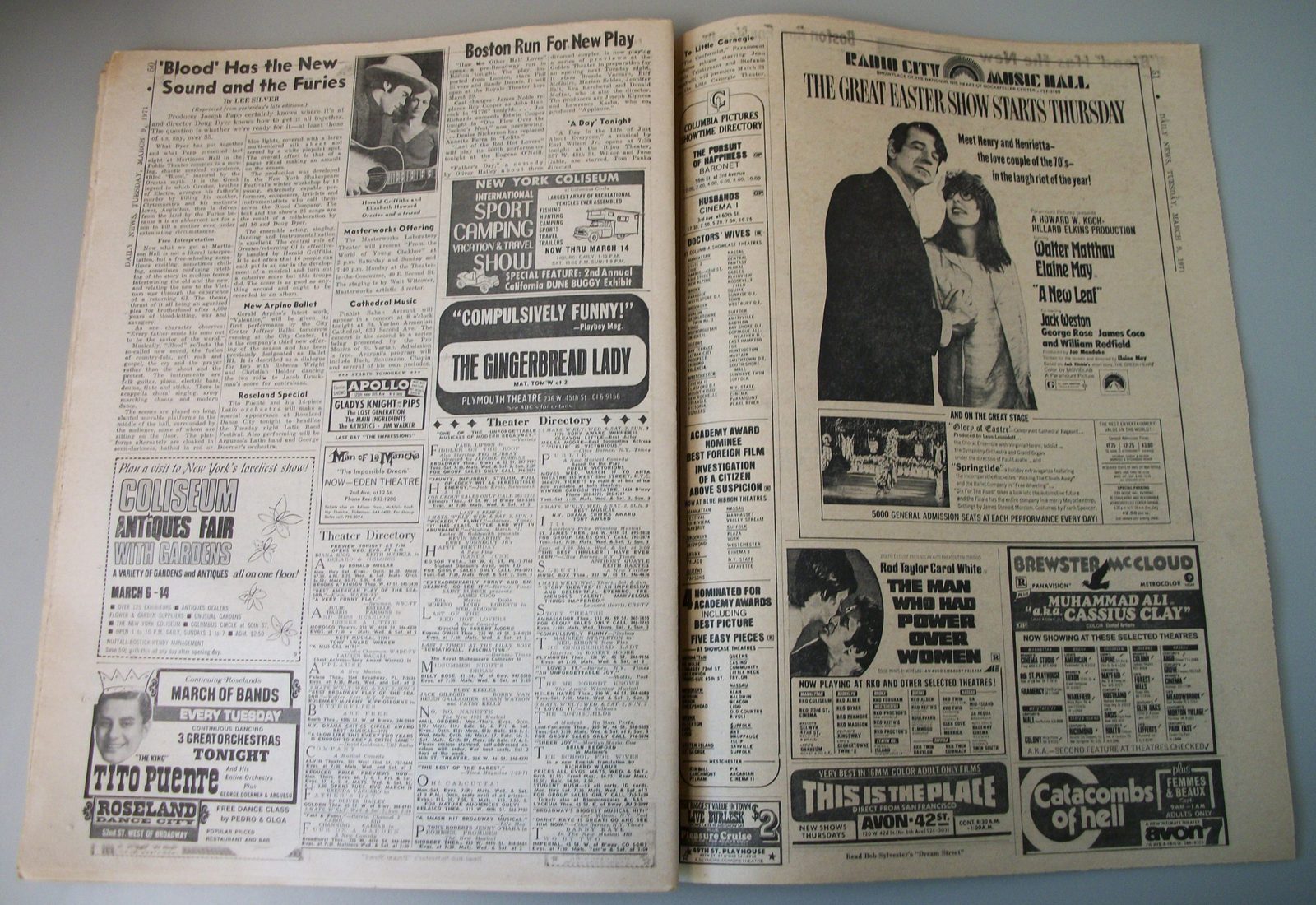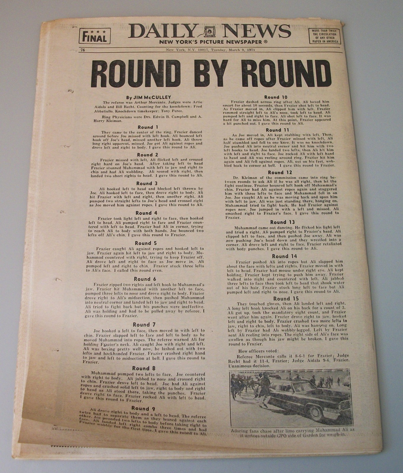 New York Daily News – Tuesday, March 9, 1971. This old newspaper features on the front page a picture of Mohammad Ali’s comeback fight against Joe Frazier where Joe Frazier won in a decision after 15 rounds. What you see in the pictures is what you get.