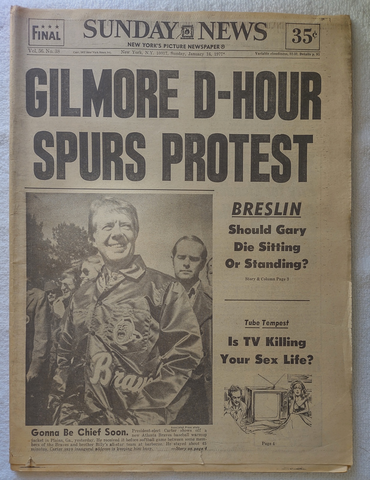 New York Daily News – Sunday, January 16, 1977. What you see in the pictures is what you get. This is a very interesting old newspaper which features as the front page story: Gilmore (Gary) D-Hour Spurs Protest