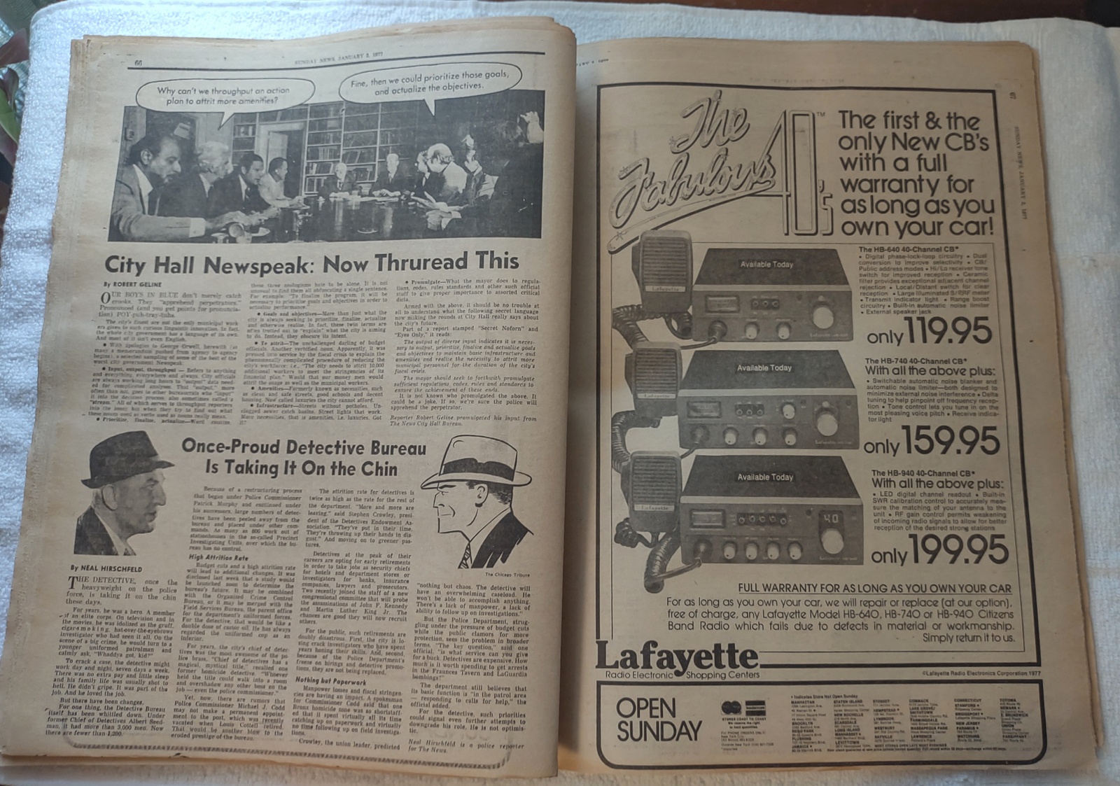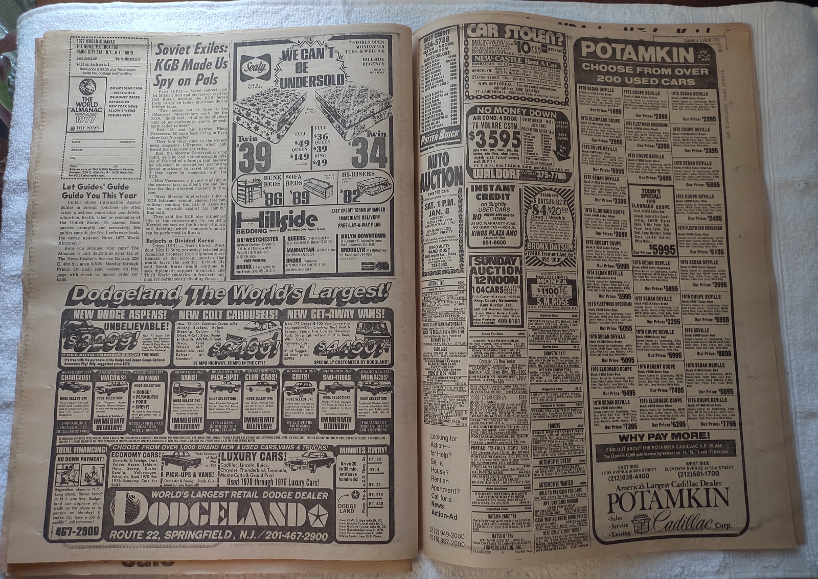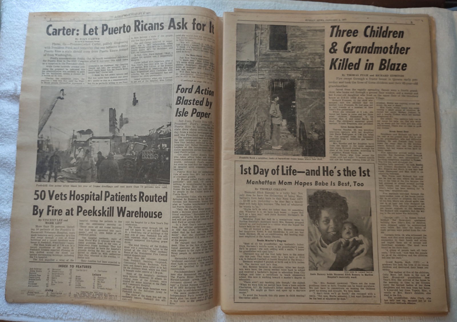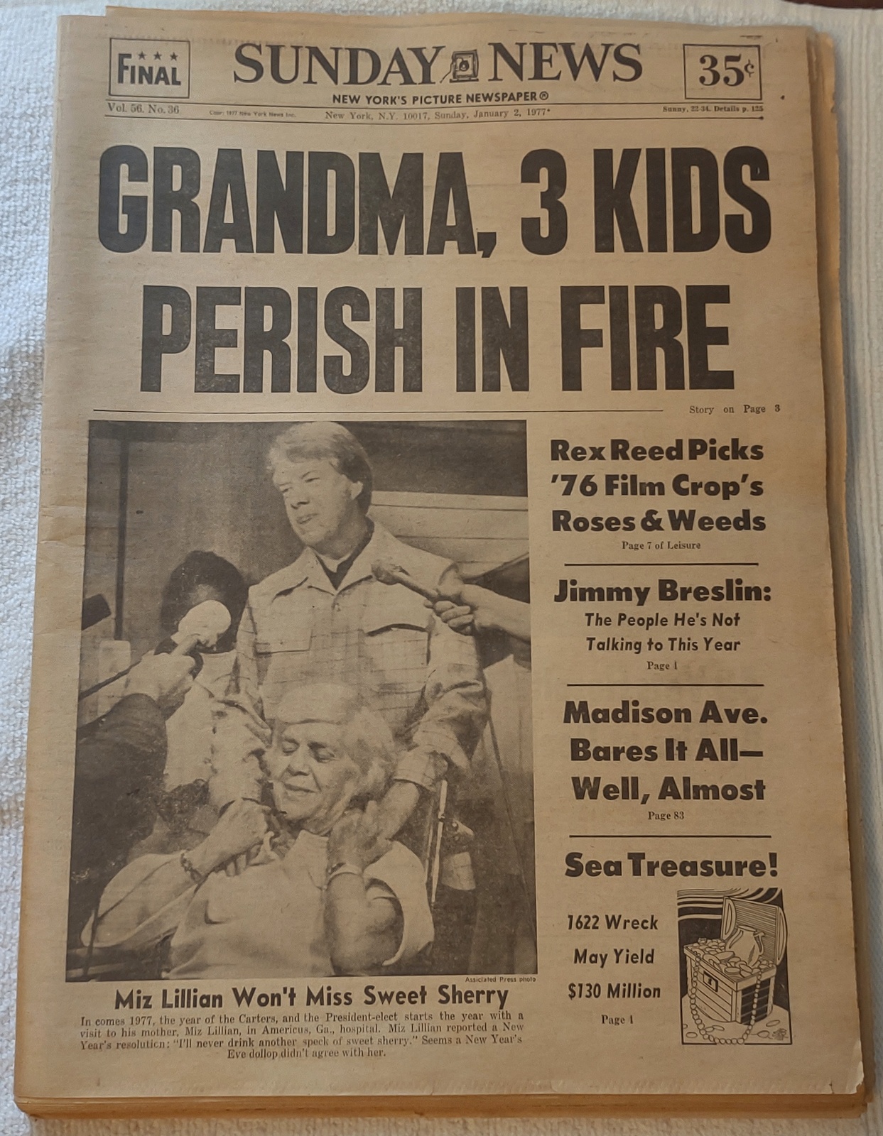New York Daily News – Sunday, January 2, 1977. What you see in the pictures is what you get. This is a very interesting old newspaper which features as the front page story: Grandma, 3 Kids Perish in Fire