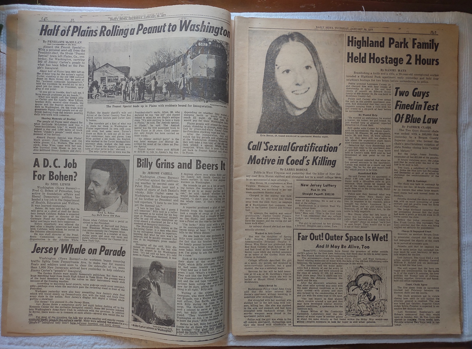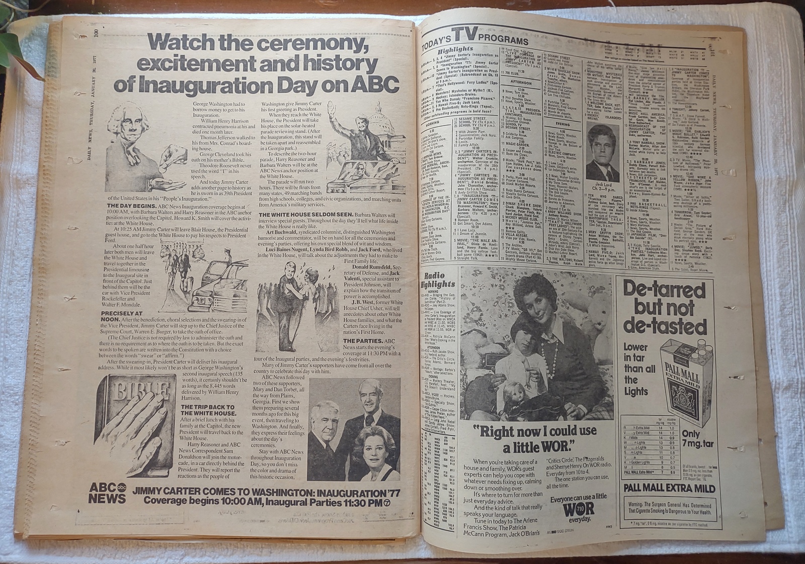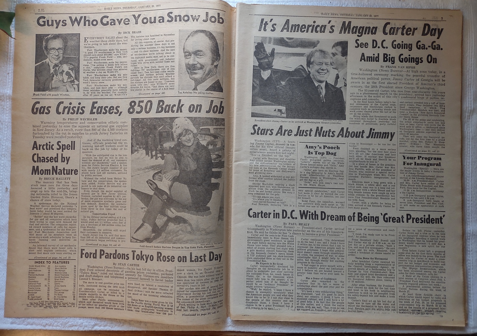 New York Daily News (New Jersey Edition) – Thursday, January 20, 1977. What you see in the pictures is what you get. This is a very interesting old newspaper which features as the front page story: N.J. Gas Crunch Eases Slightly, Carter Will Take Oath at Noon