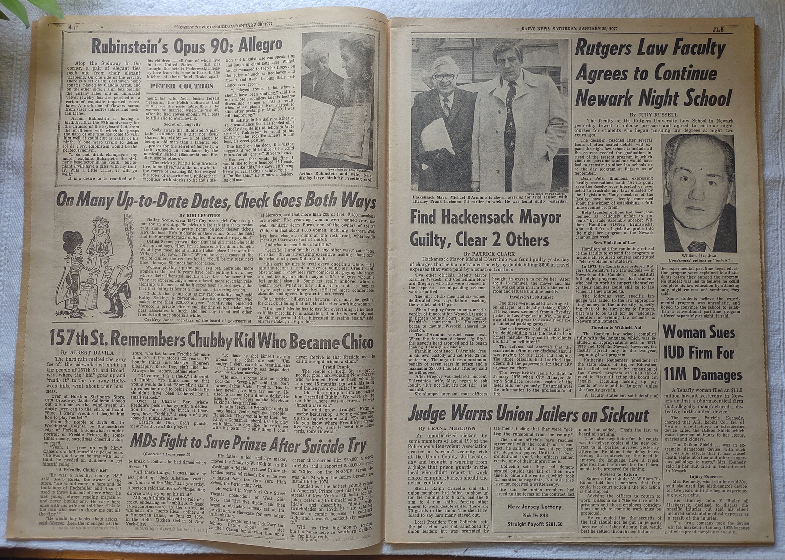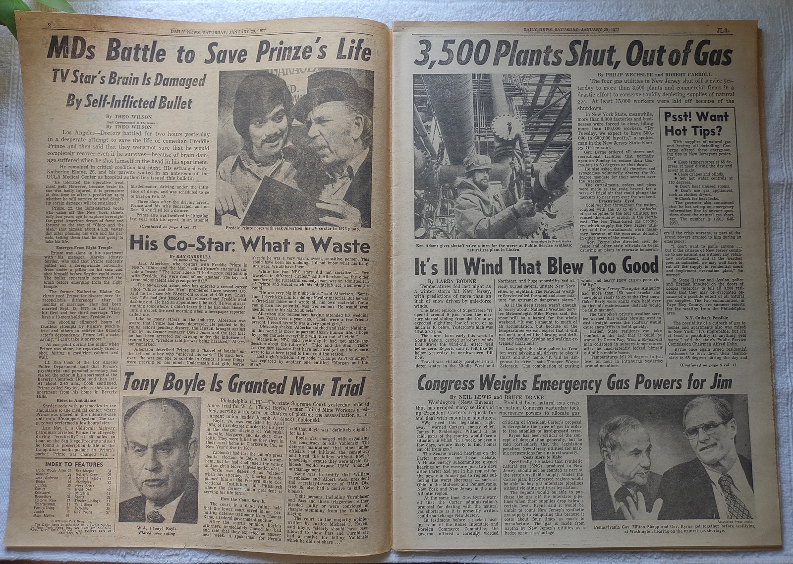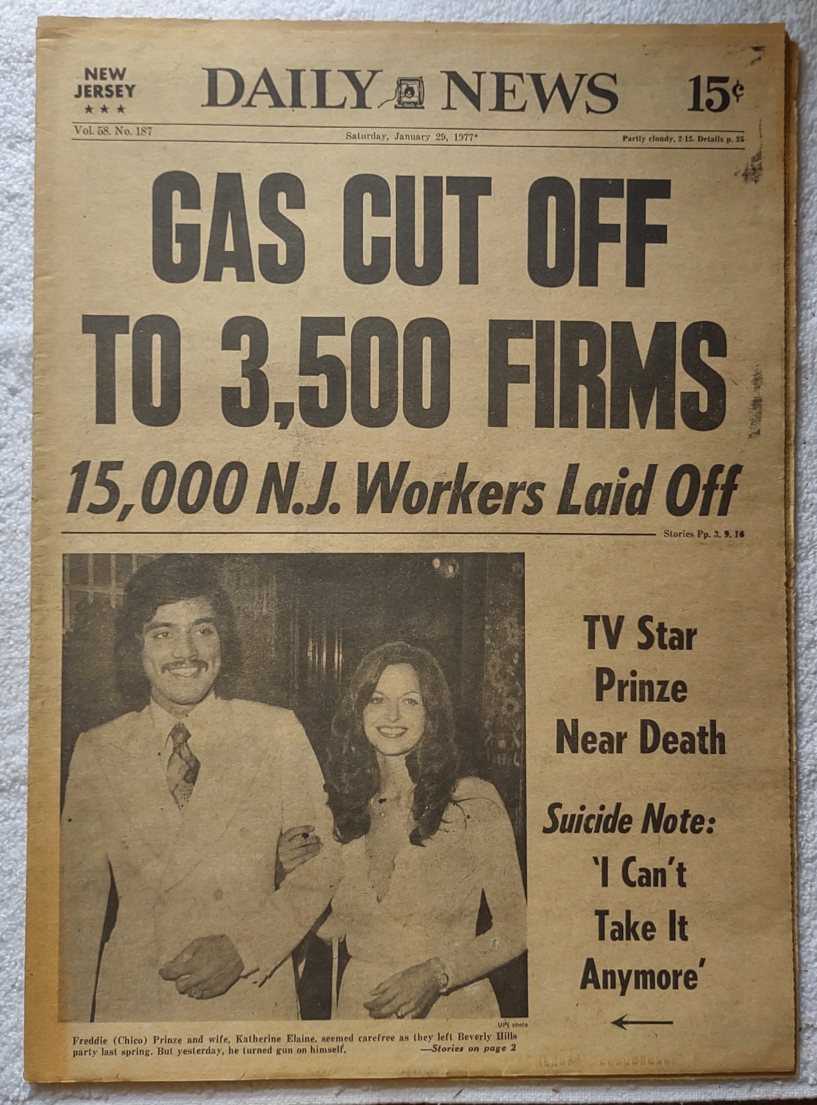 New York Daily News (New Jersey Edition) – Saturday, January 29, 1977. What you see in the pictures is what you get. This is a very interesting old newspaper which features as the front page story: Gas Cut Off to 3,500 Firms – 15,000 N.J. Workers Laid Off and ‘TV Star Prinze Near Death – Suicide Note: ‘I Can’t Take It Anymore’