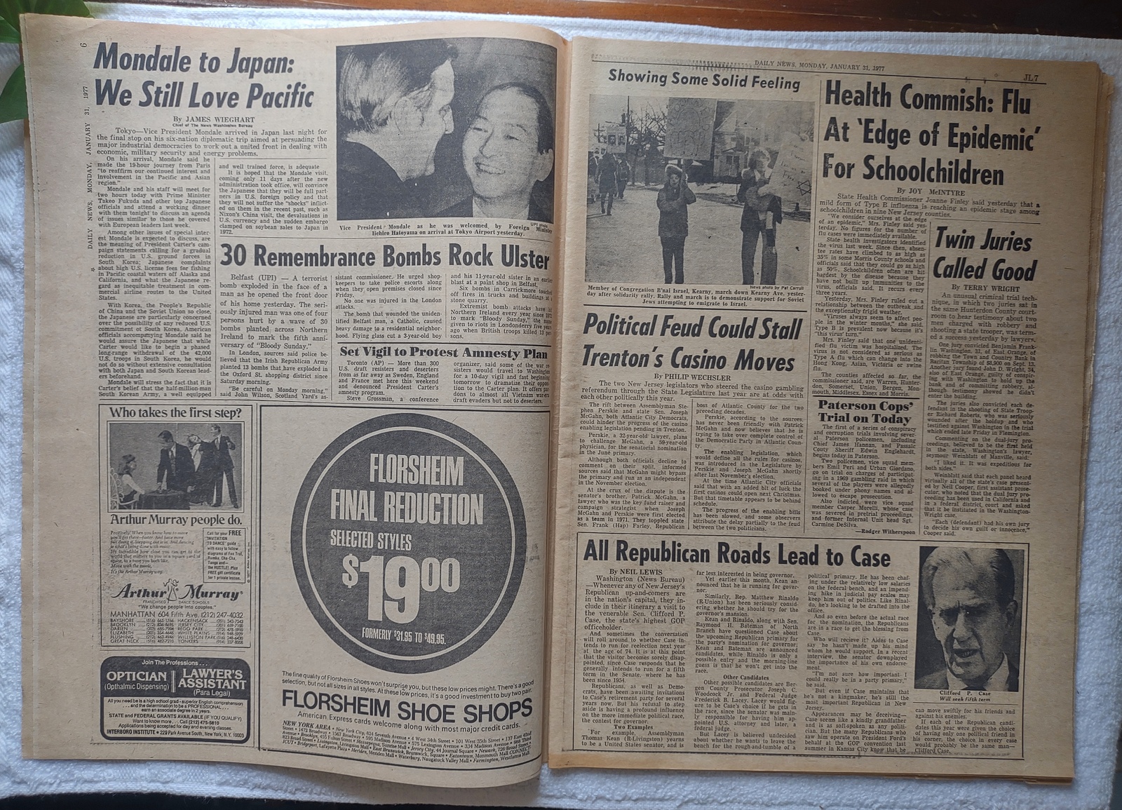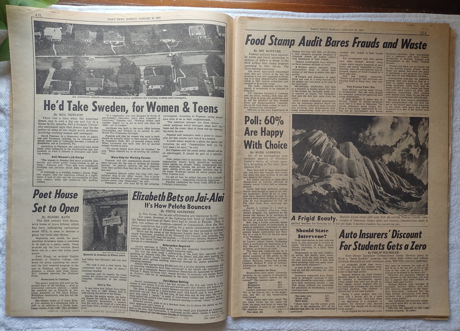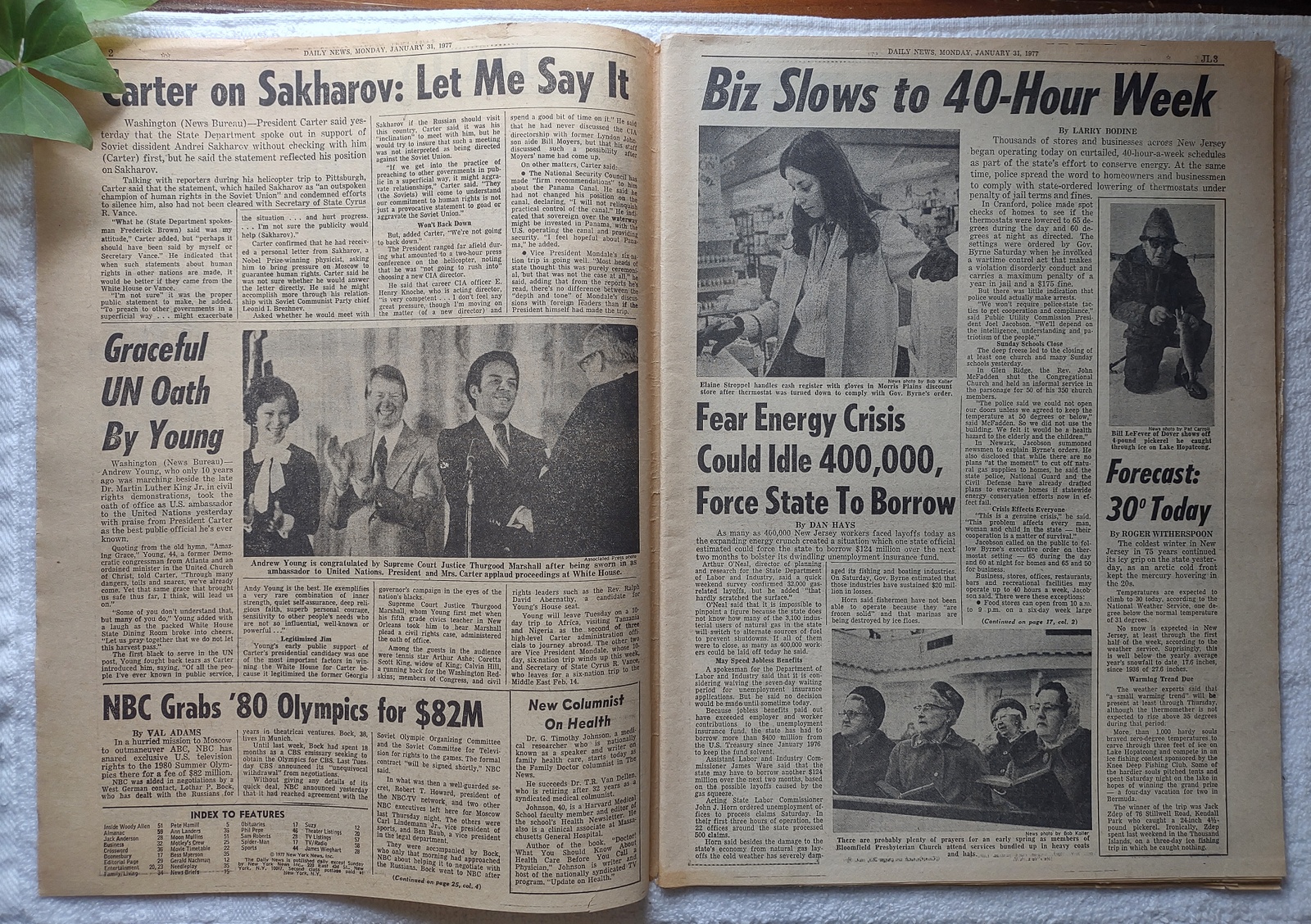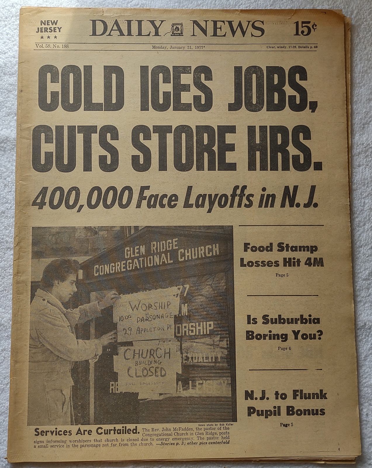 New York Daily News – New Jersey Edition – Monday, January 31, 1977. What you see in the pictures is what you get. This is a very interesting old newspaper which features as the front page story: ‘Cold Ices Jobs, Cuts Store Hrs. 400,000 Face Layoffs in N.J.