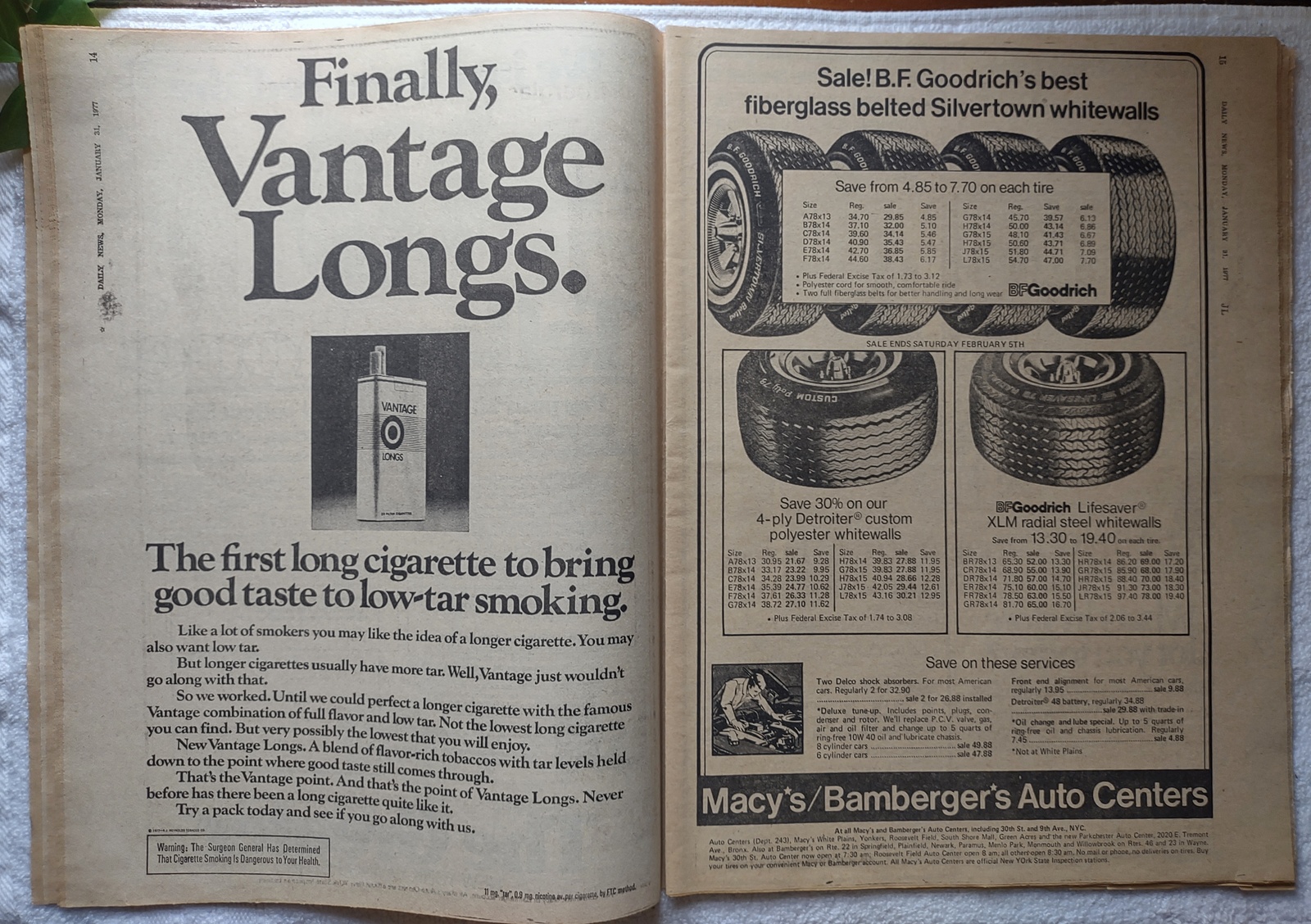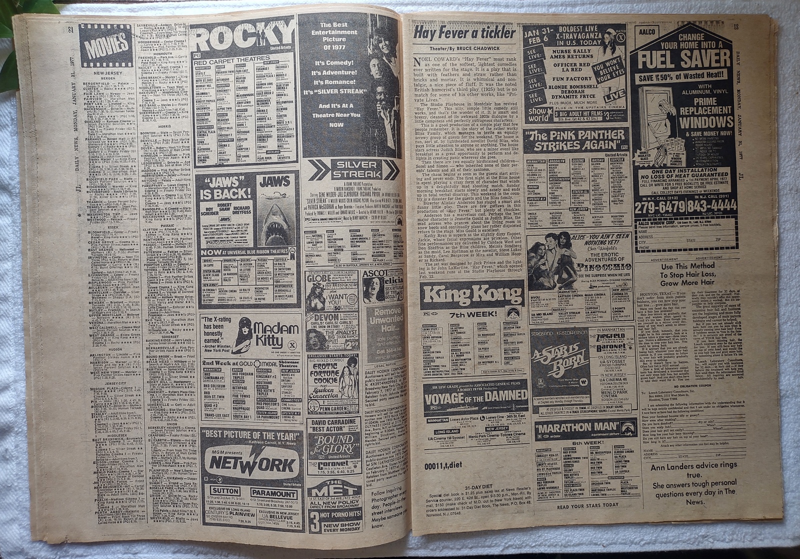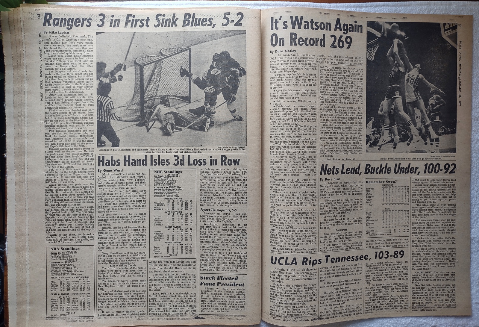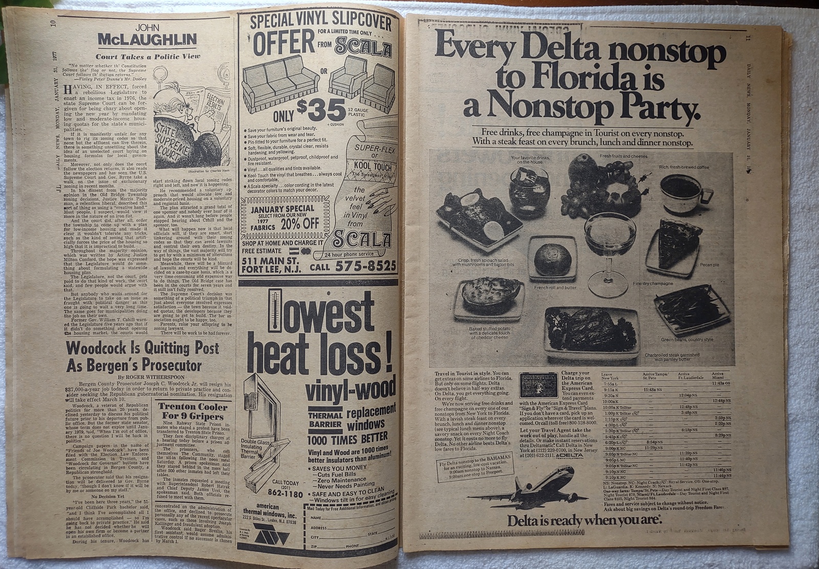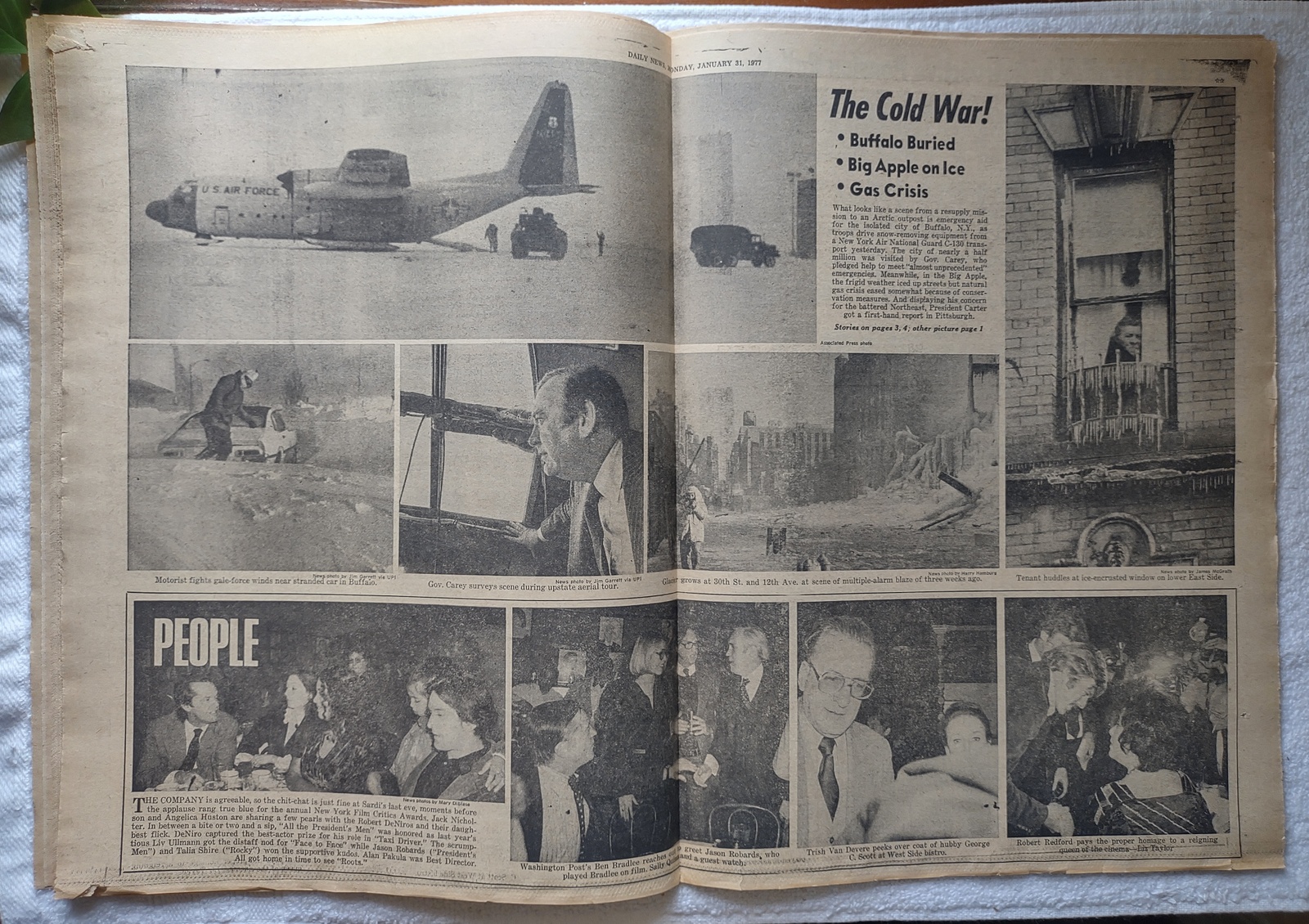 New York Daily News – New Jersey Edition – Monday, January 31, 1977. What you see in the pictures is what you get. This is a very interesting old newspaper which features as the front page story: ‘Cold Ices Jobs, Cuts Store Hrs. 400,000 Face Layoffs in N.J.