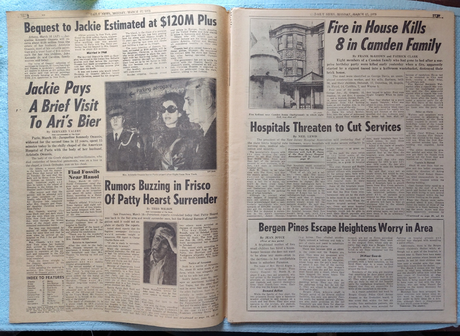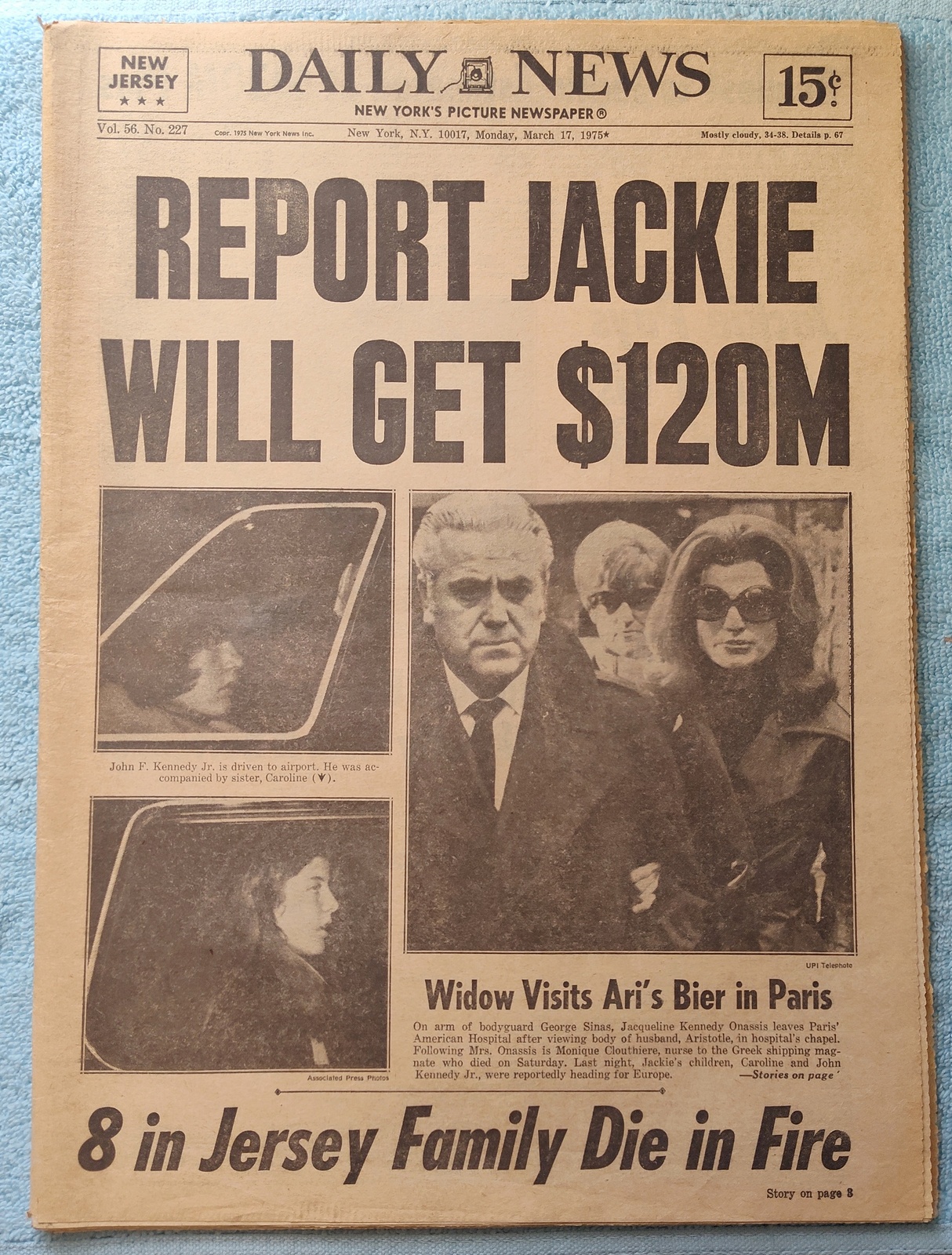 New York Daily News (New Jersey Edition) – Monday, March 17, 1975. This old newspaper features on the front page a picture of recently widowed Jackie Onassis after viewing her husband’s body as well as pictures of Caroline and John F. Kennedy Jr. being driven to the airport to join their mother in Paris. The headline is: ‘Report Jackie Will Get $120M’ What you see in the pictures is what you get.