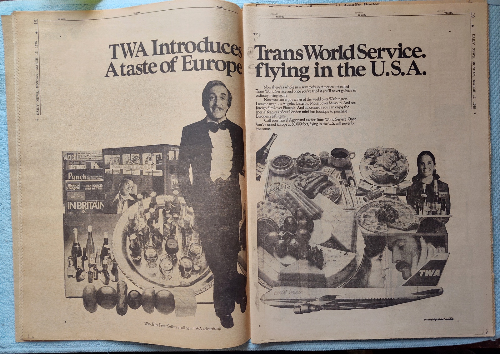 - TWA has a two-age ad for European style flying in the US: Trans World Service