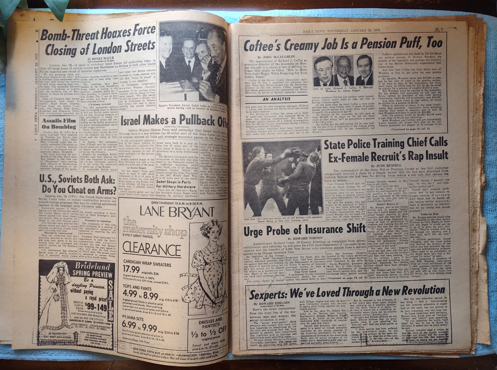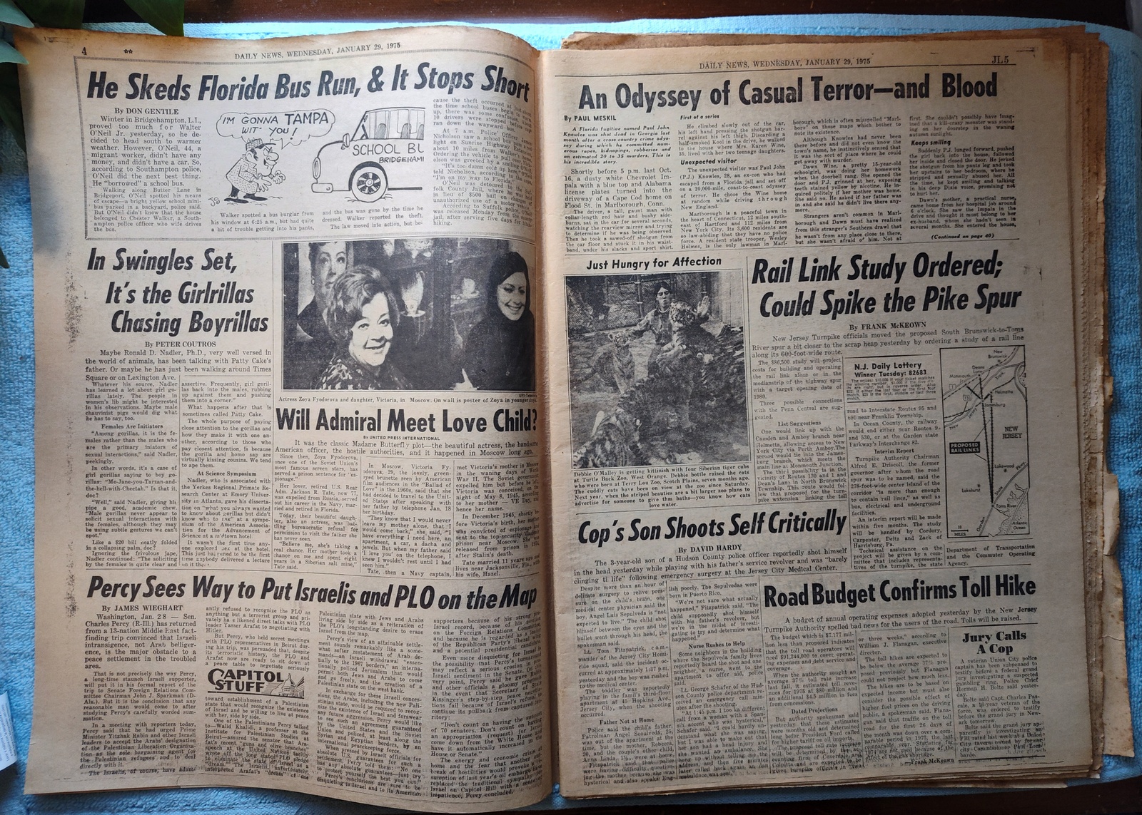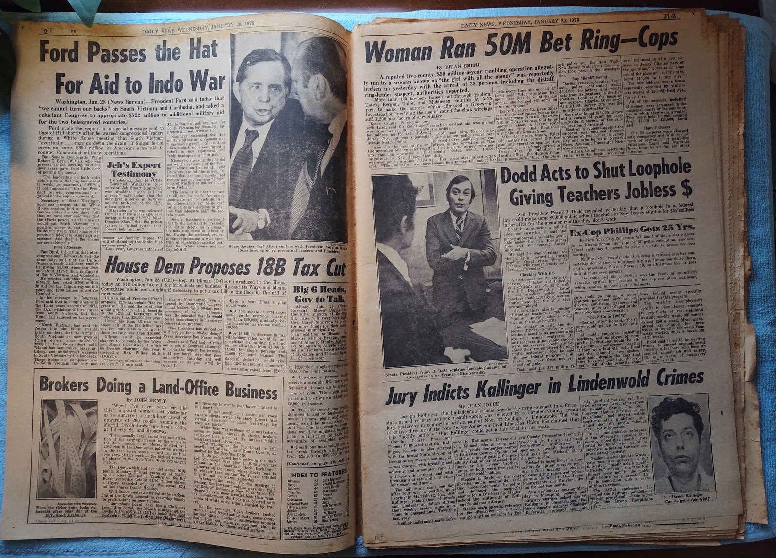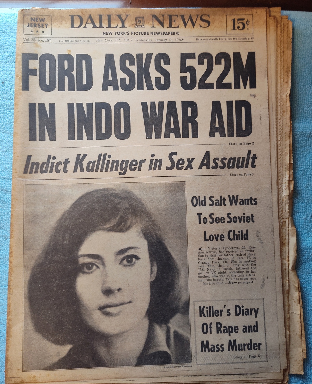New York Daily News (New Jersey Edition) – Wednesday, January 29, 1975. This old newspaper features on the front page a picture of Victoria Fyodorova – a Russian actress who wants to meet her father, Retired Navy Rear Admiral Jackson R. Tate – alleged to have been fathered on VE day. The headline is: ‘Ford Asks 522M In Indo War Aid’ and ‘Indict Kallinger in Sex Assault’ What you see in the pictures is what you get.