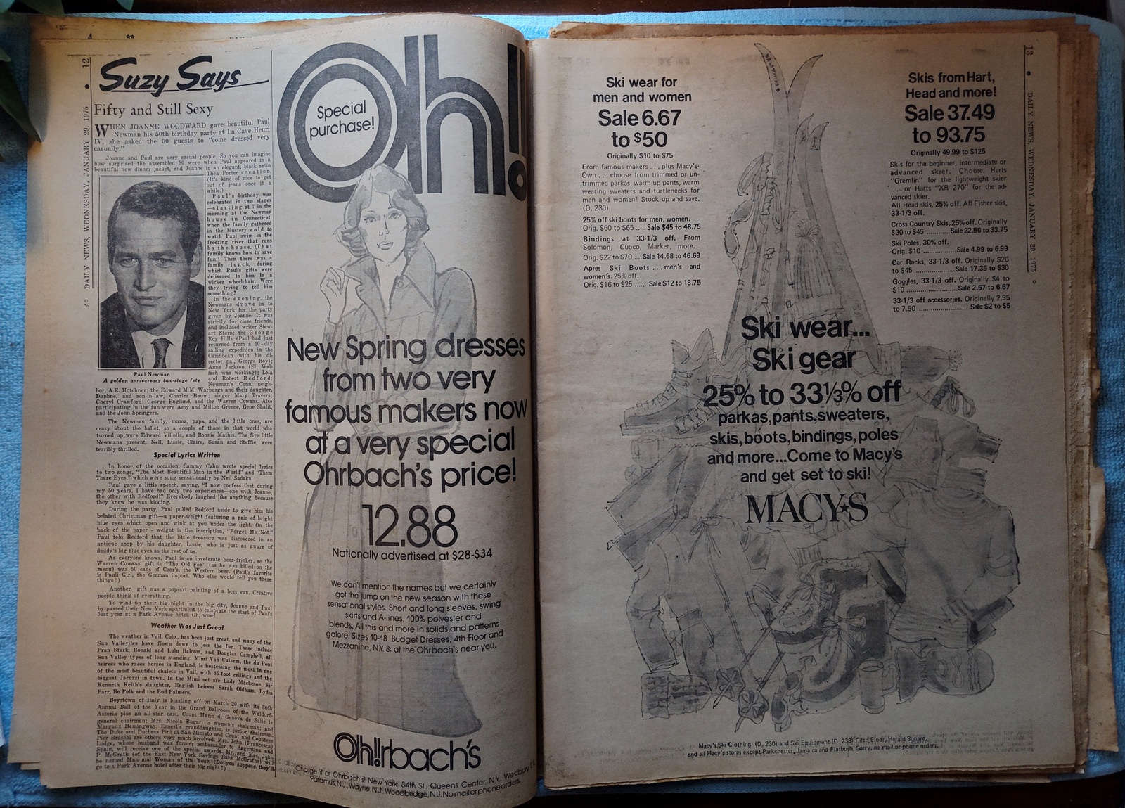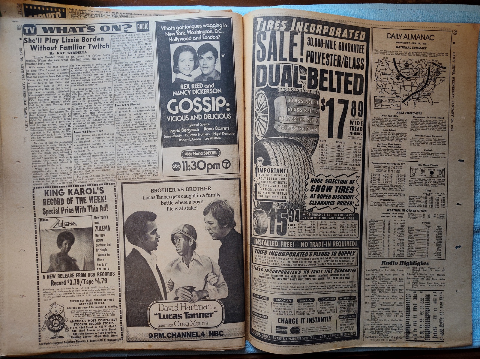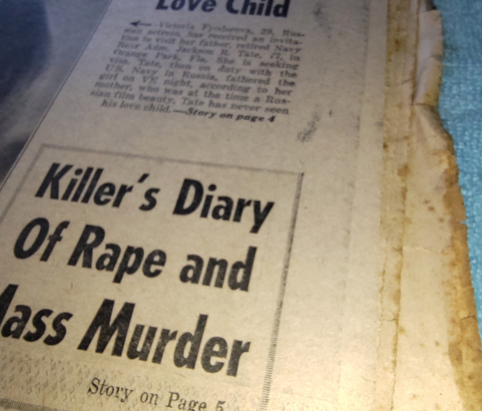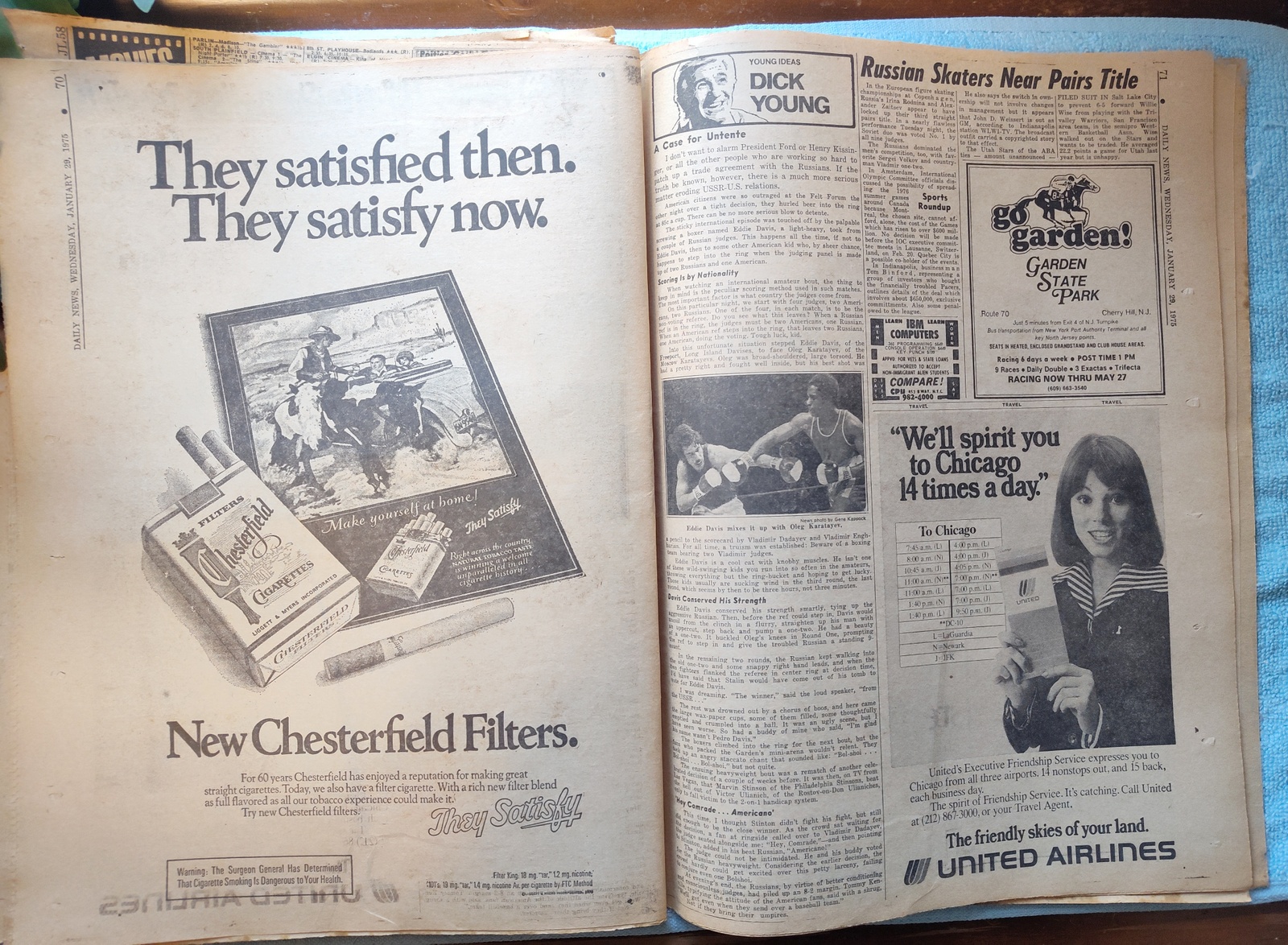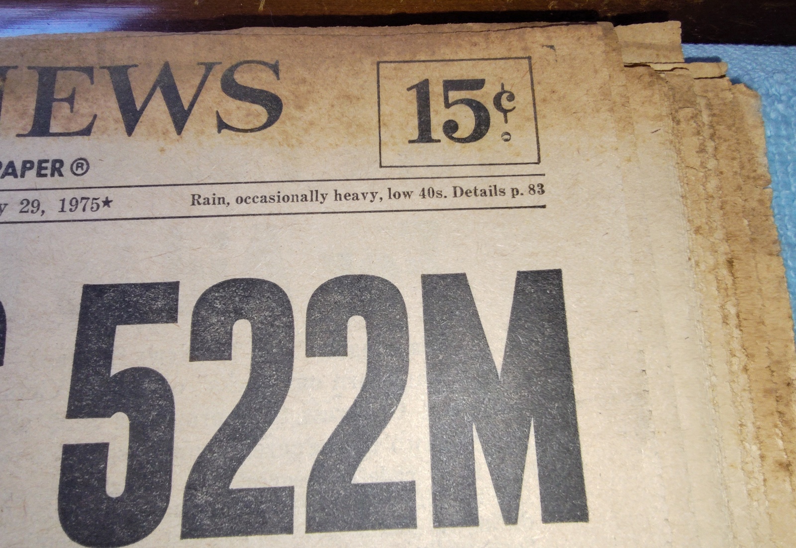 New York Daily News (New Jersey Edition) – Wednesday, January 29, 1975. This old newspaper features on the front page a picture of Victoria Fyodorova – a Russian actress who wants to meet her father, Retired Navy Rear Admiral Jackson R. Tate – alleged to have been fathered on VE day. The headline is: ‘Ford Asks 522M In Indo War Aid’ and ‘Indict Kallinger in Sex Assault’ What you see in the pictures is what you get.