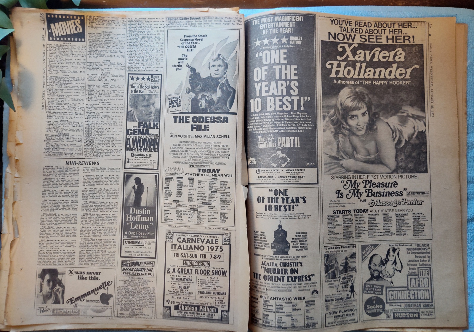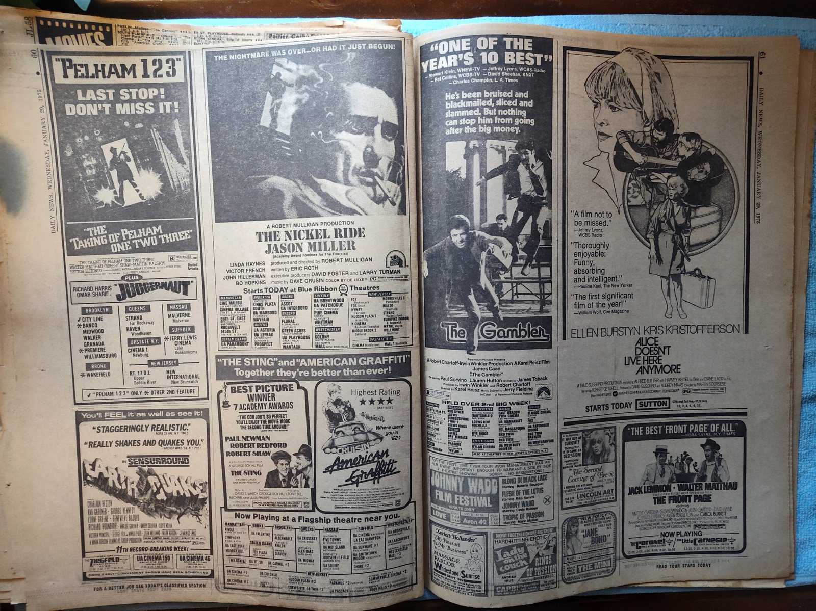 - There are movie ads for The Street Fighter, Young Frankenstein, Mr. Ricco, The Odessa File, The Front Page with Walter Matthau and Jack Lemmon, Earthquake, Alice Doesn’t Live Here Anymore, and more!