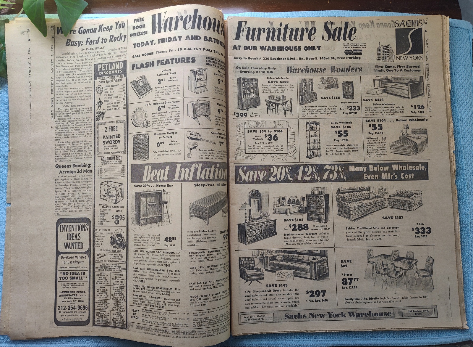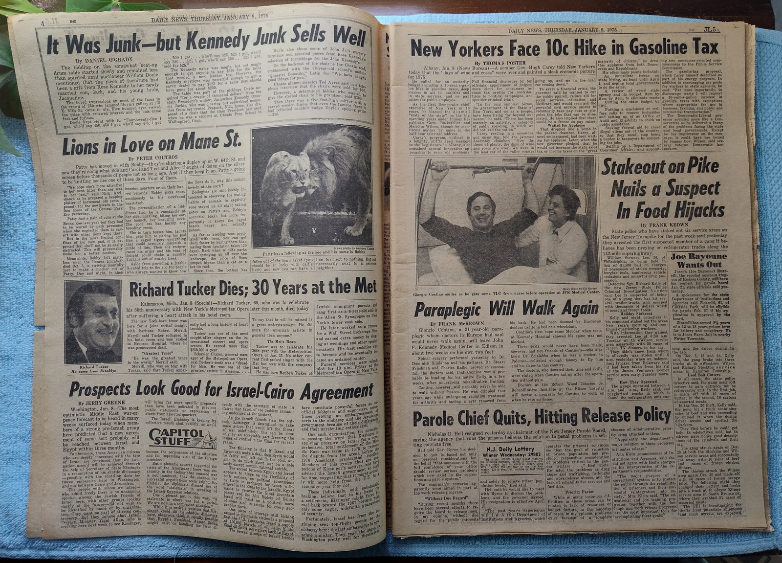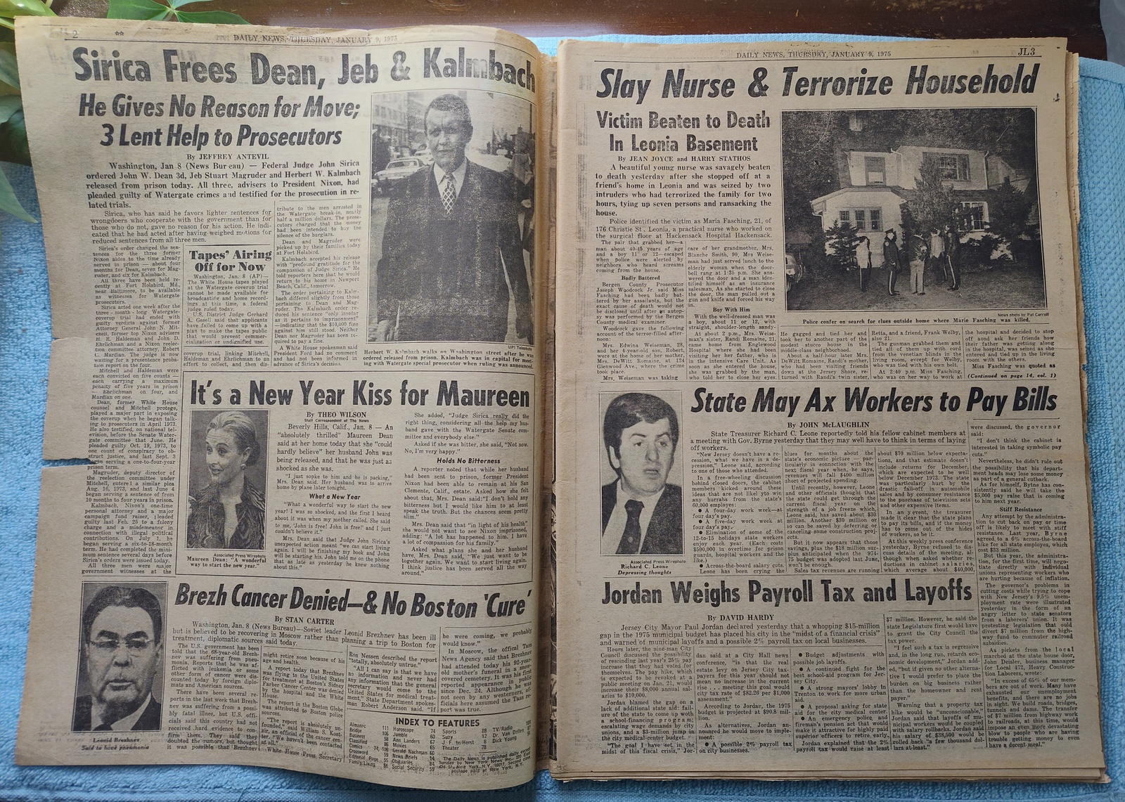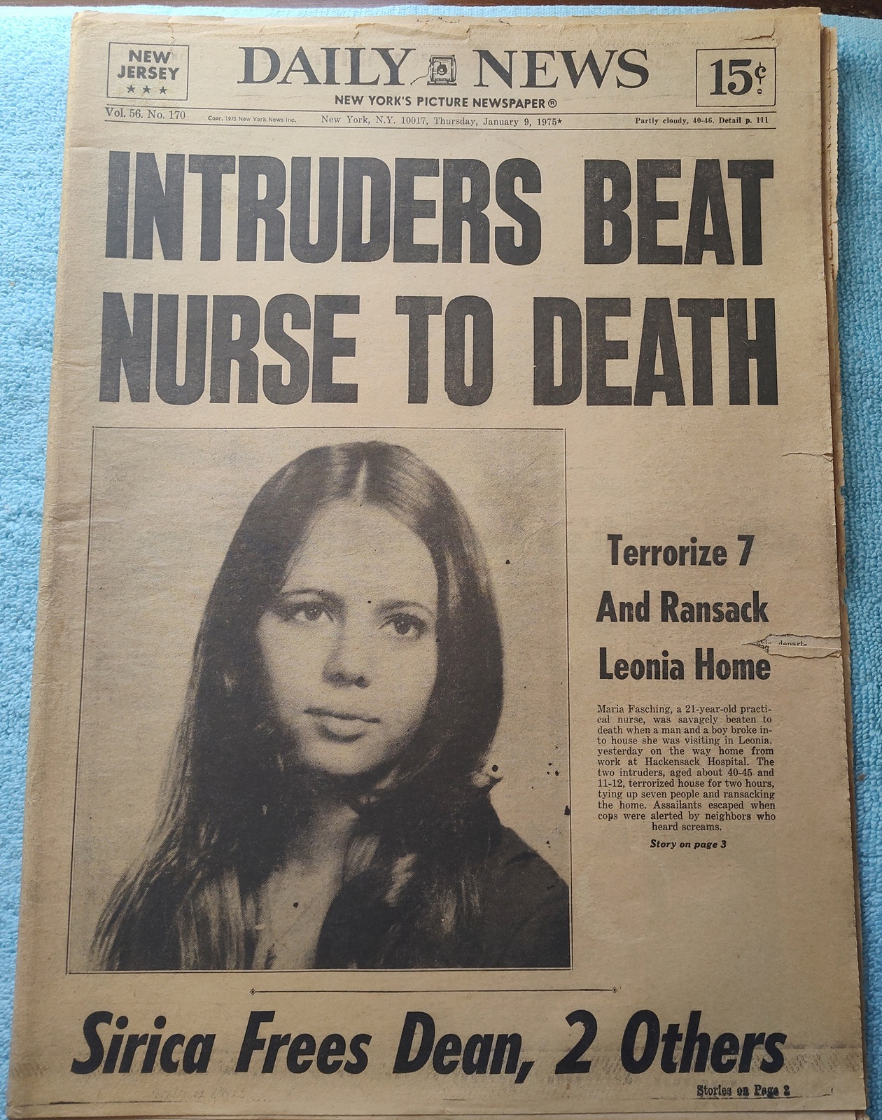 New York Daily News (New Jersey Edition) – Thursday, January 9, 1975. This old newspaper features on the front page a picture of murder victim Maria Fasching. The headline is: ‘Intruders Beat Nurse To Death’ and ‘Terrorize 7 And Ransack Leonia Home’ Fasching was one of the victims of serial killer Joseph Kallinger. What you see in the pictures is what you get.