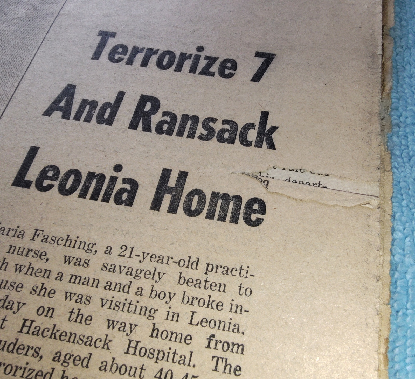 - ‘Slay Nurse & Terrorize Household – Victim Beaten to Death In Leonia Basement’ – Some of the first information released about the killing of Maria Fasching by Joseph Kallinger who had his son along with him.